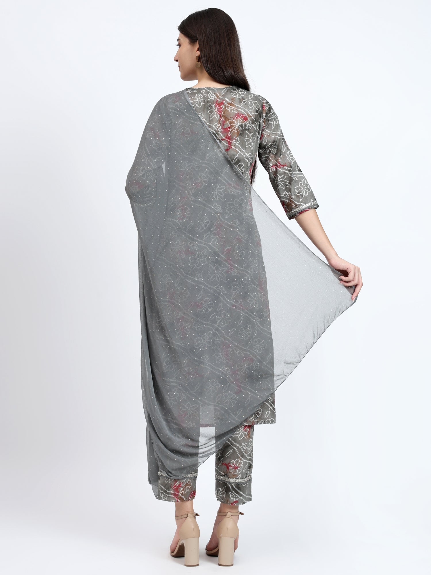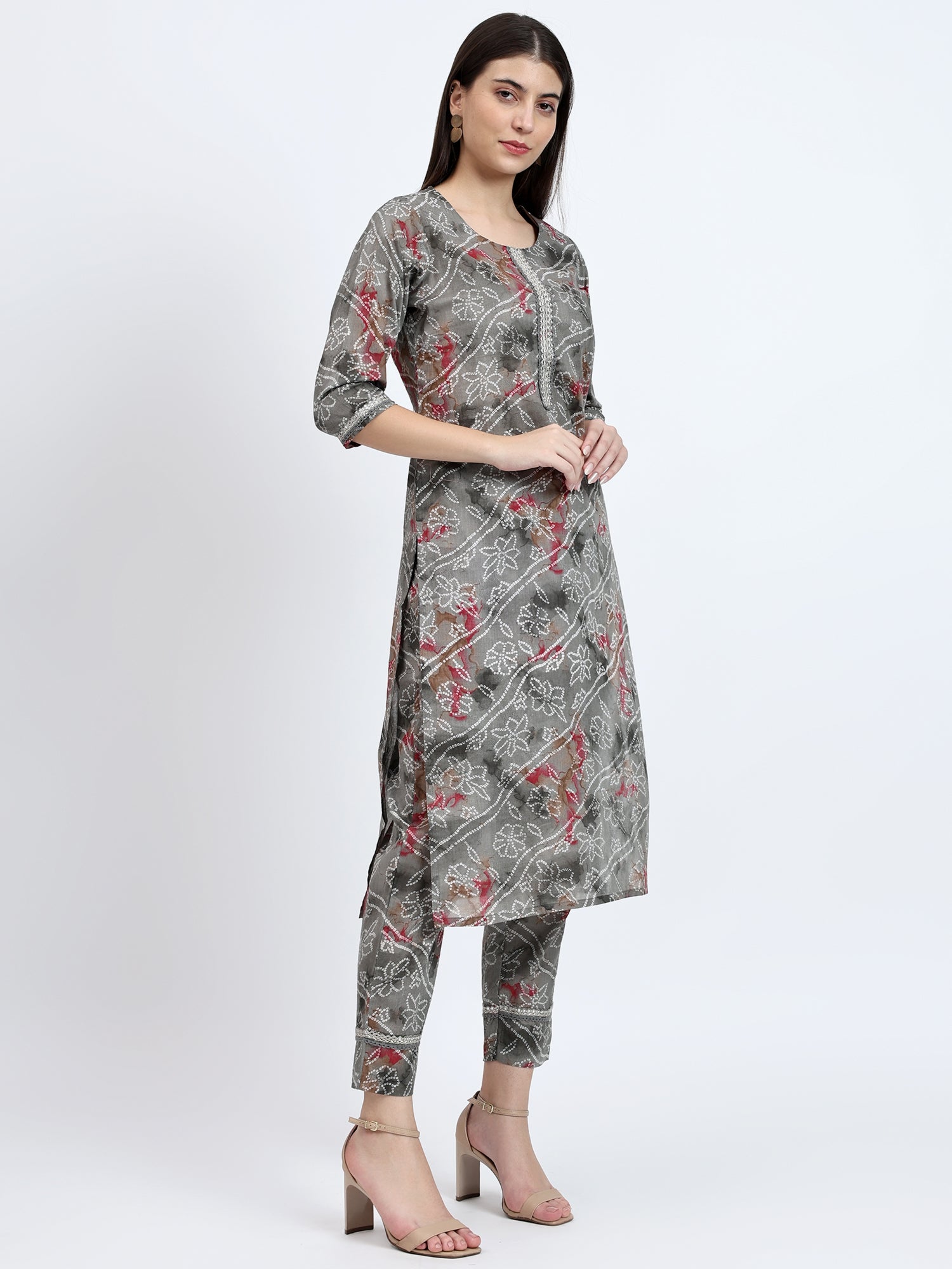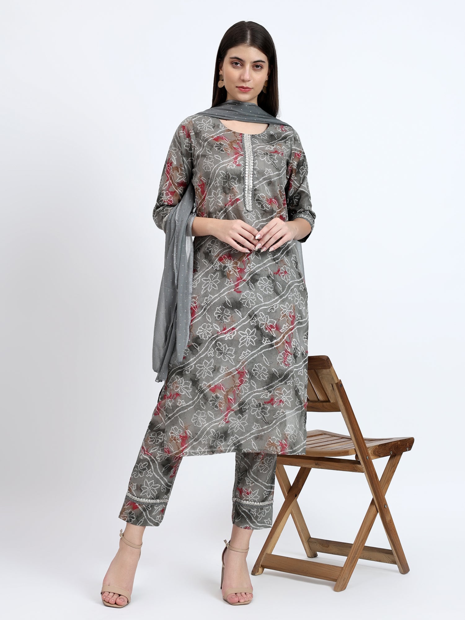 The kurta, crafted from lightweight mulmul, features a timeless grey base adorned with an intricate bandhej print. Its round neckline and straight cut offer a classic and comfortable fit. Delicate embroidery on the yoke, sleeves, and pants adds a touch of sophistication to the set.