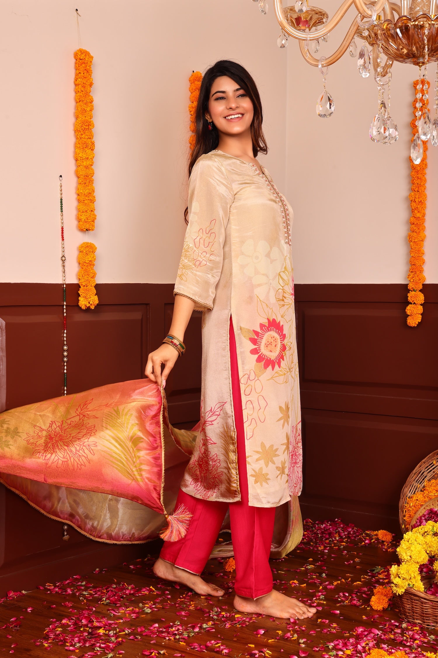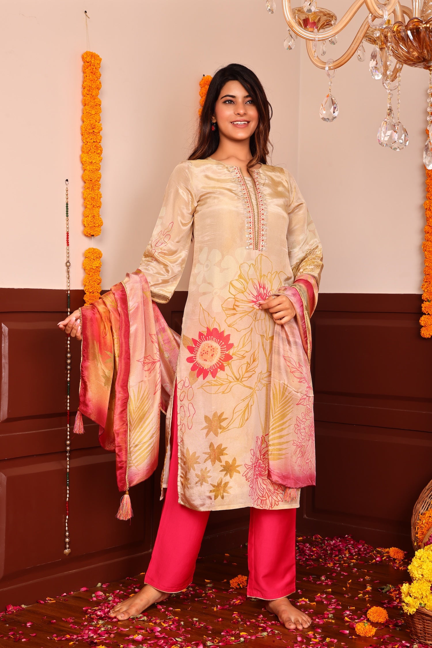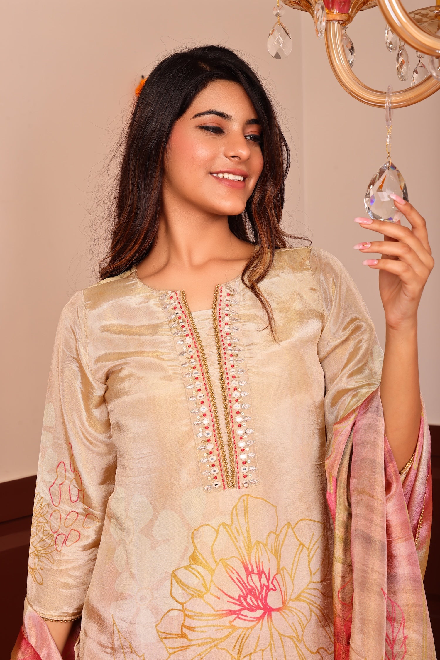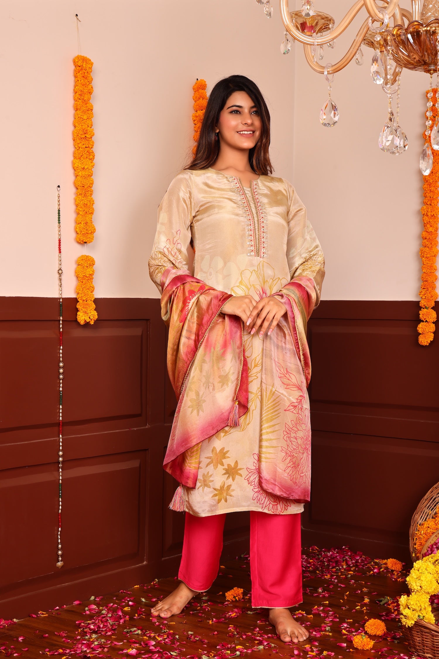 Celebrate the beauty of Indian heritage with our Ethnic Beige Floral Printed Tissue Shimmer Kurta, Pant, and Dupatta Set, a perfect blend of elegance and festive charm. Crafted from luxurious tissue silk, this stunning set radiates a soft shimmer that adds a touch of sophistication to any special occasion.