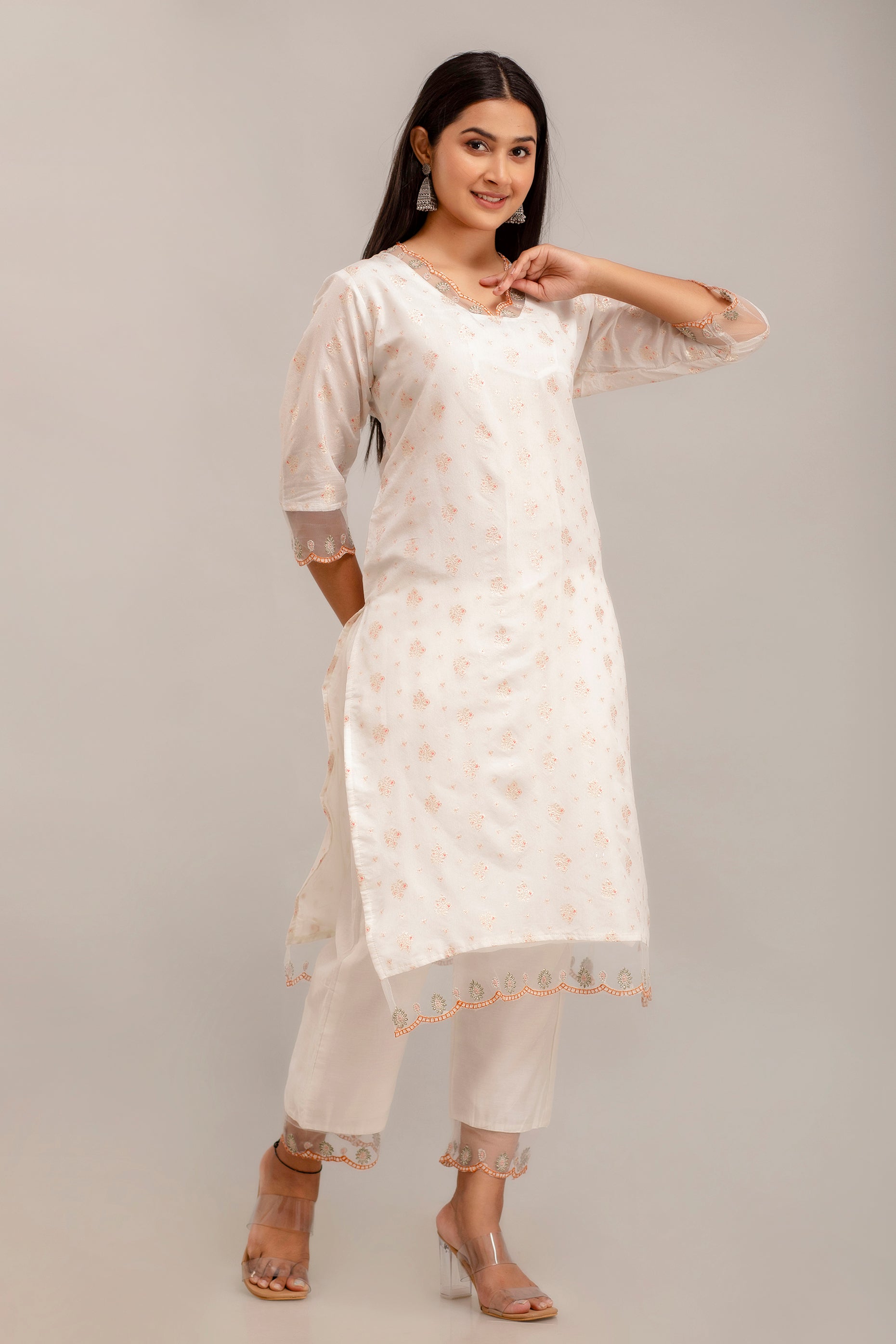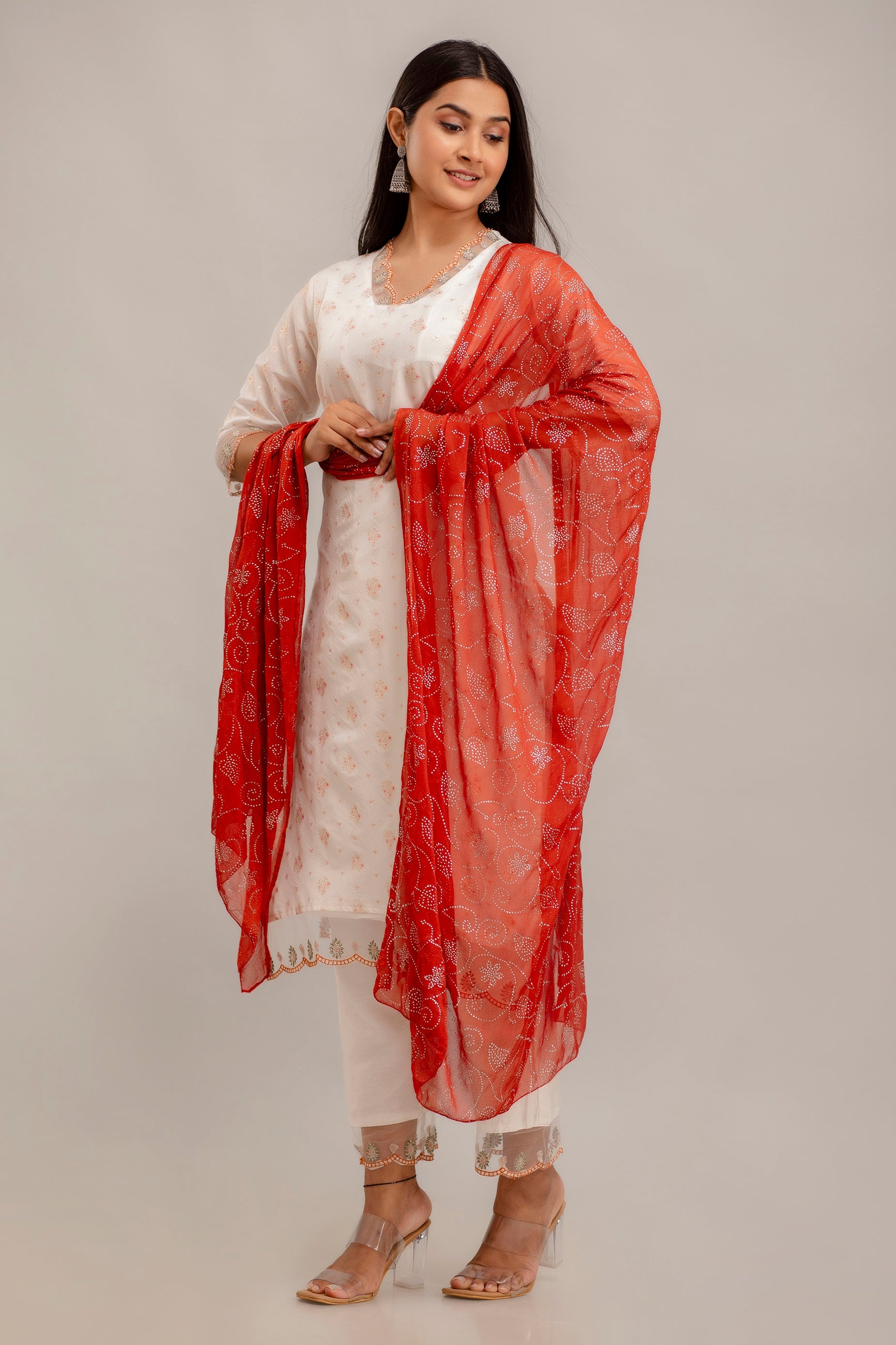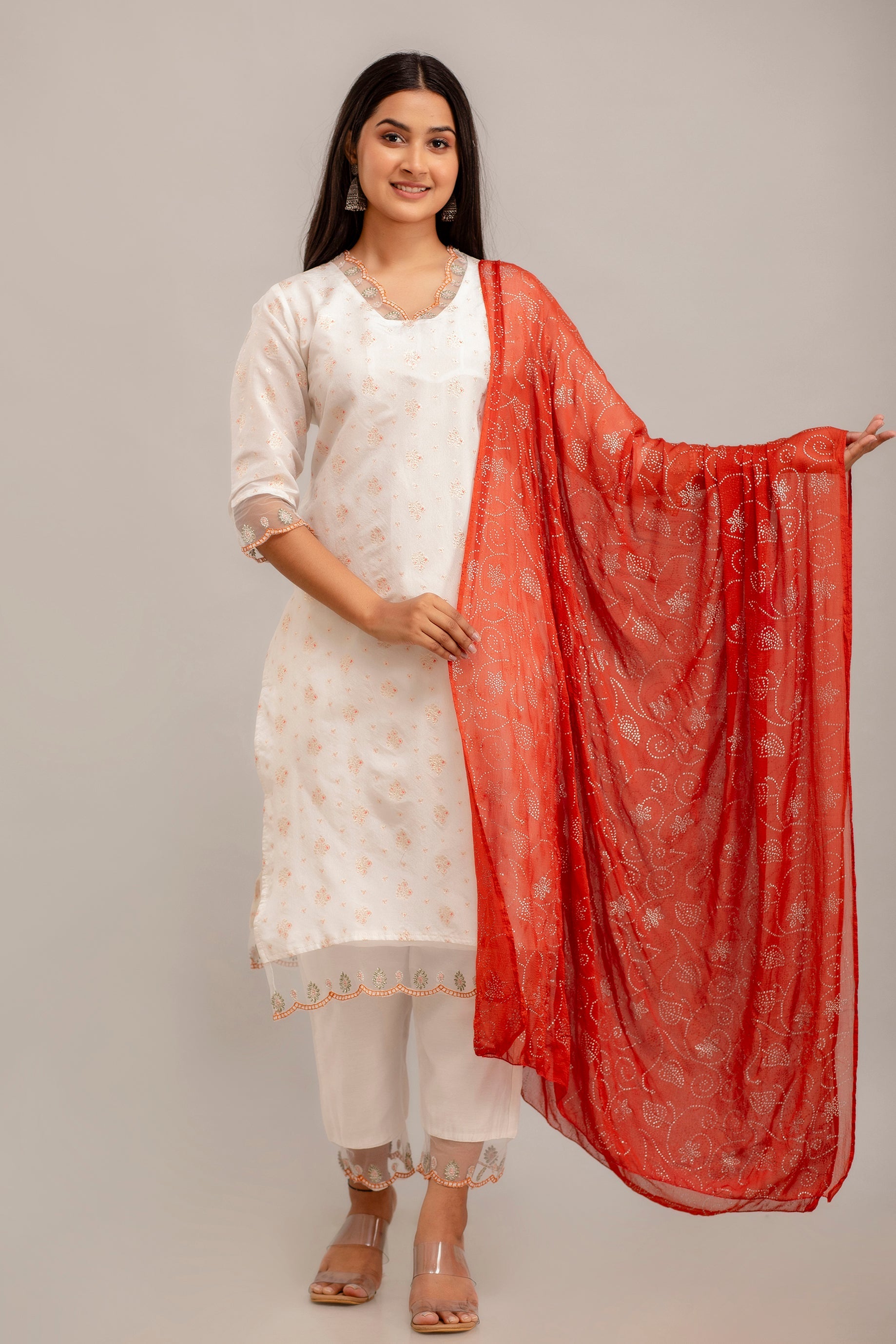 Radiate a touch of ethereal elegance at your next festive event with the Off-White Chanderi Kurta Cotton Pant Dupatta Set. This exquisite 3-piece set combines timeless elegance with modern sophistication.