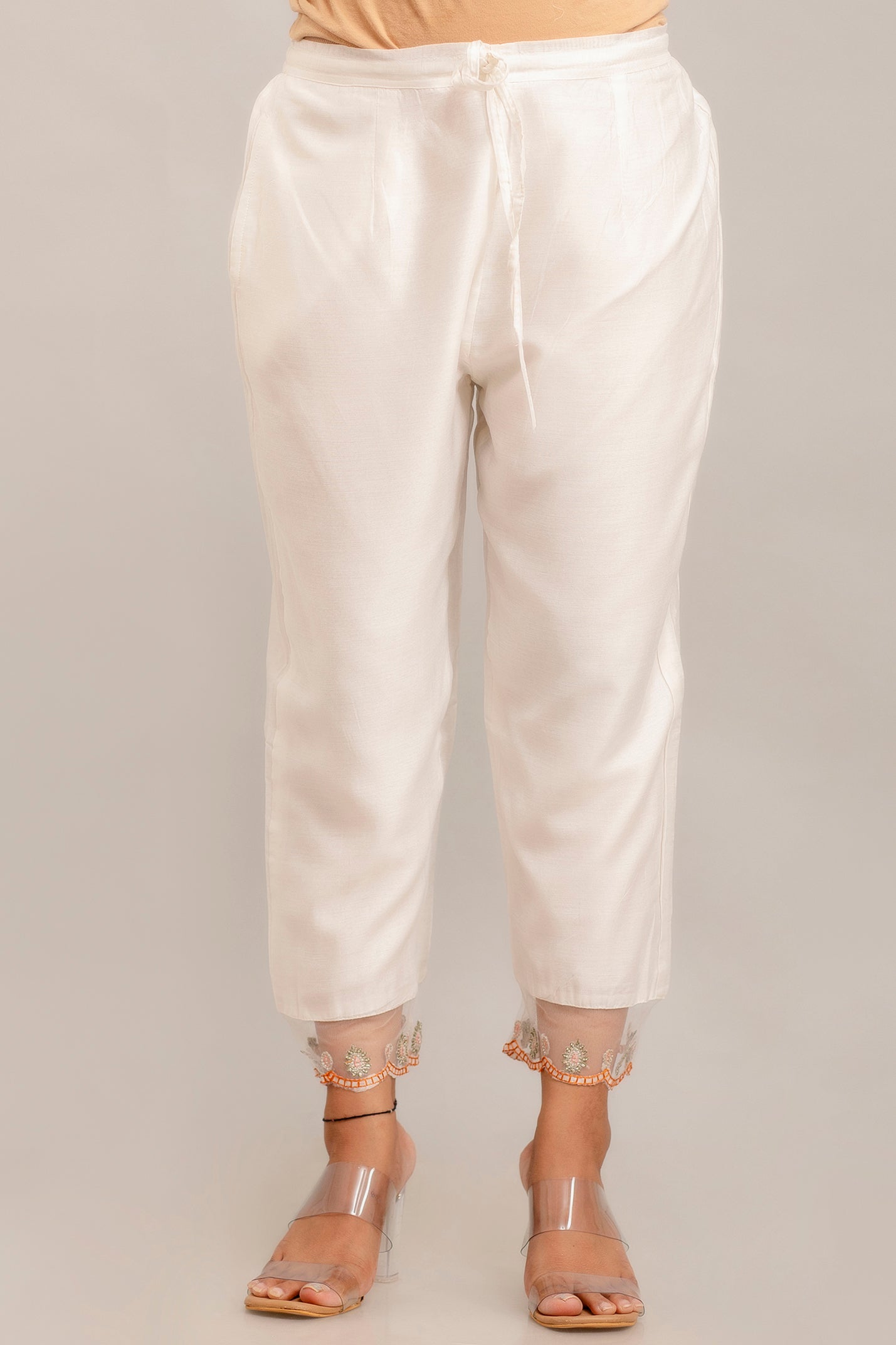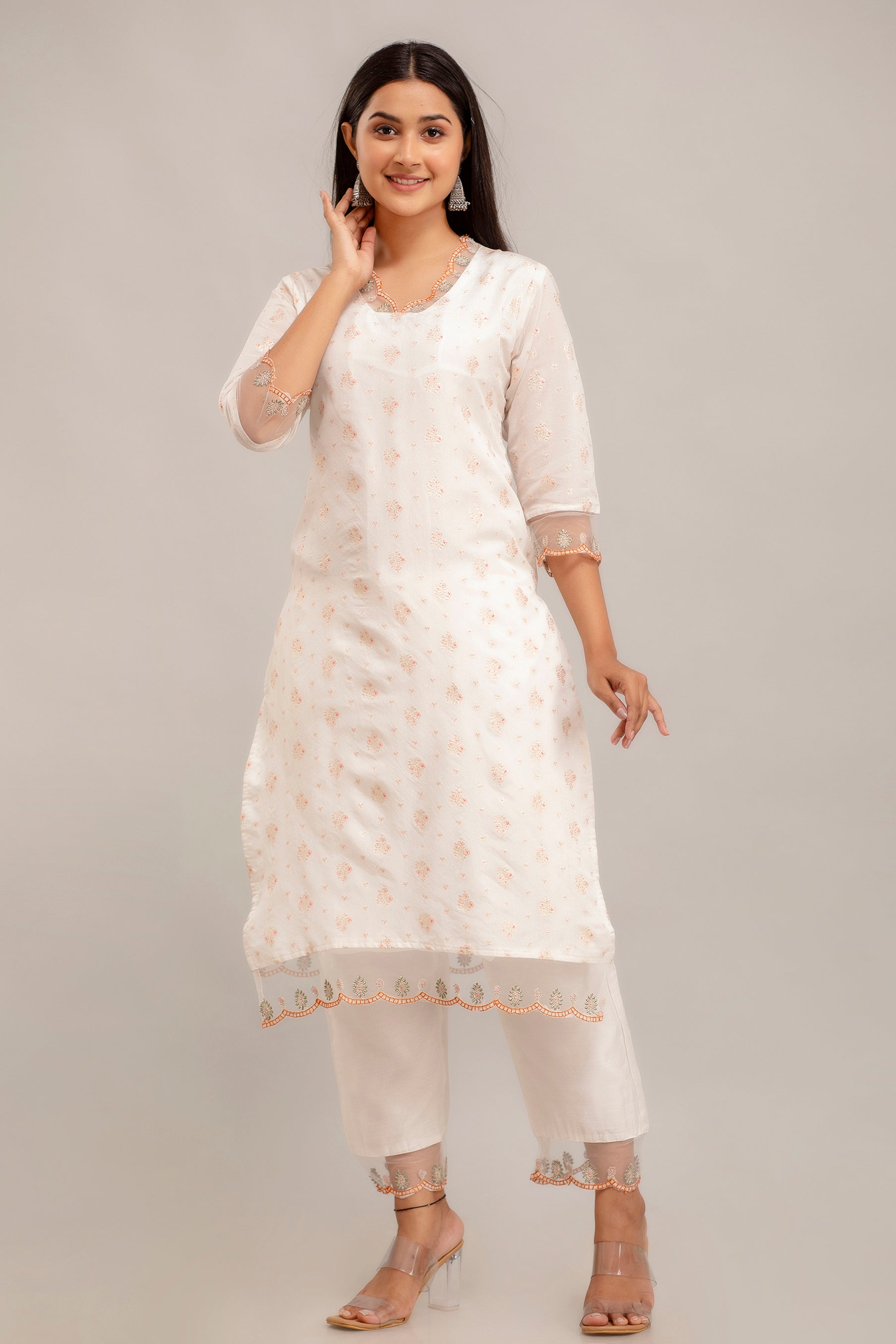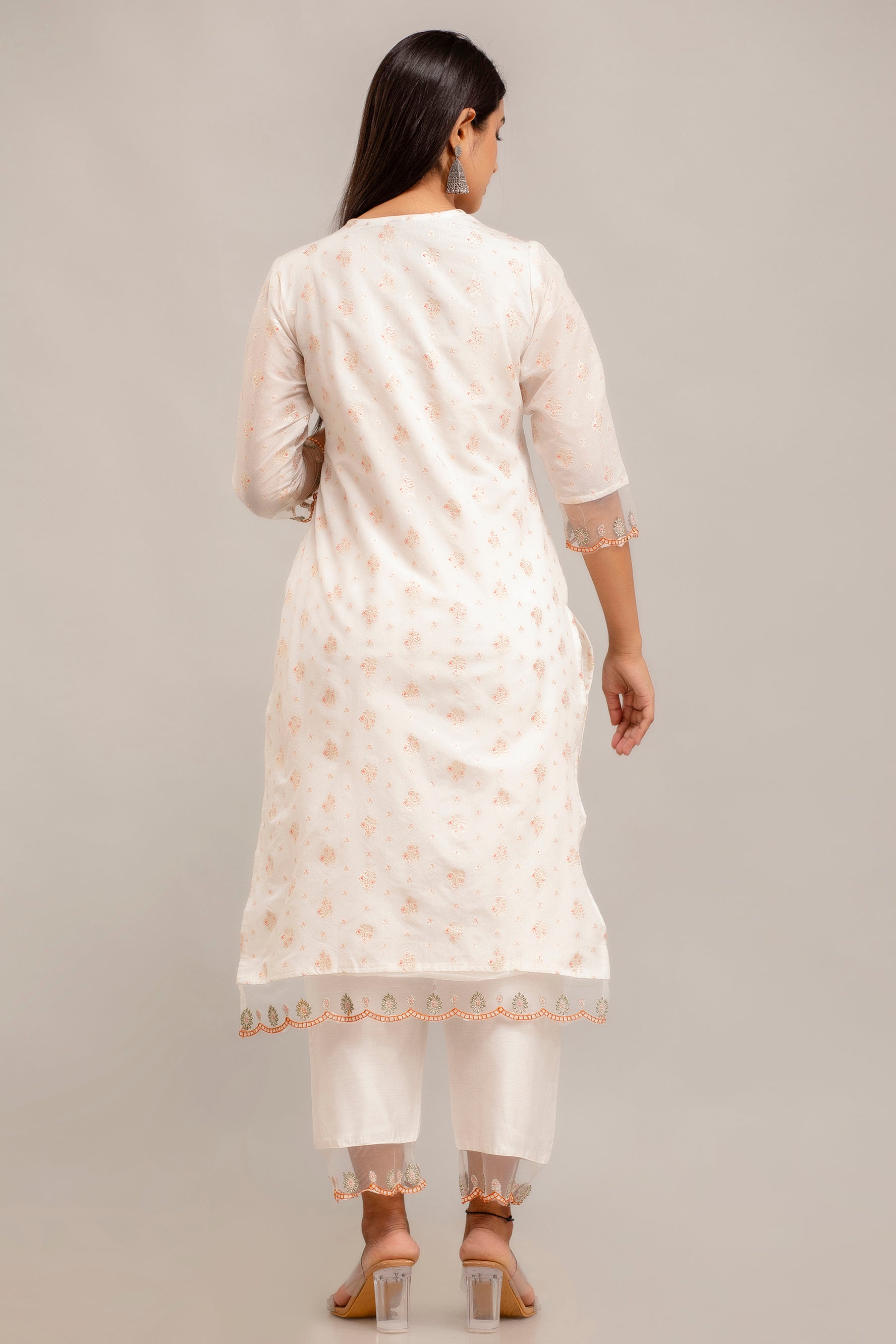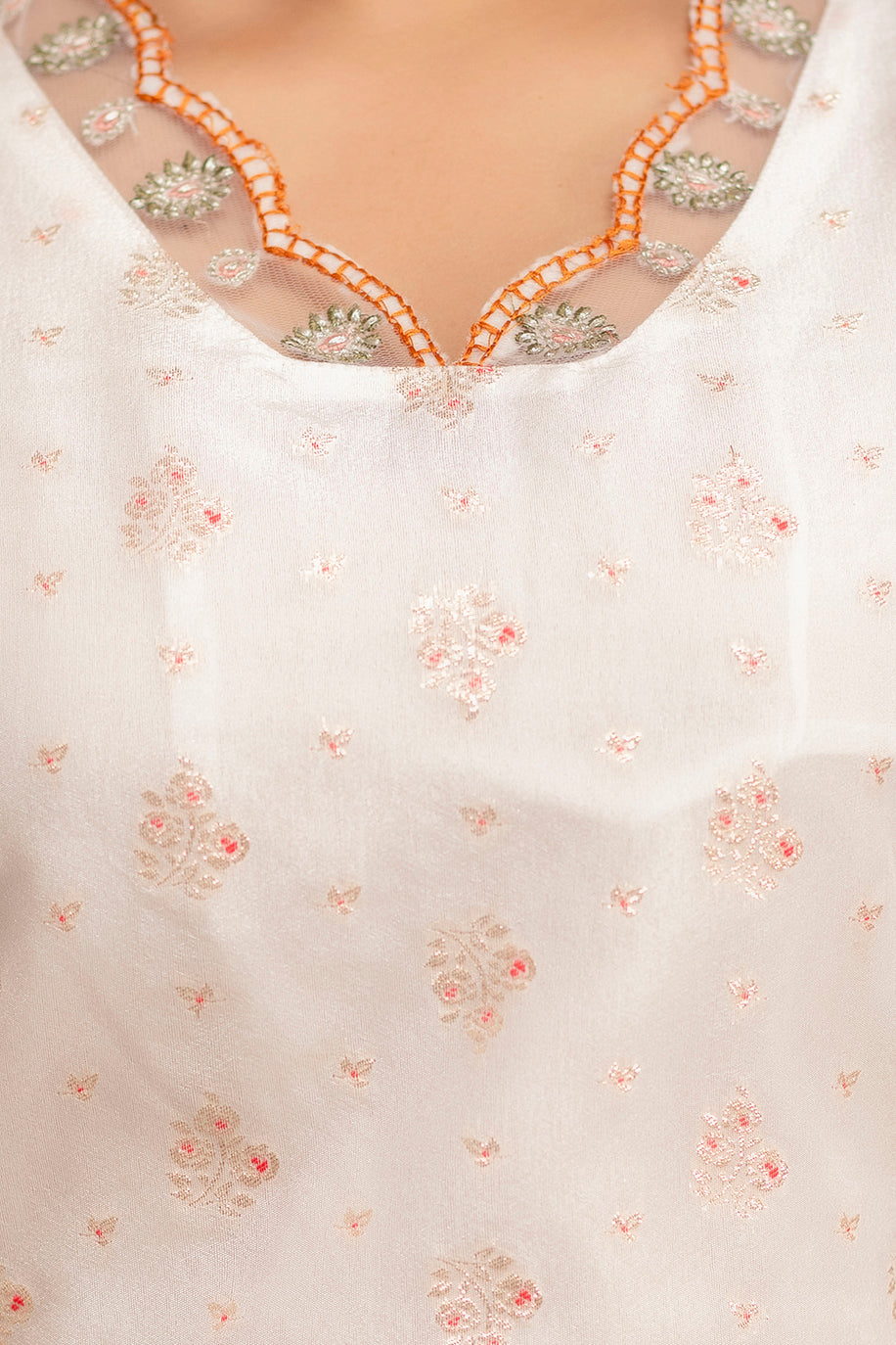 Radiate a touch of ethereal elegance at your next festive event with the Off-White Chanderi Kurta Cotton Pant Dupatta Set. This exquisite 3-piece set combines timeless elegance with modern sophistication.