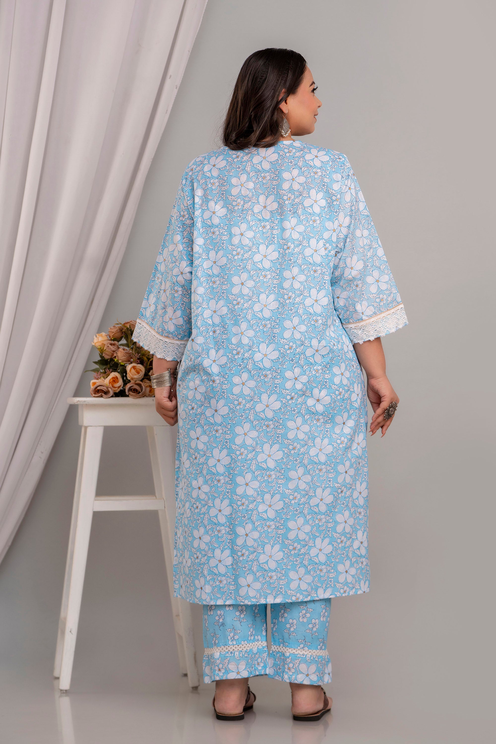 The kurta features a beautiful procion print, with simple straight cut & a round neckline adorned with delicate crochet lace work, adding a touch of charm and sophistication. Paired with matching straight pants, it offers a relaxed and effortlessly stylish look.
