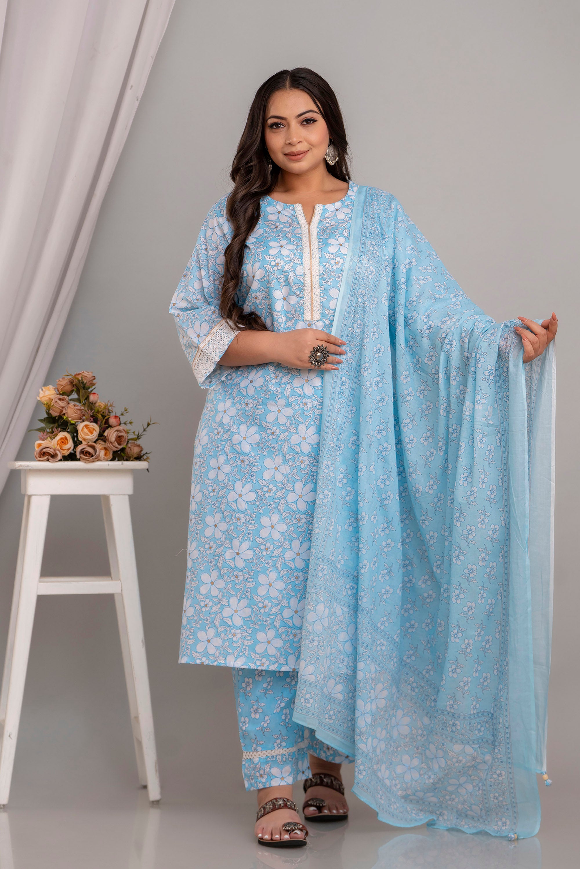 Experience the effortless elegance in our Sky Blue Cotton 3 piece Kurta Set, a refreshing choice for your ethnic wardrobe. Crafted from 100% cotton, this set offers unmatched comfort and breathability, perfect for the warmer days when you want to stay cool and stylish.
