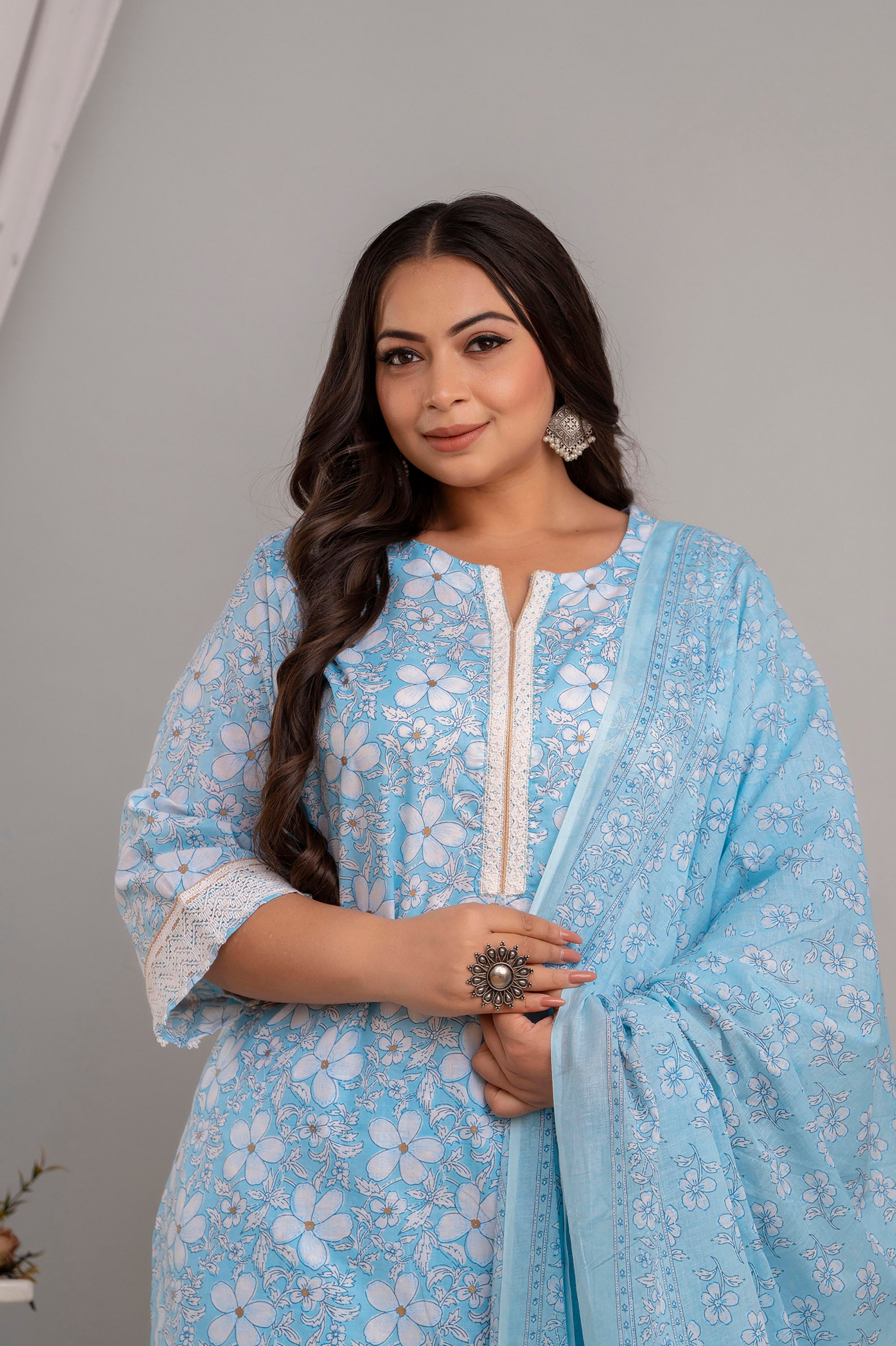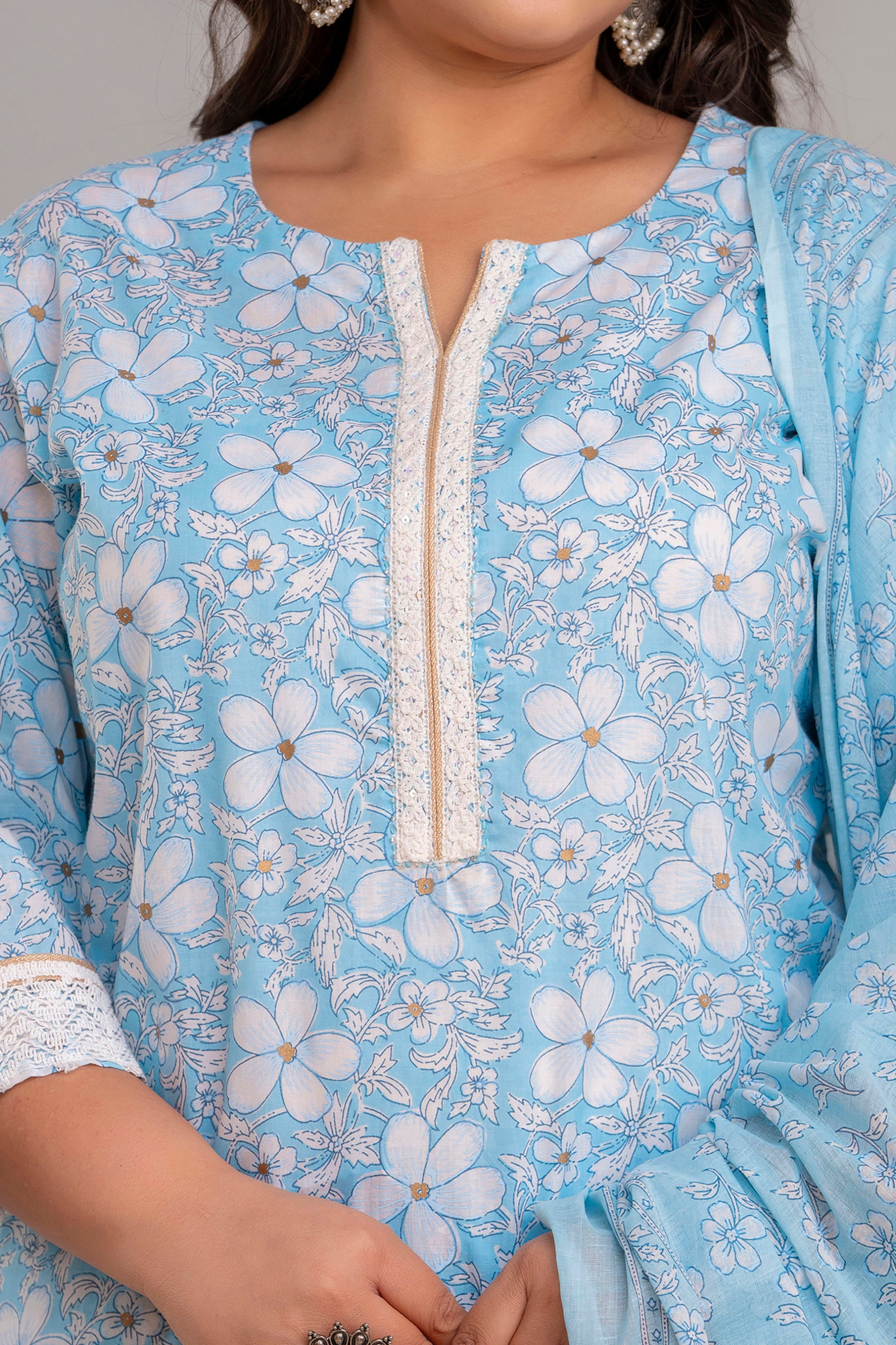 The set is finished off with a beautiful dupatta that adds a playful pop of color and graceful finish. The soothing sky blue color brings a serene and calming vibe to your look, making it ideal for both casual and festive occasions.
