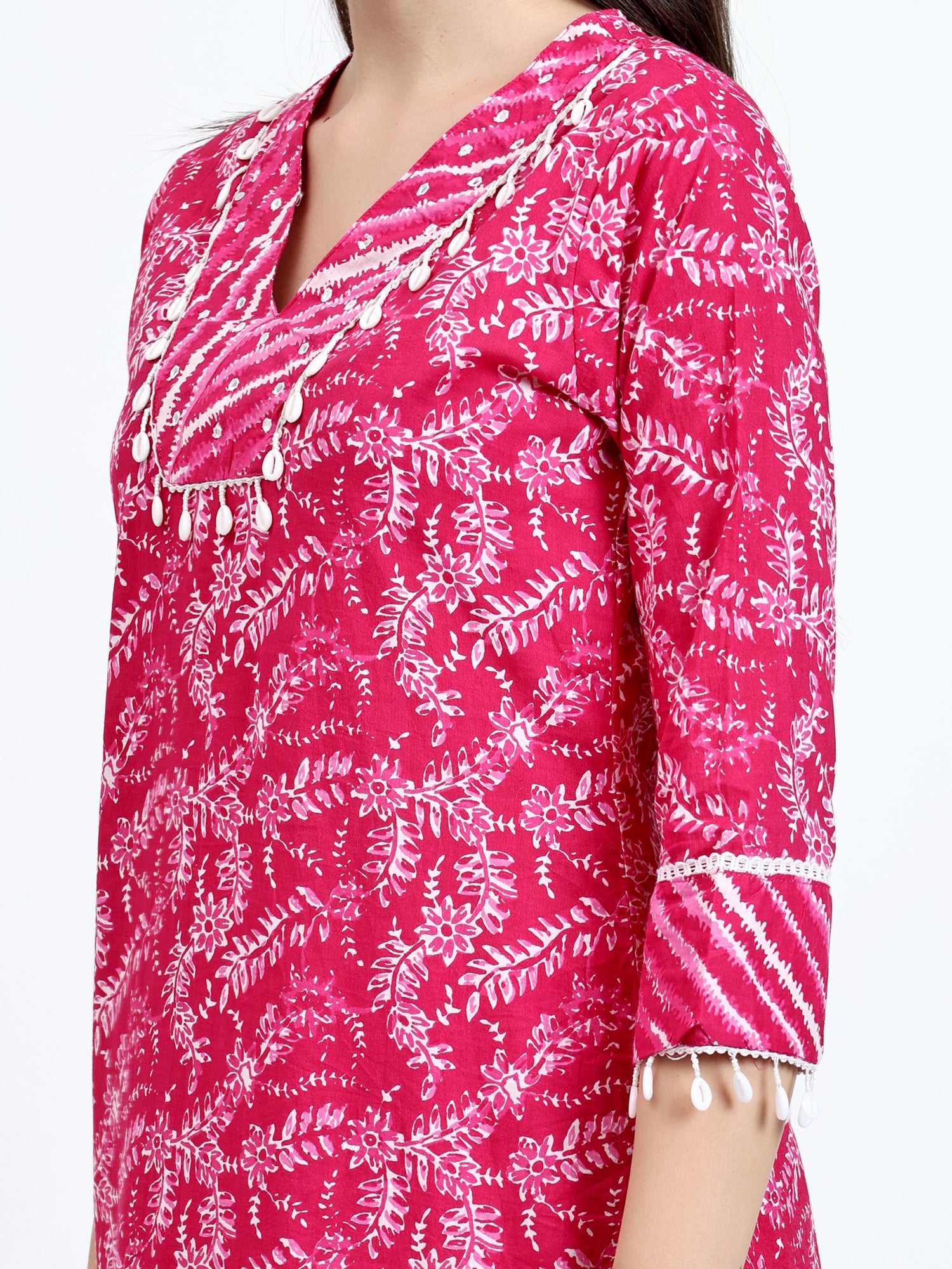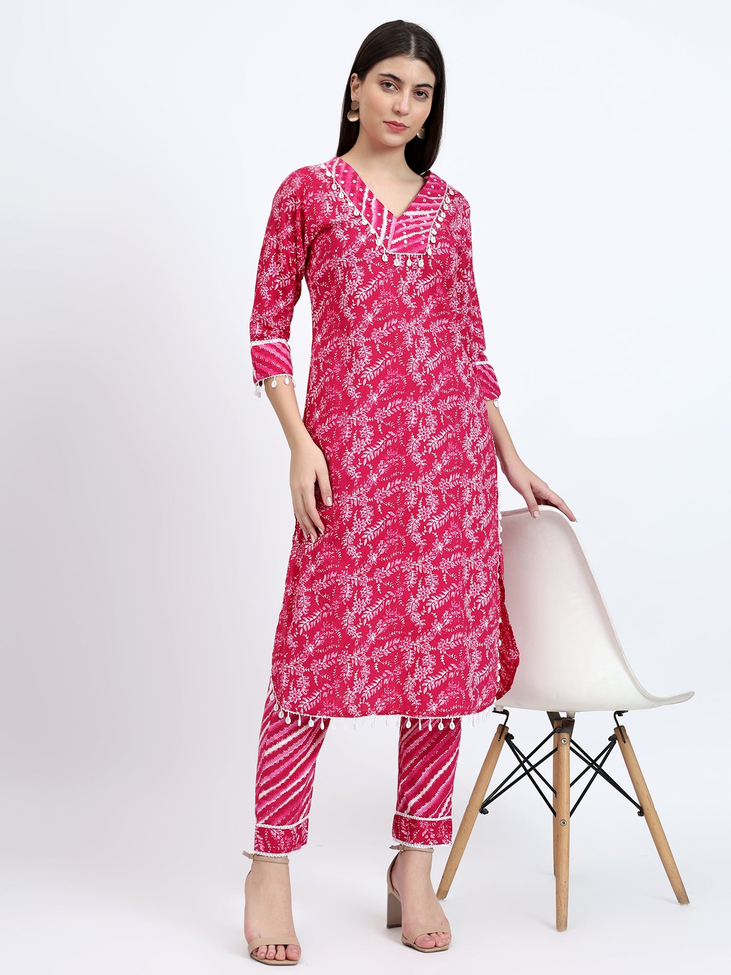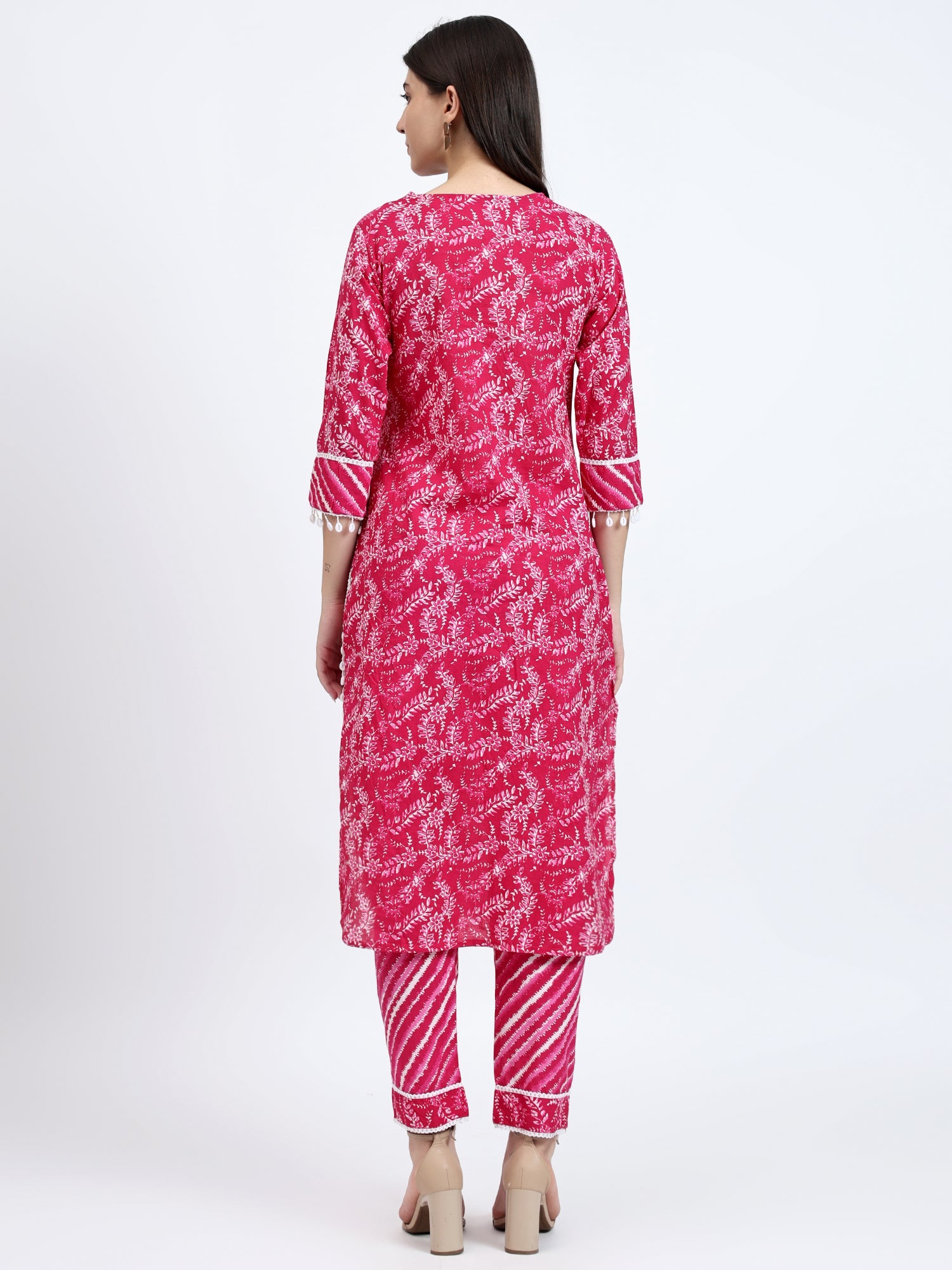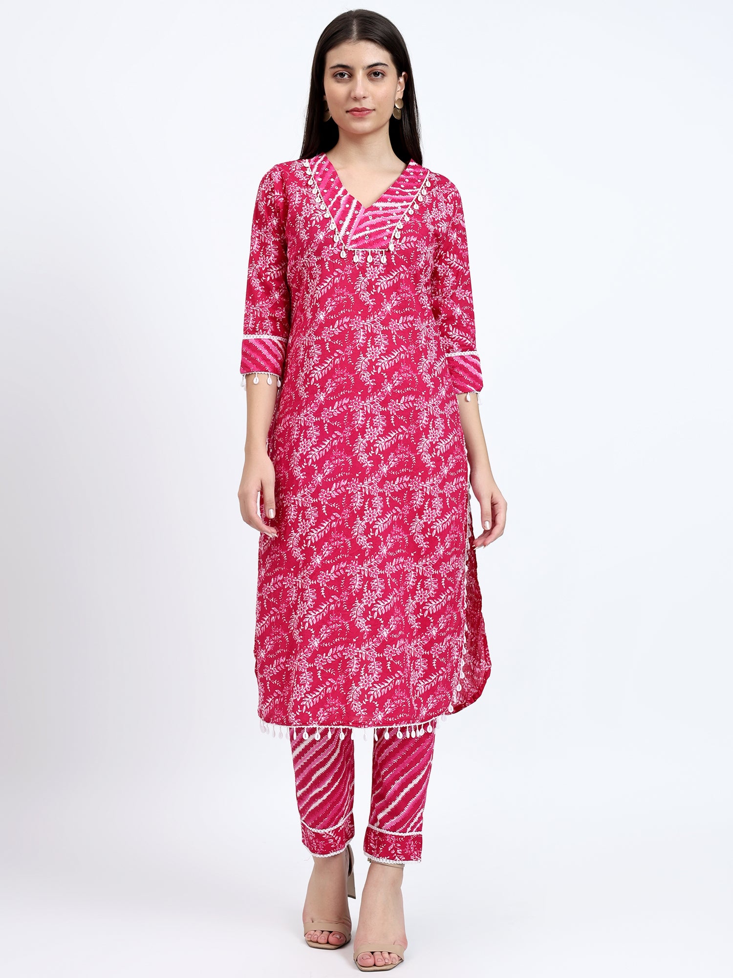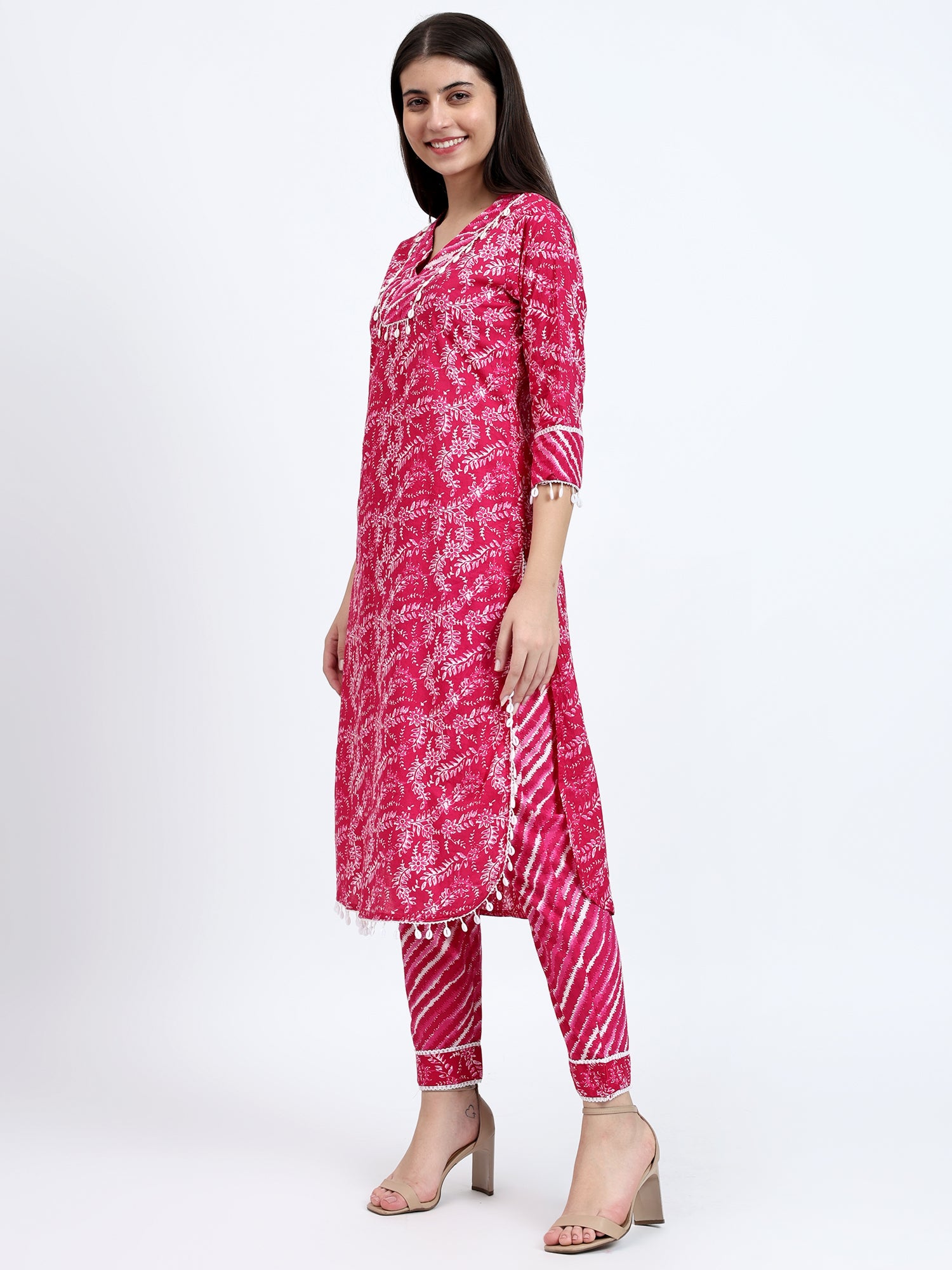 It features a charming pink kurta adorned with a captivating lehariya print, with adda work and kauri lace detailing on the neck and hemline. The kurta's V-neckline adds a touch of elegance, while the apple-cut design flatters your figure.