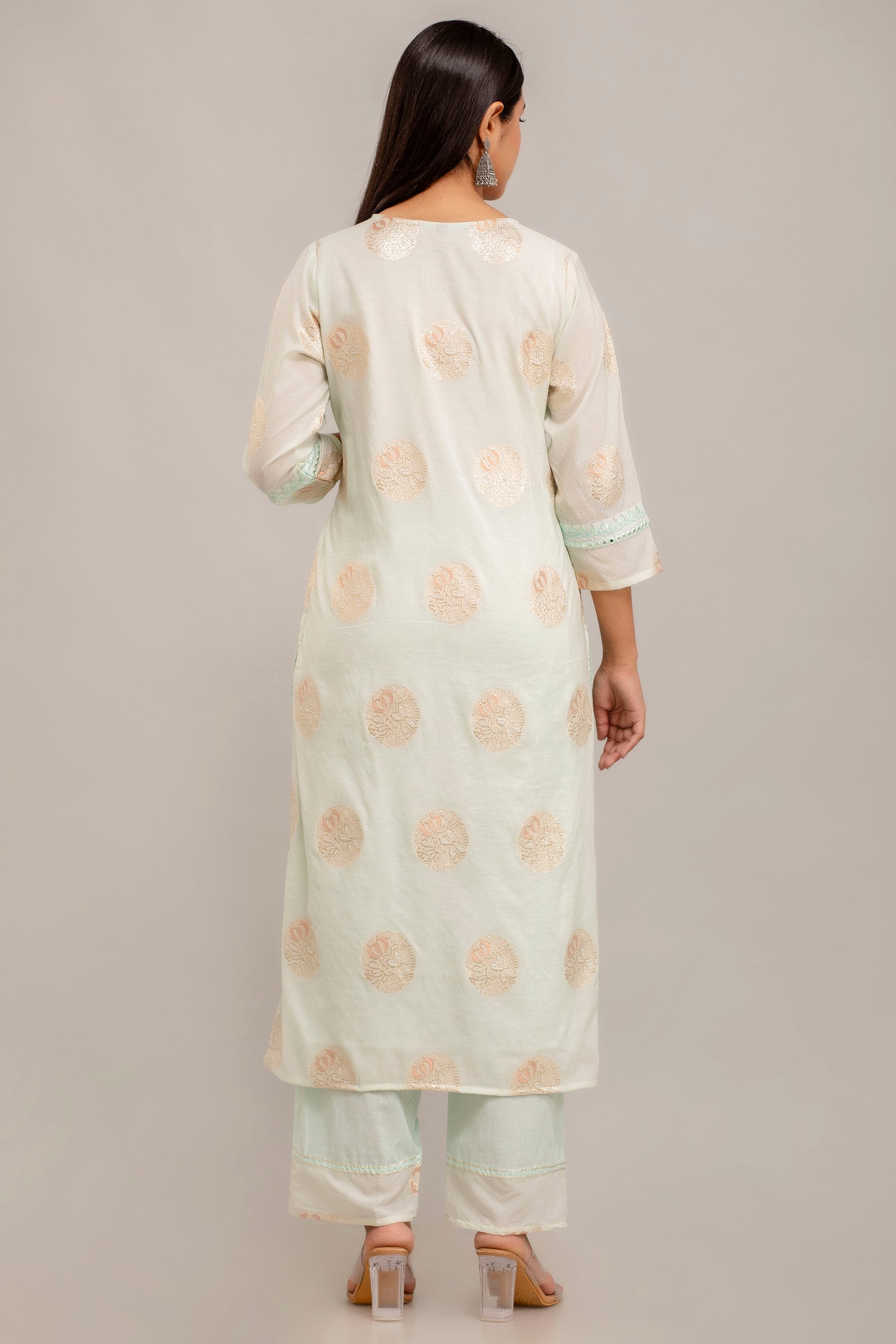 The V-neckline is beautifully adorned with intricate net mirror work embroidery, adding a touch of glamour to the outfit. The sleeves also feature delicate mirror work, enhancing the overall aesthetic. The straight cut of the kurta provides a flattering silhouette, ensuring you look graceful and poised.