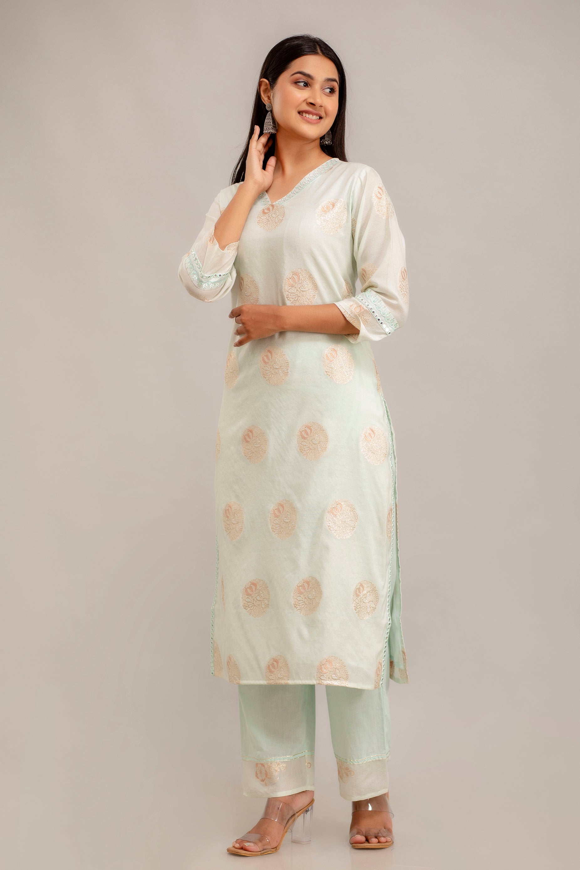 Elevate your wedding wardrobe with our exquisite Jacquard Chanderi Kurta & Cotton Pant Set in a refreshing Mint Green shade. This kurta set features a luxurious self-weaved floral pattern that exudes an air of elegance and charm.