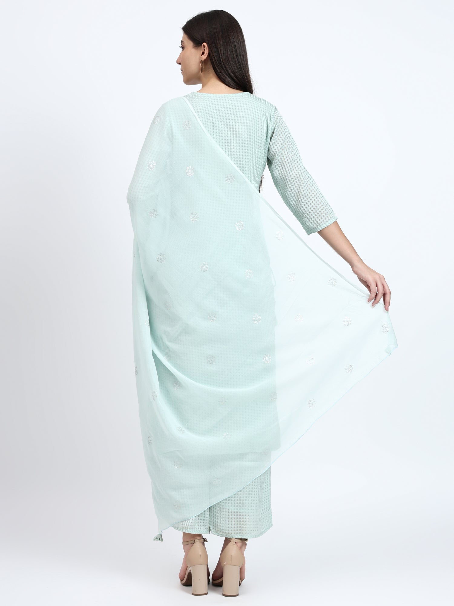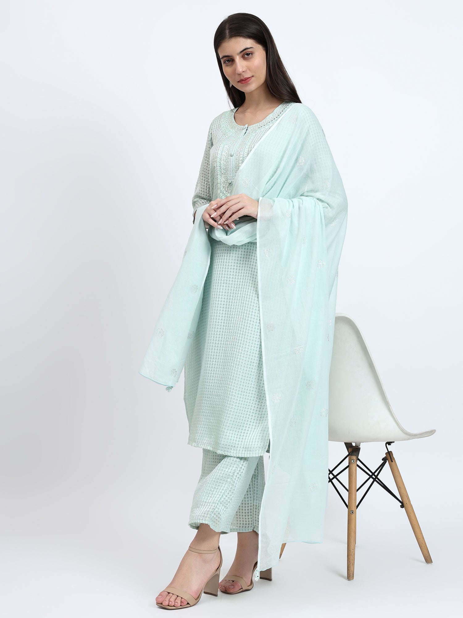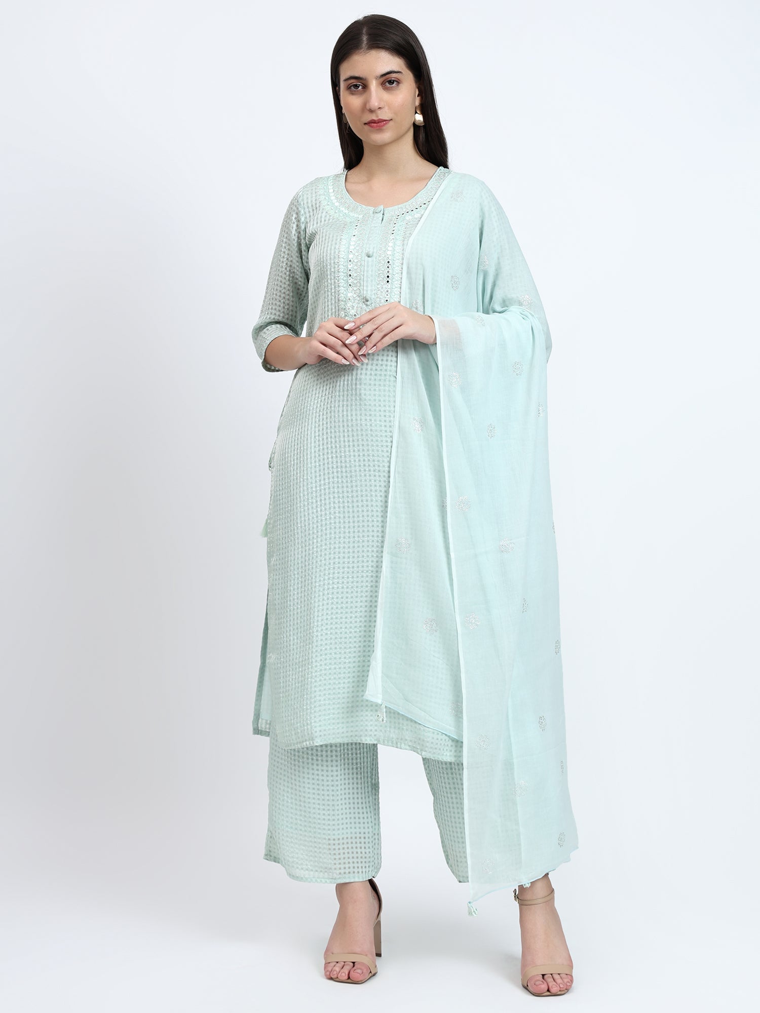 Immerse yourself in comfort and style with our Premium Cotton Viscose Embroidered Kurta Pant Dupatta Set in a captivating peach hue. Crafted from a luxurious viscose check fabric, known for its breathability and soft, smooth feel, offers a beautiful drape & a touch of textural intrigue.