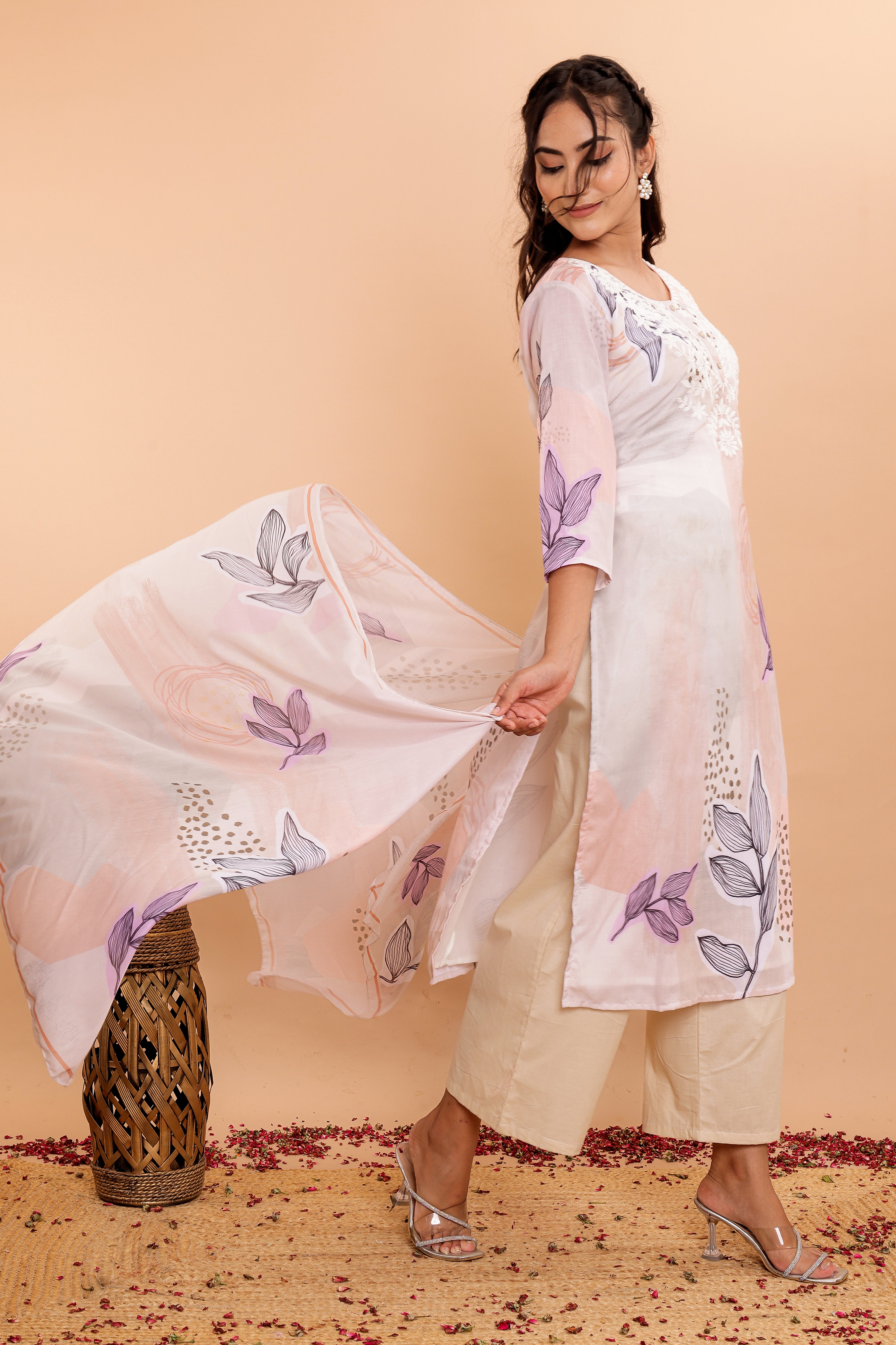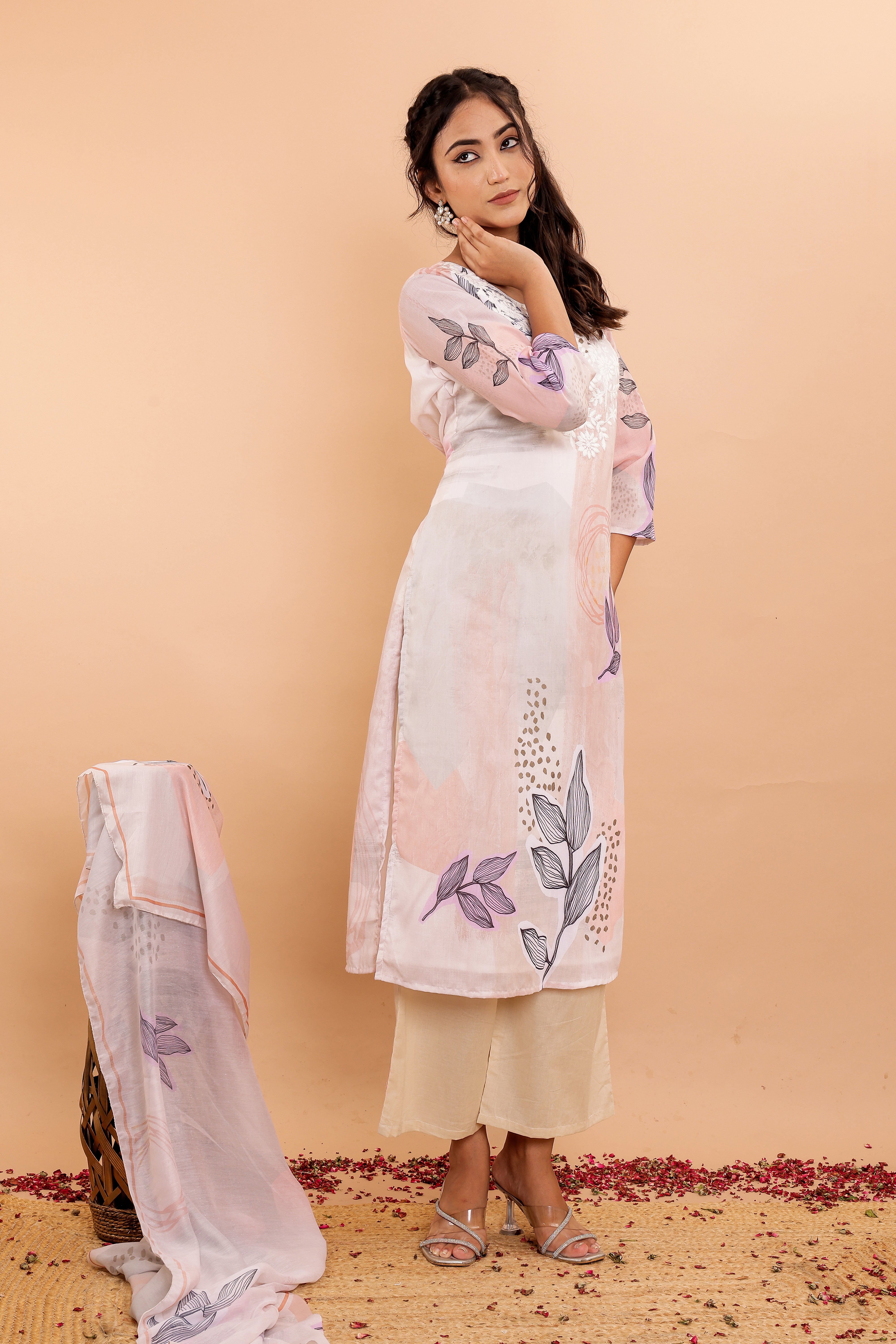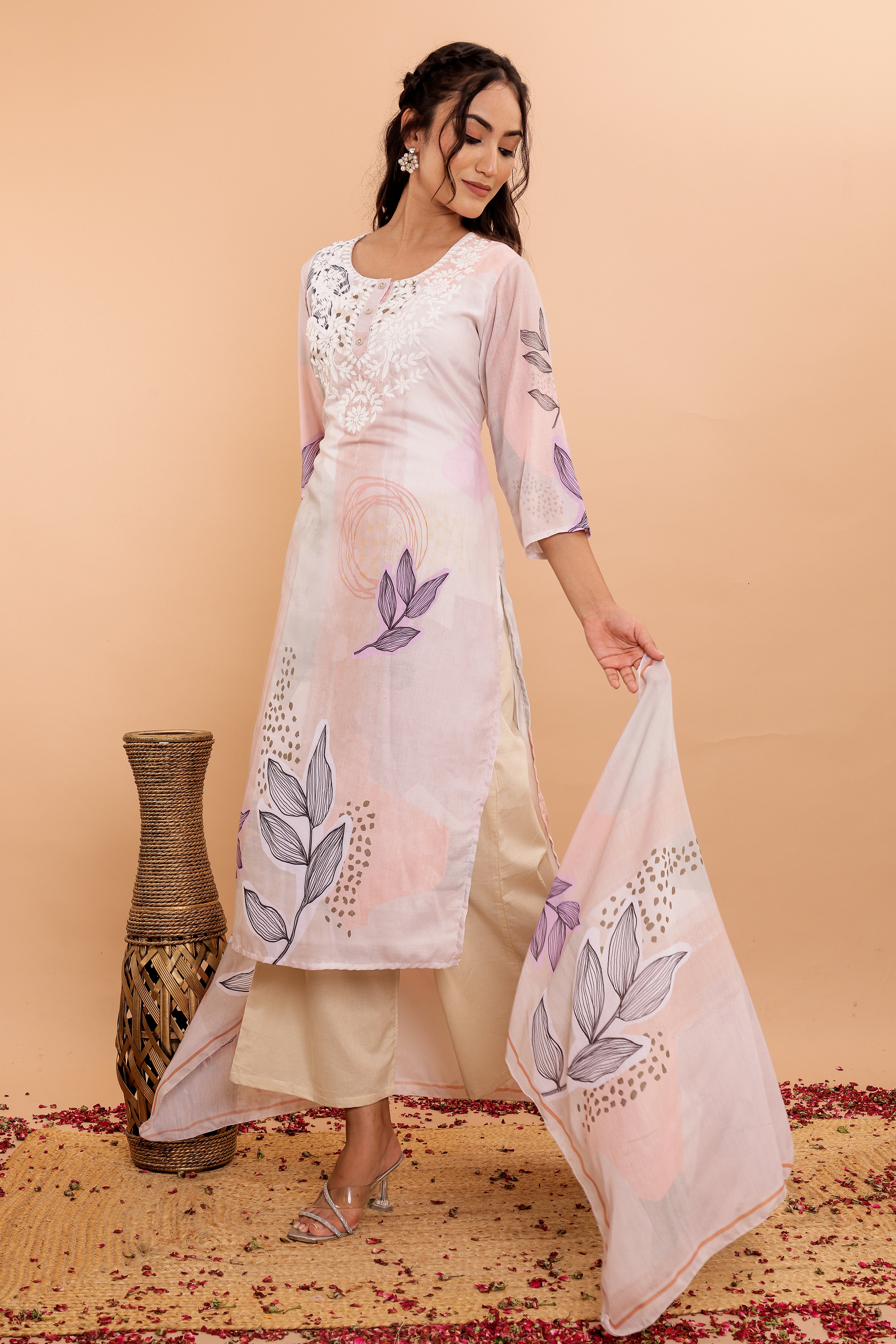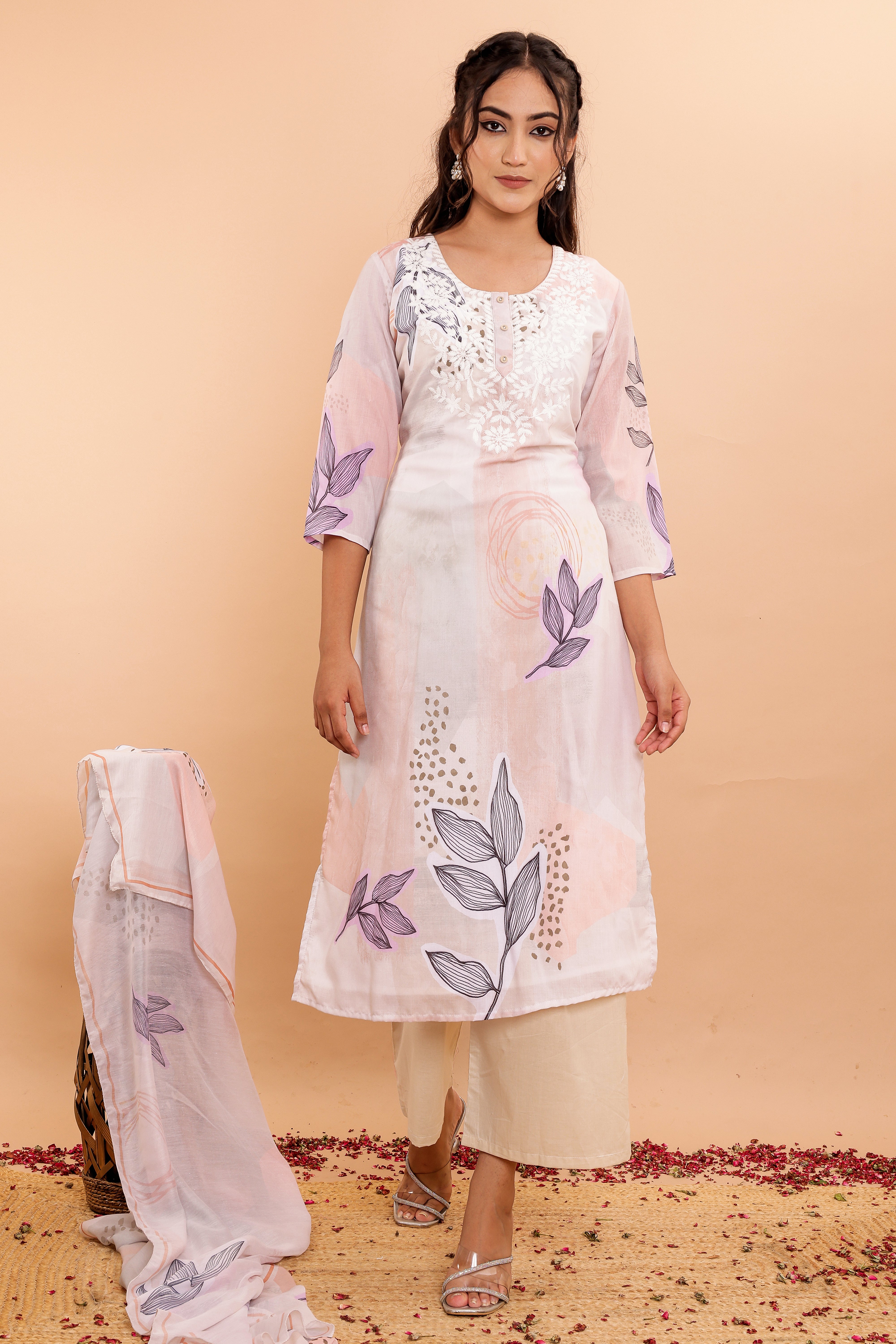 The set includes wide pants designed for comfort and style, complementing the kurta perfectly. The soft fabric dupatta, adorned with a matching digital print, completes the ensemble with grace.