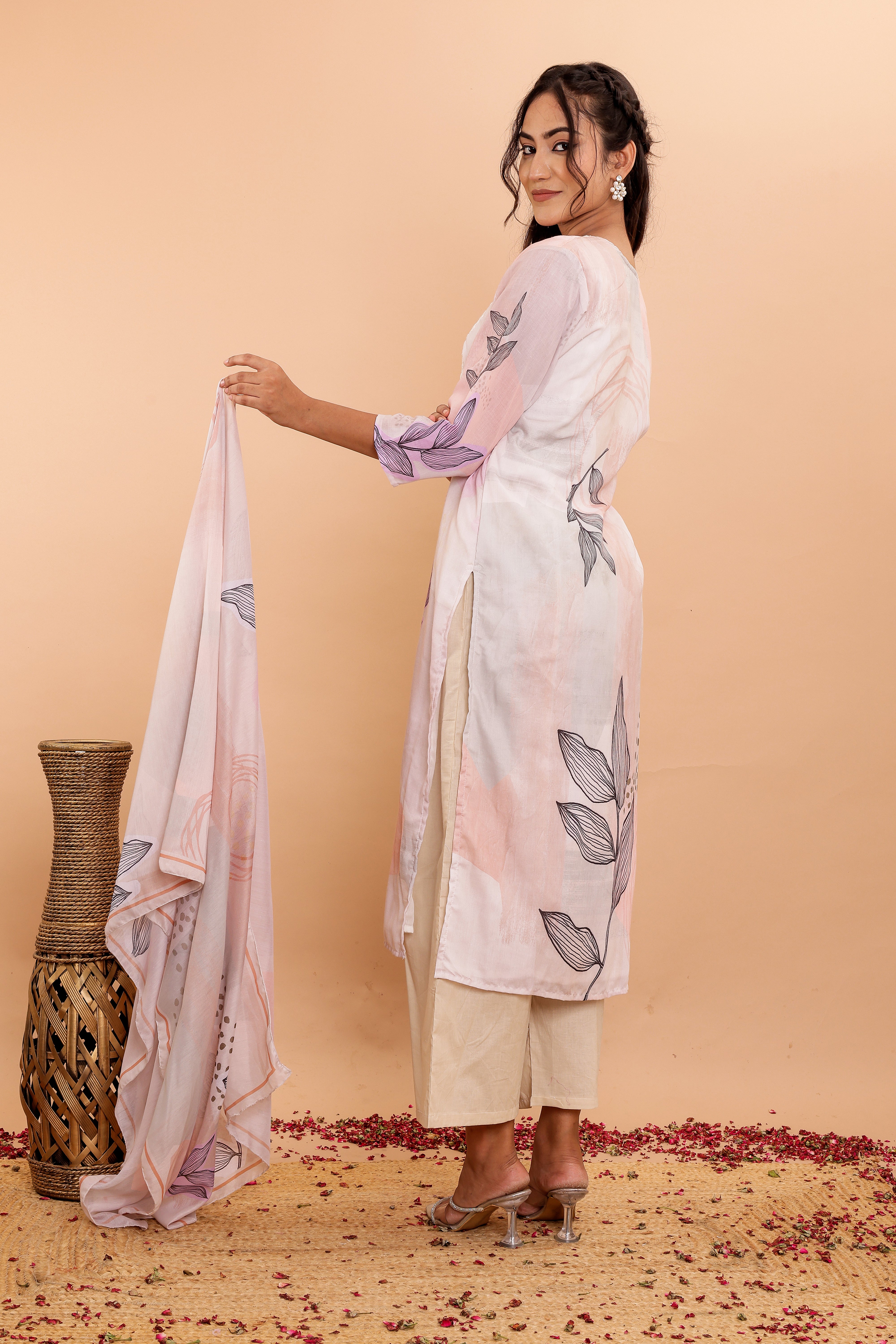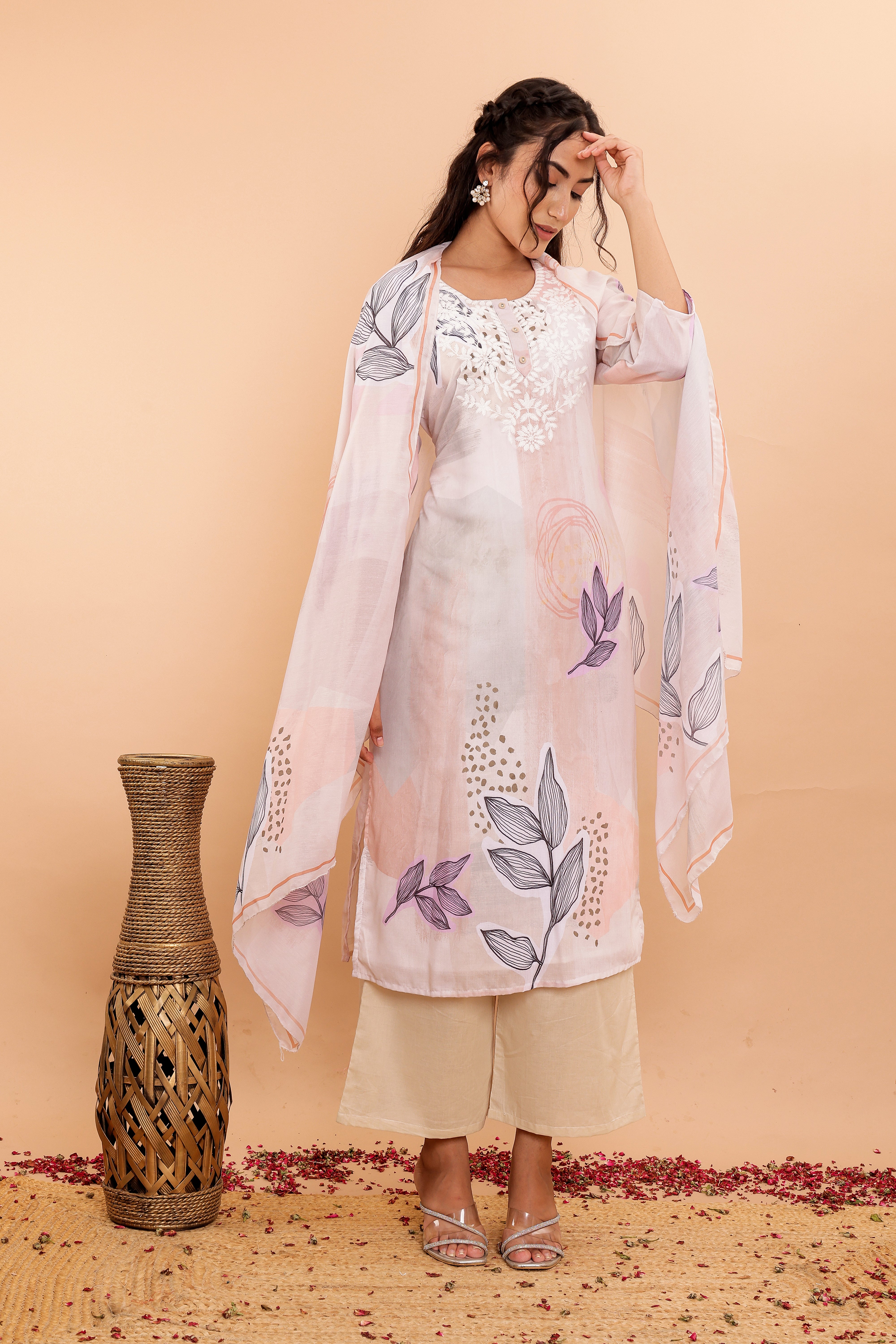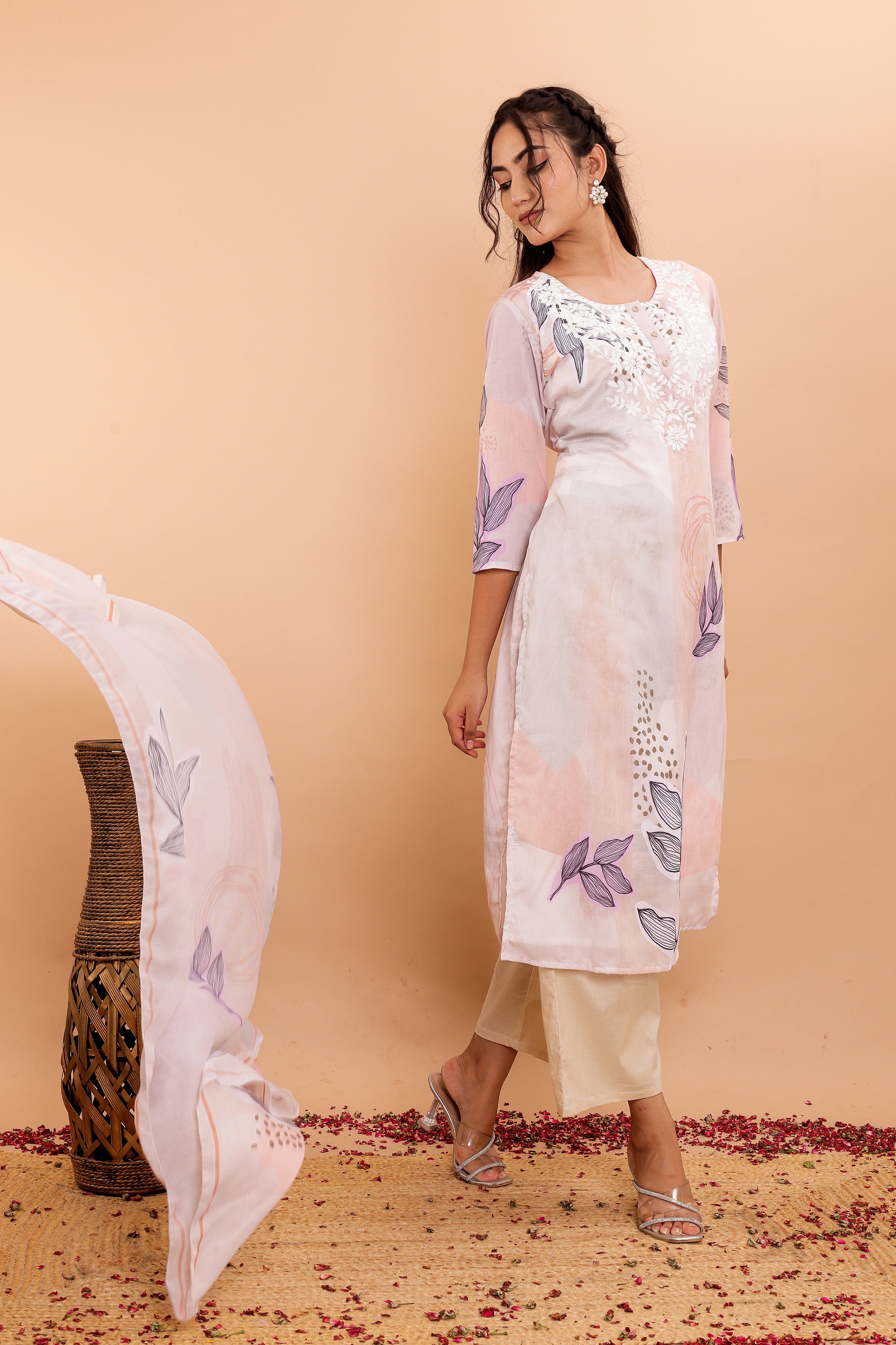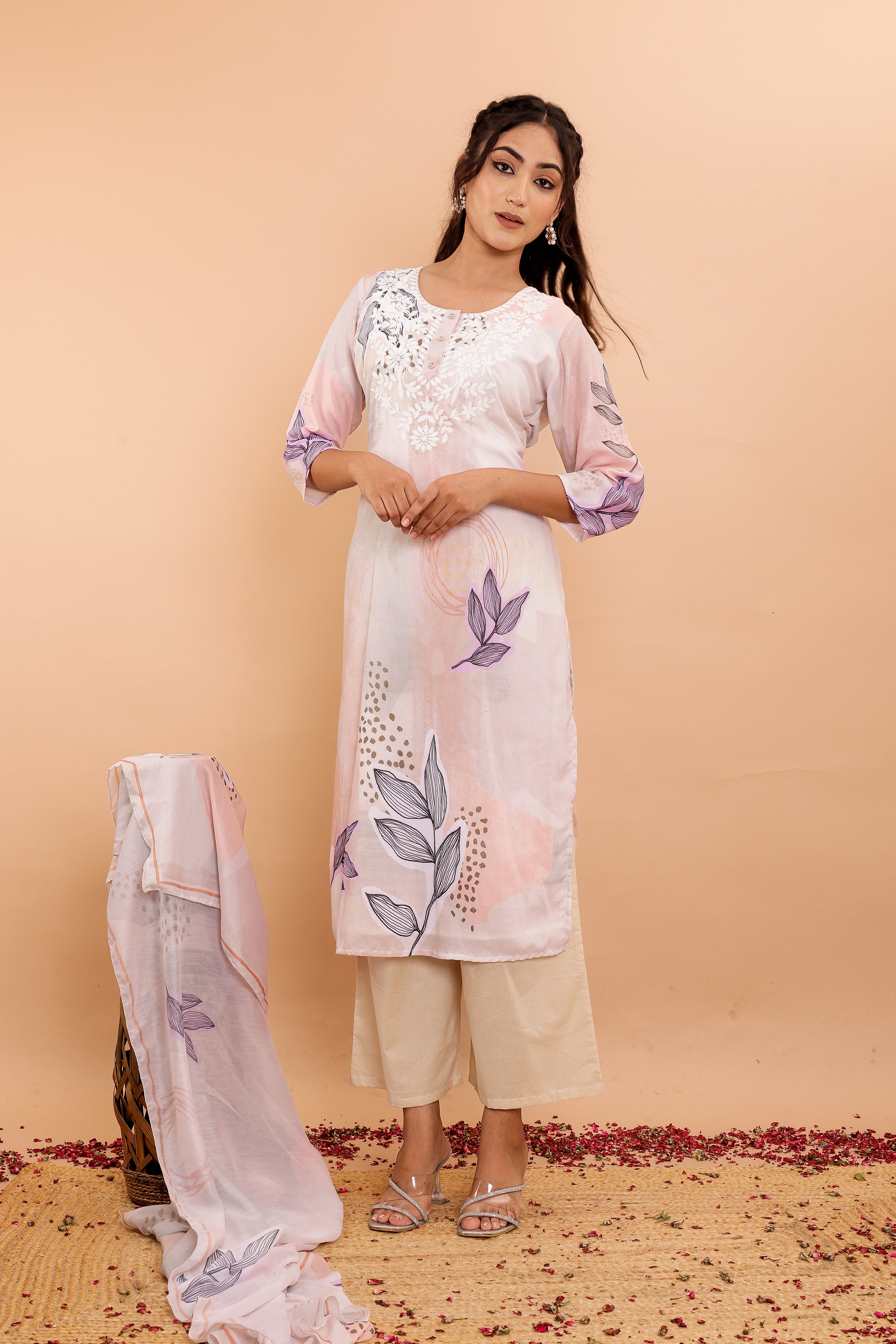The set includes wide pants designed for comfort and style, complementing the kurta perfectly. The soft fabric dupatta, adorned with a matching digital print, completes the ensemble with grace.