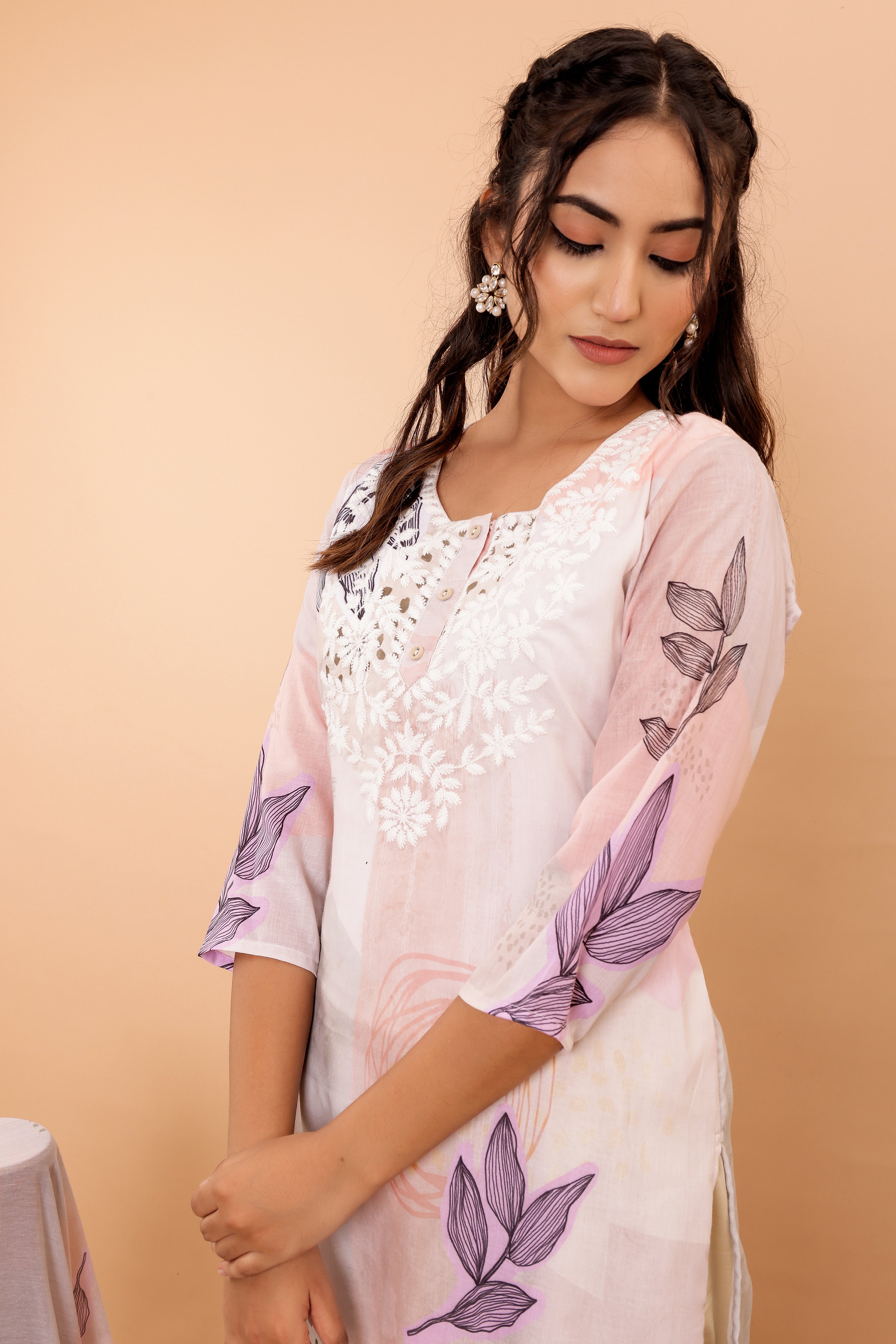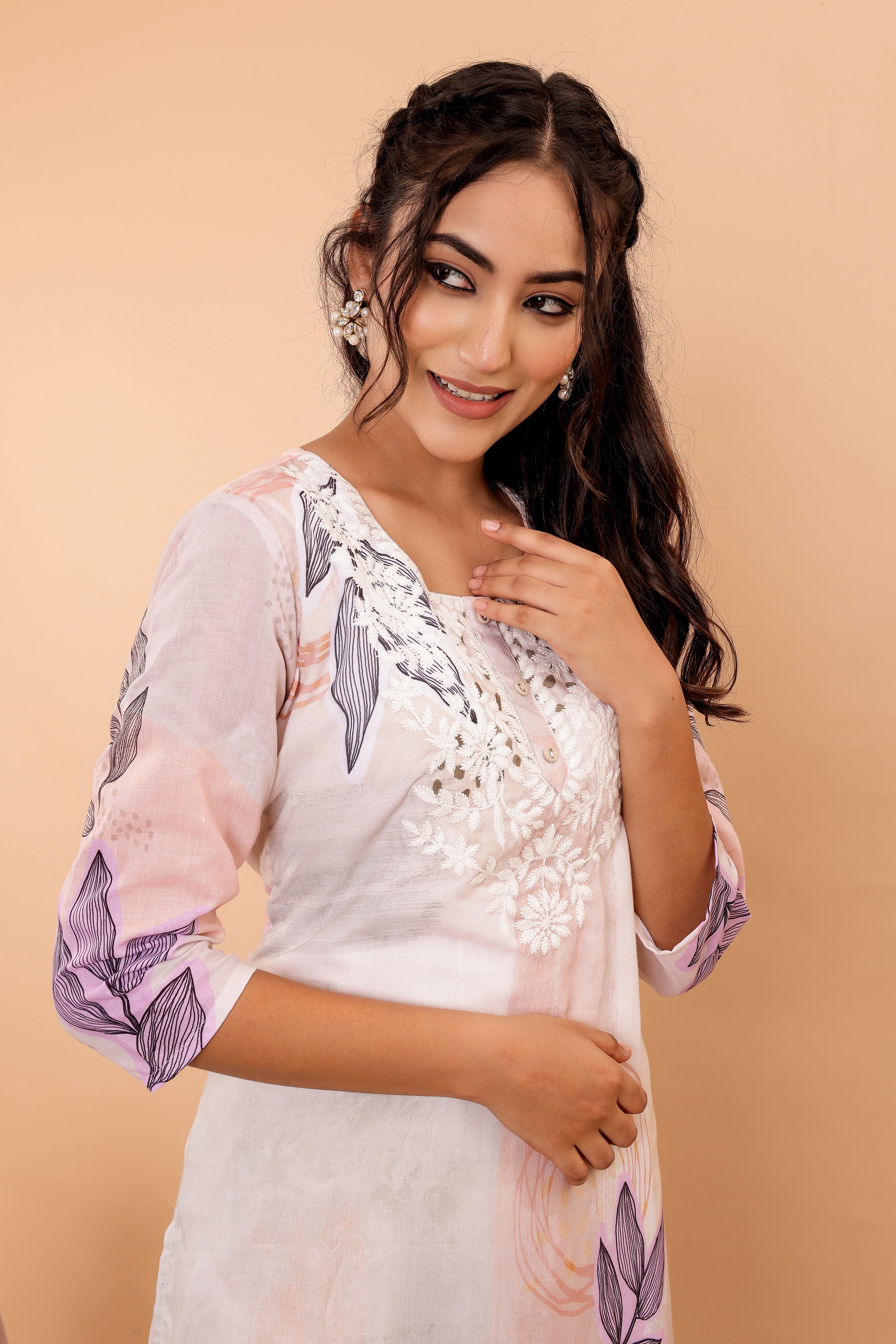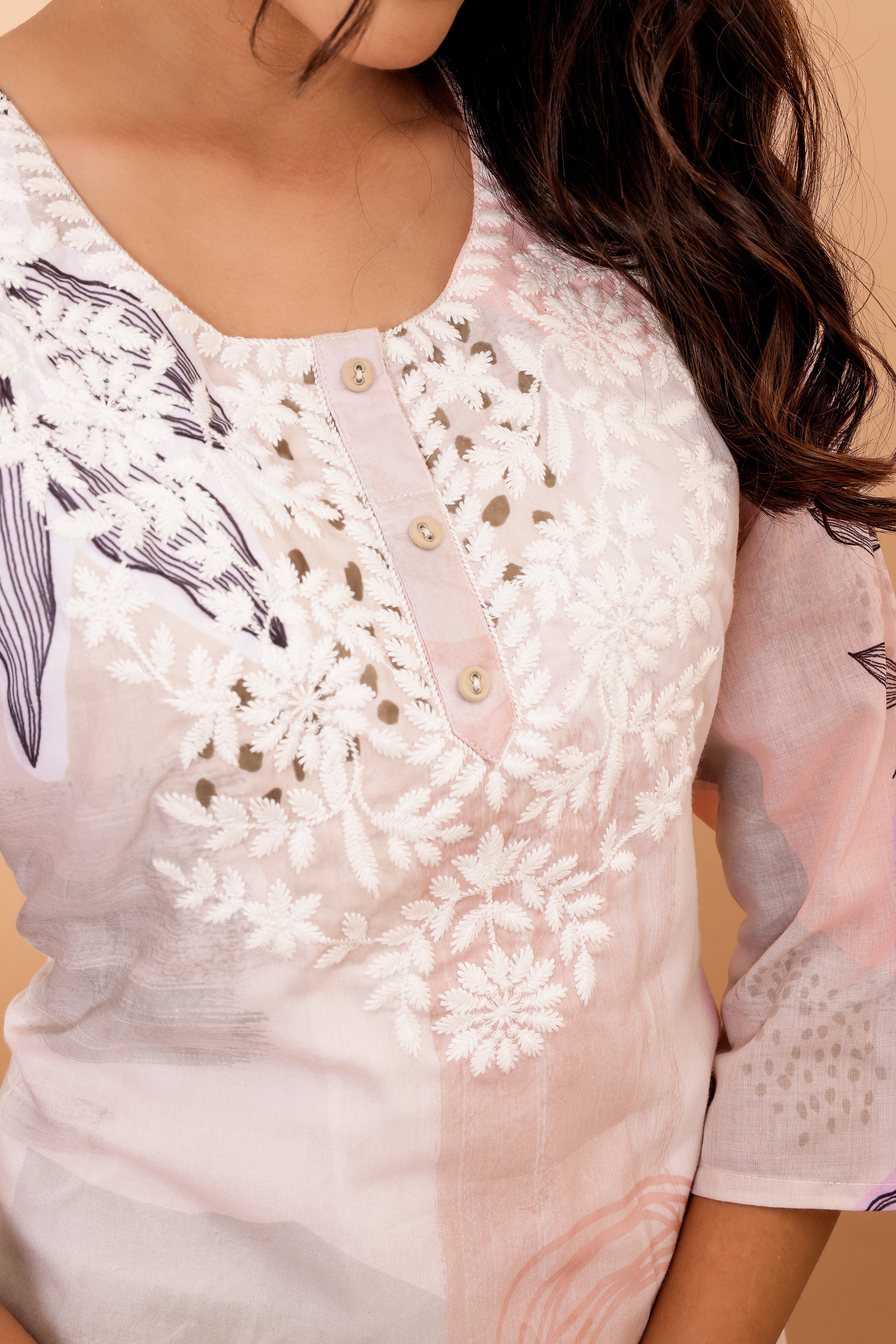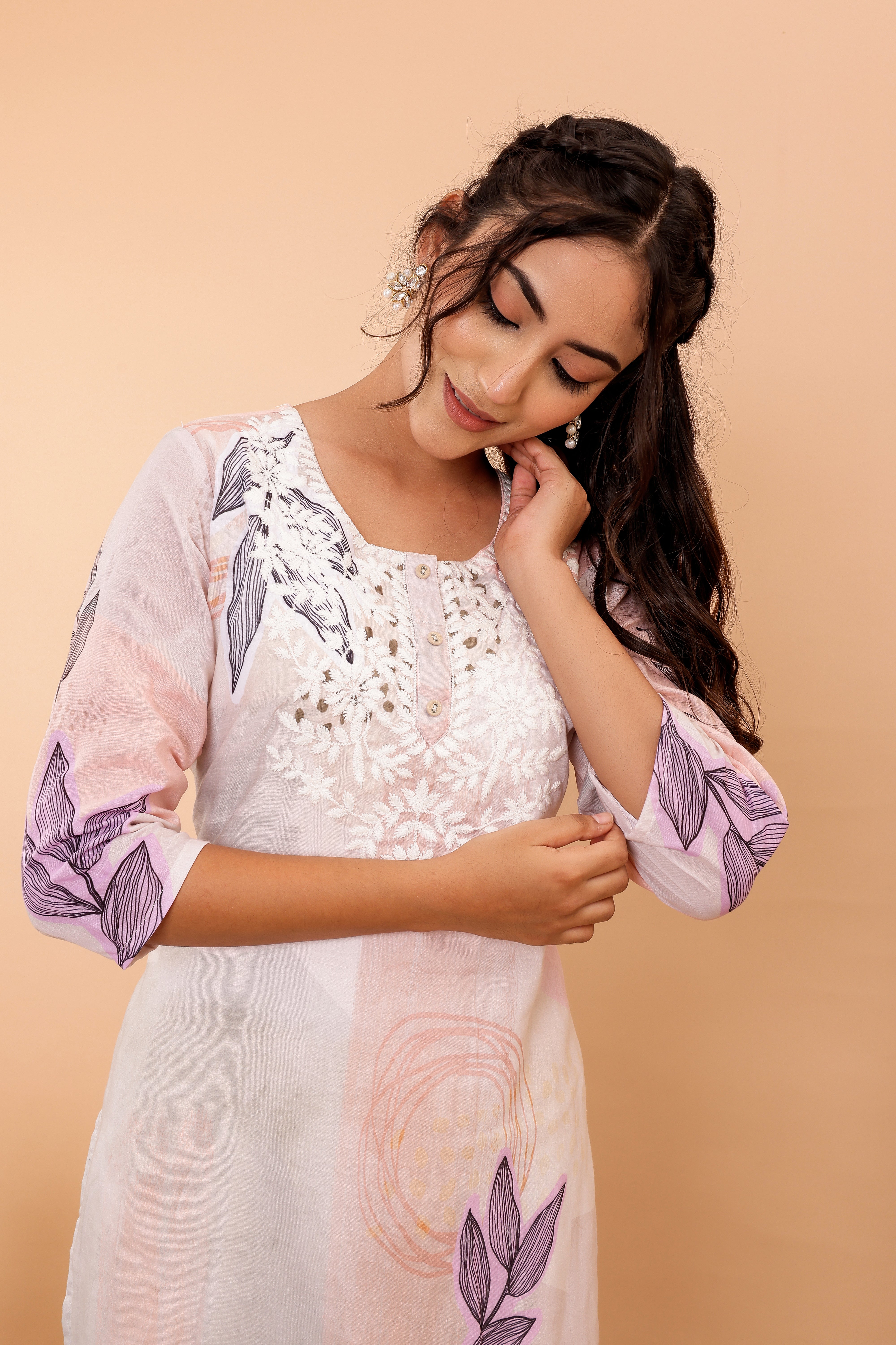 The kurta is adorned with exquisite digital print and intricate embroidery on the yoke, perfectly blends tradition with a contemporary touch. Its round neck and straight fit make it a versatile piece that can be dressed up or down.