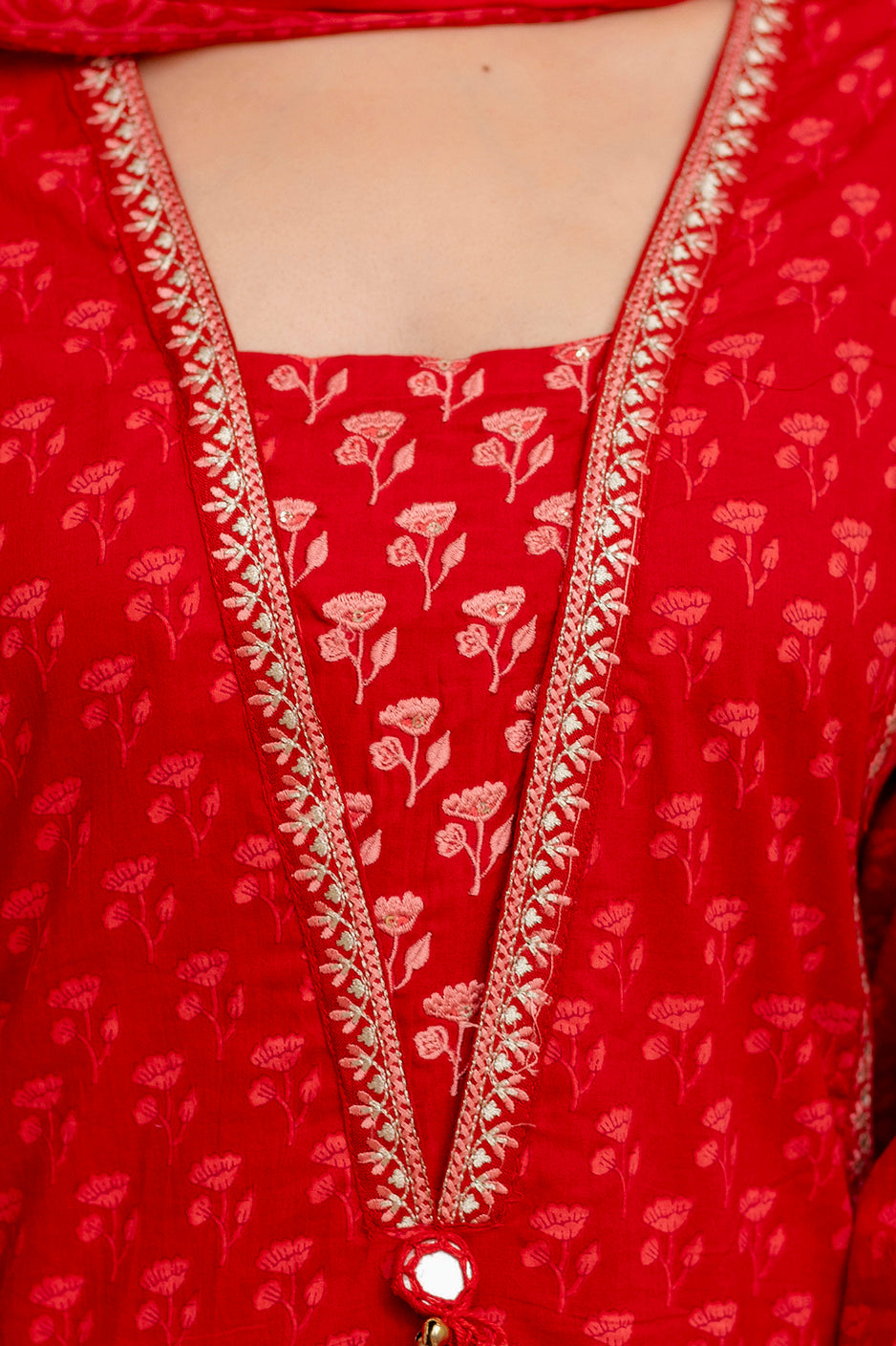 This beautiful kurta set features a classic V-neck design with a straight cut, offering a flattering silhouette for all body types. The kurta is adorned with exquisite embroidery on the front, adding a touch of elegance and sophistication.