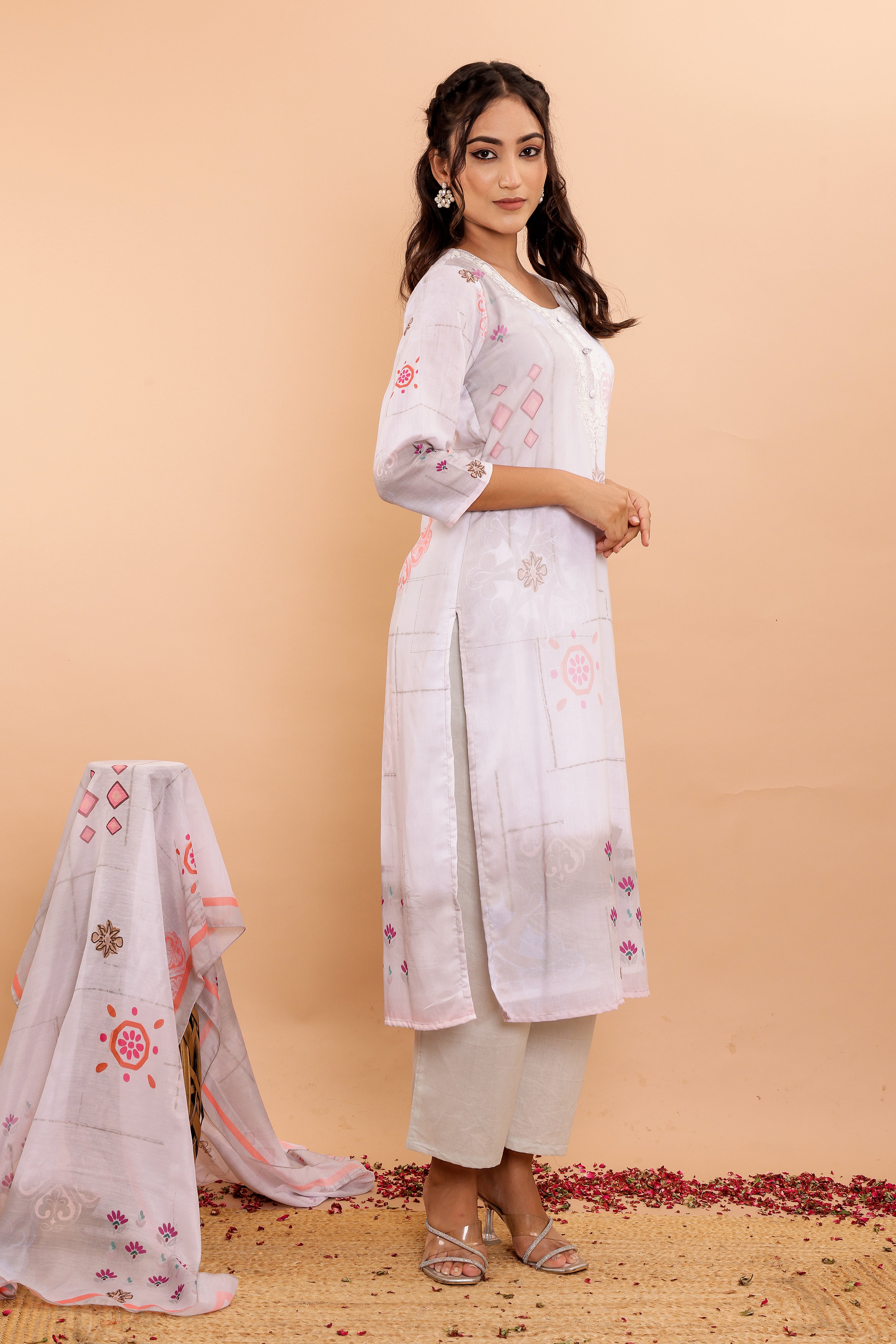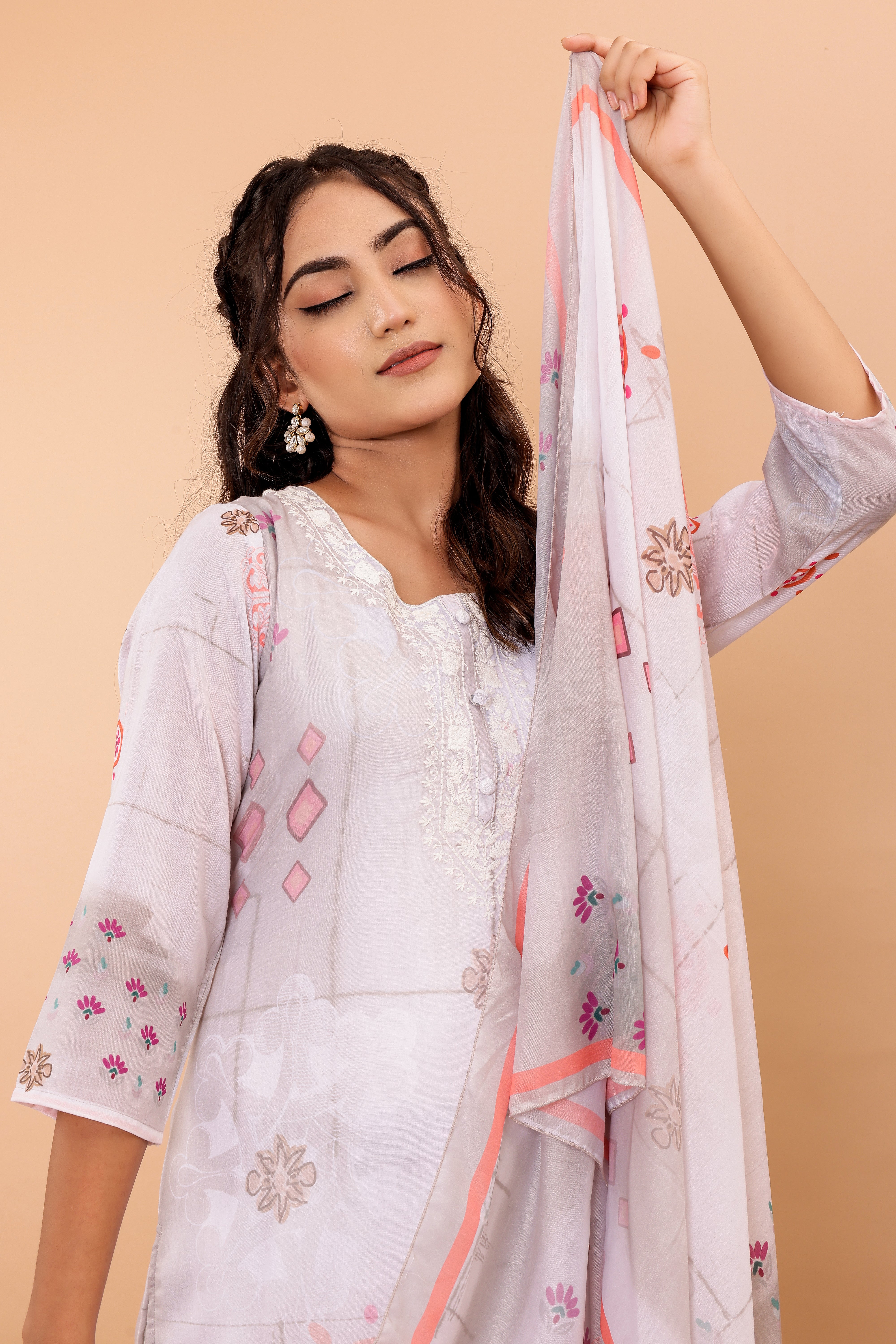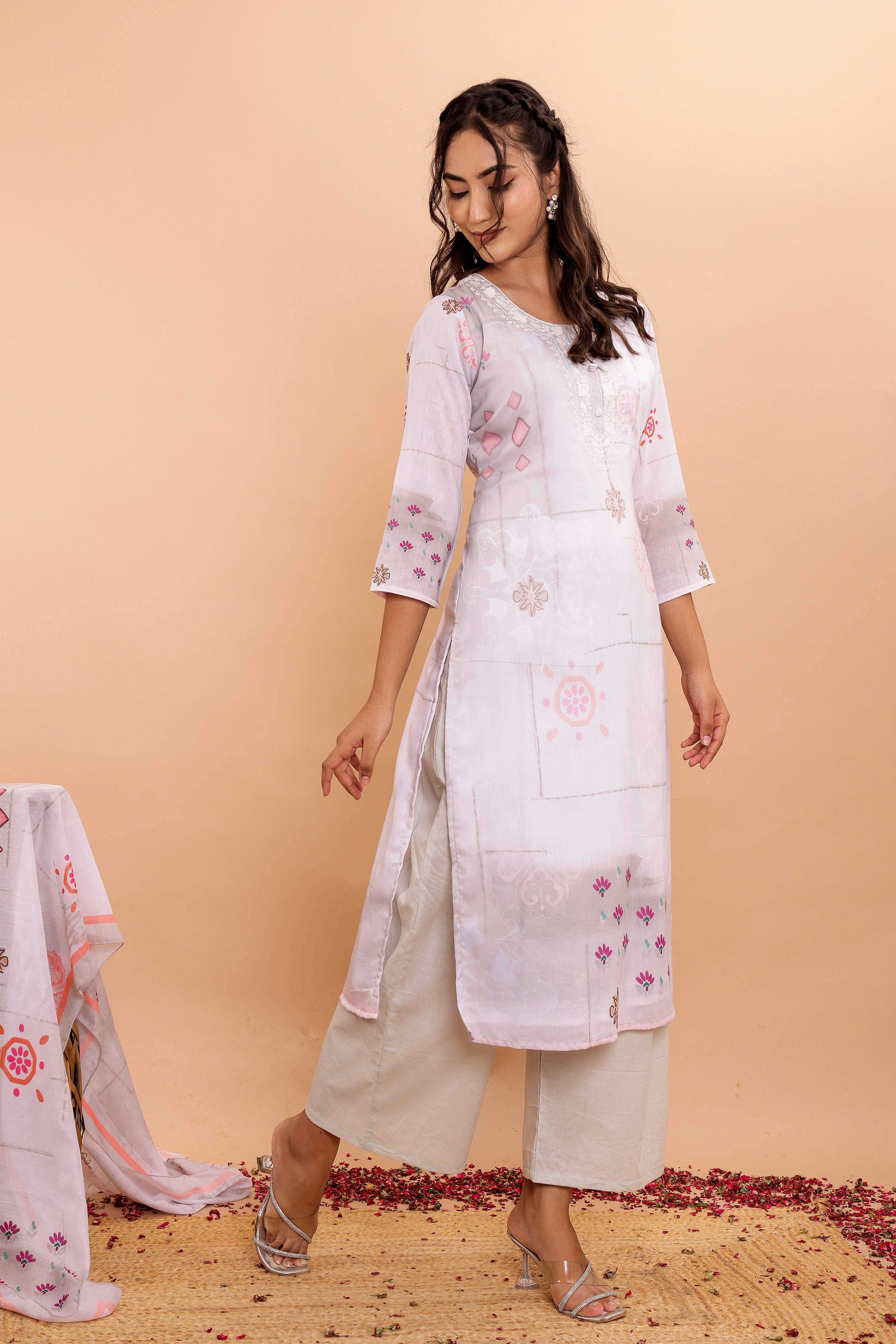 Accompanying the kurta are wide pants that offer both style and comfort, making this set an ideal choice for long days. The soft, digital print dupatta complements the kurta beautifully, completing the look with a touch of sophistication.