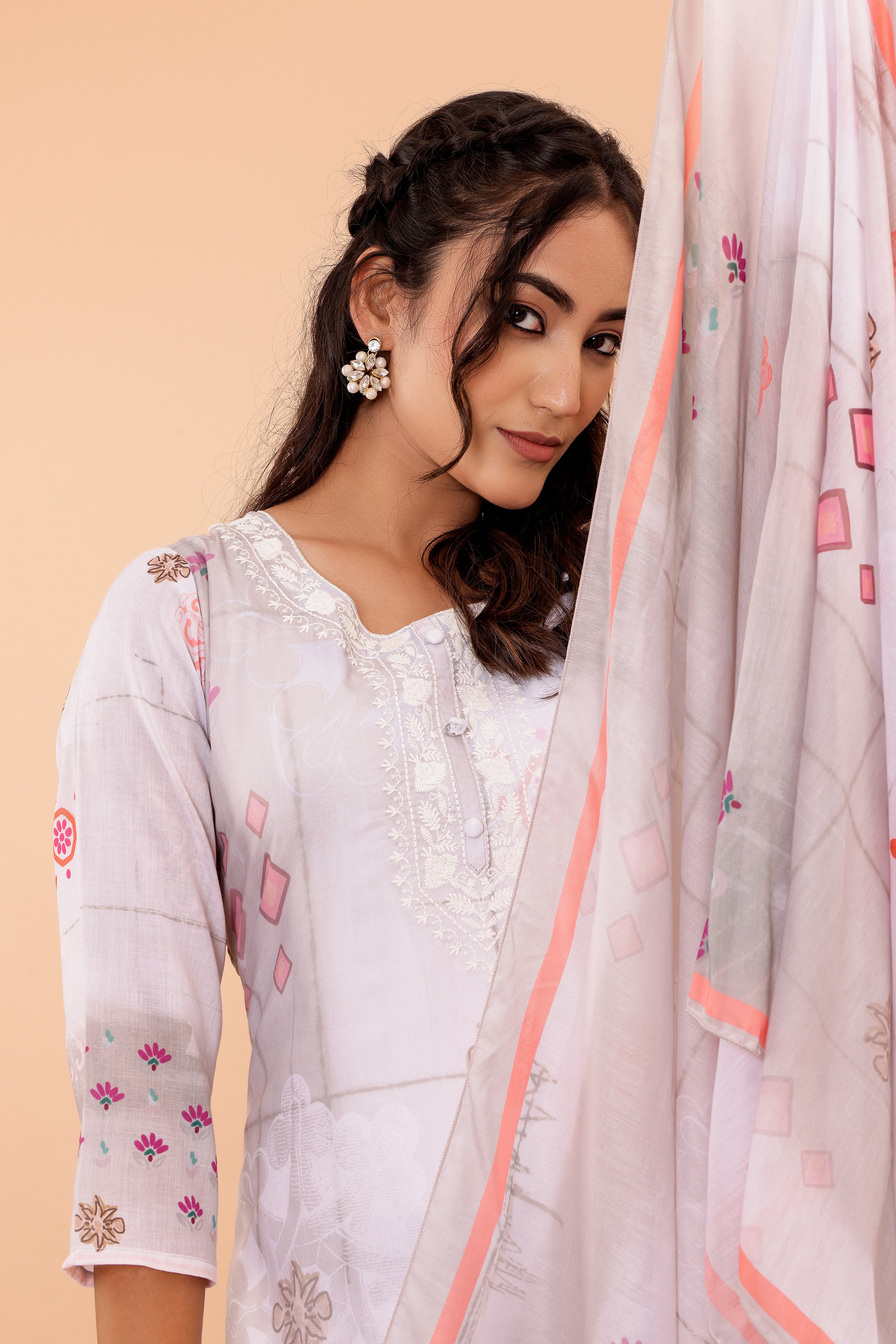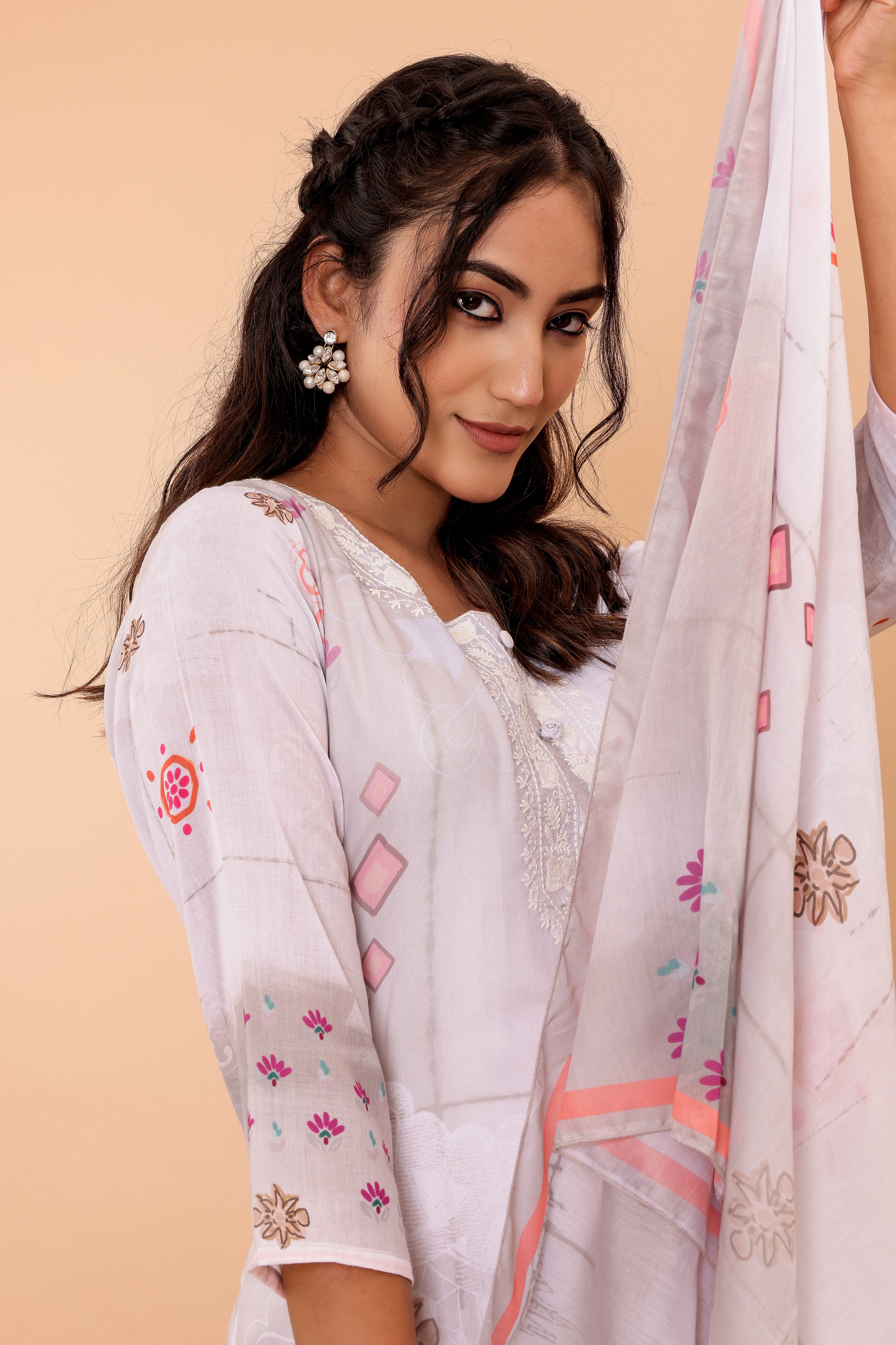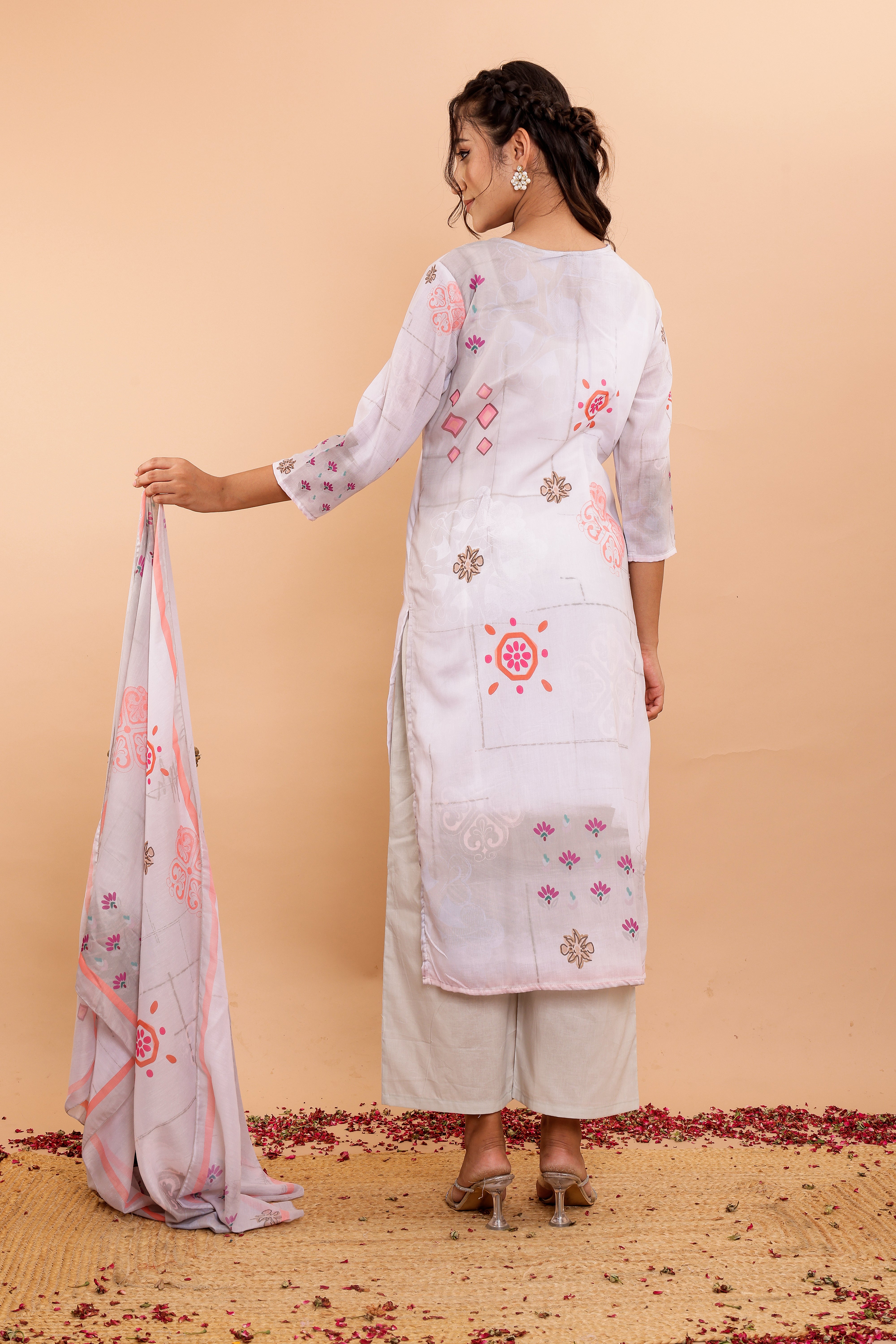 Accompanying the kurta are wide pants that offer both style and comfort, making this set an ideal choice for long days. The soft, digital print dupatta complements the kurta beautifully, completing the look with a touch of sophistication.