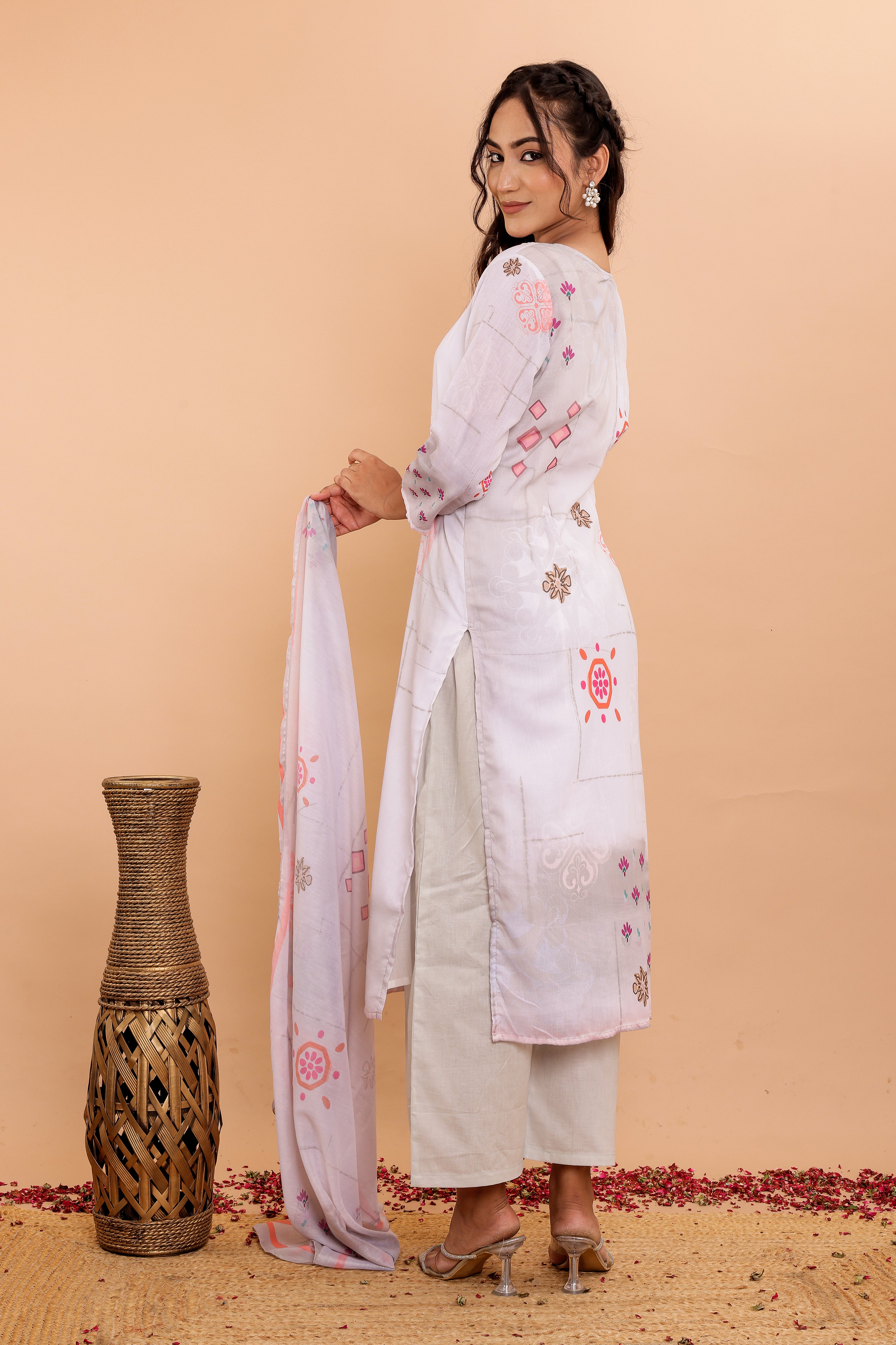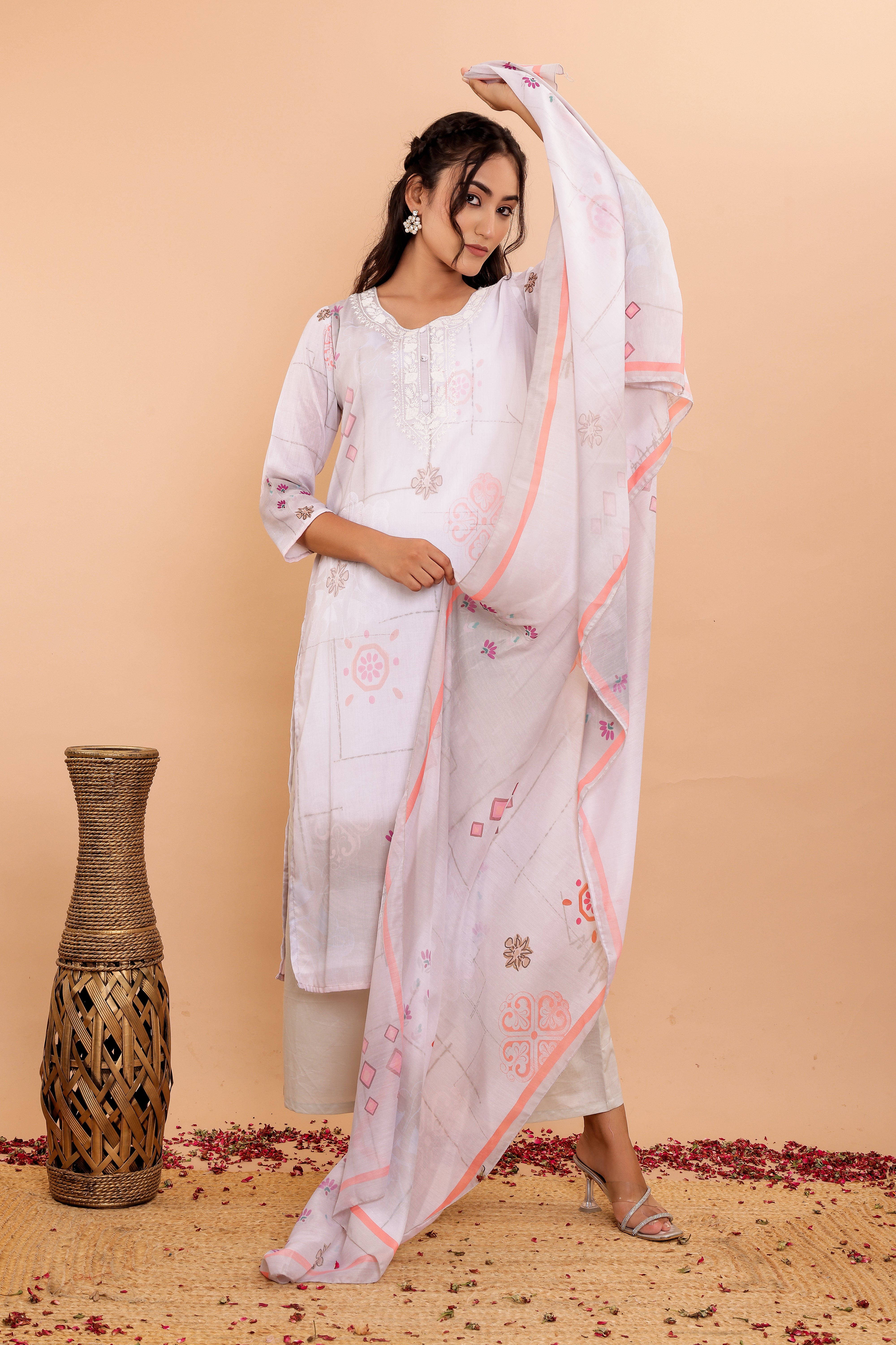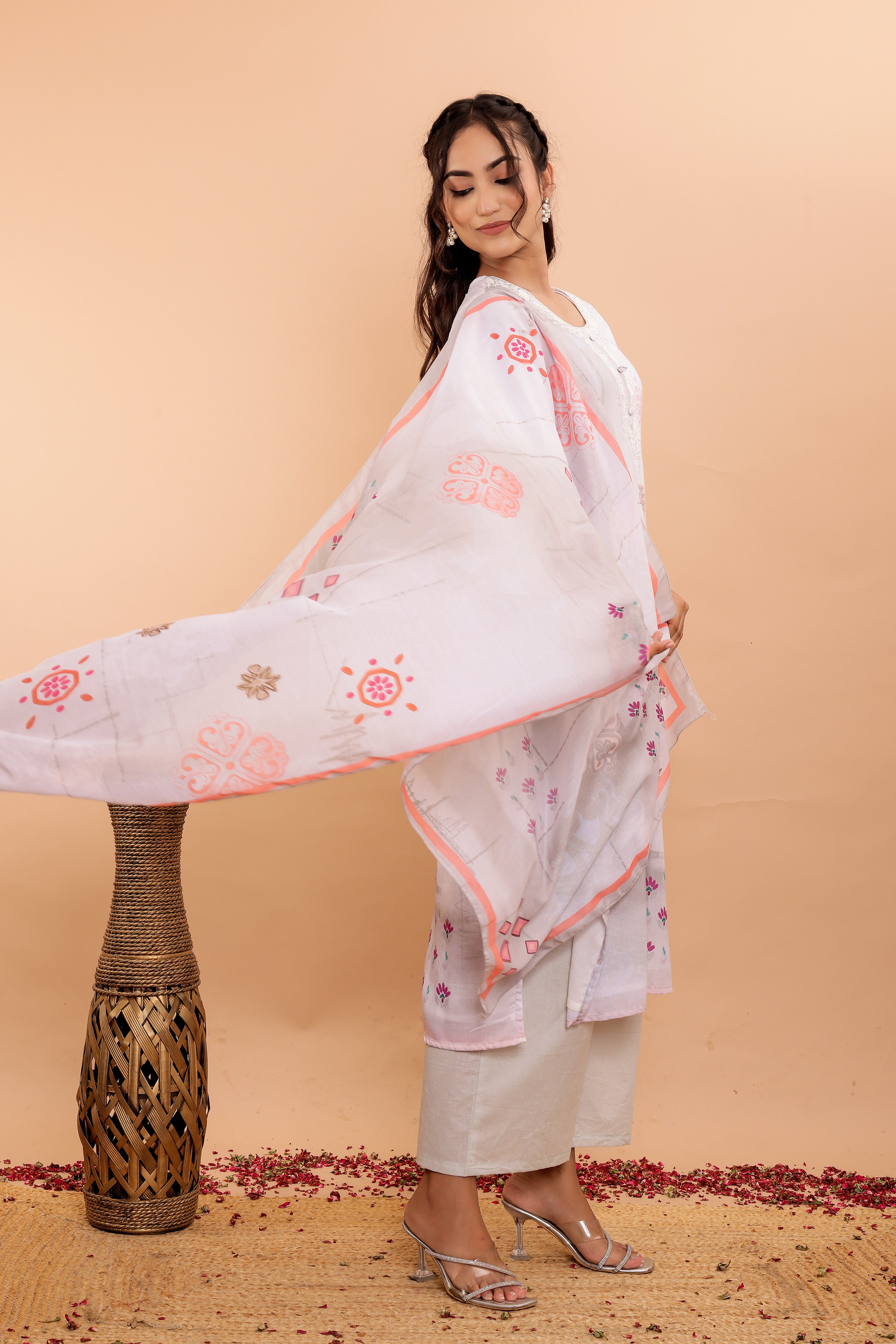 Introducing our White Mulmul Cotton Kurta, Pant, and Dupatta Set, a perfect blend of comfort and style for any occasion. Crafted from soft mulmul cotton, this 3-piece set is designed to keep you cool and comfortable while making a fashion statement.