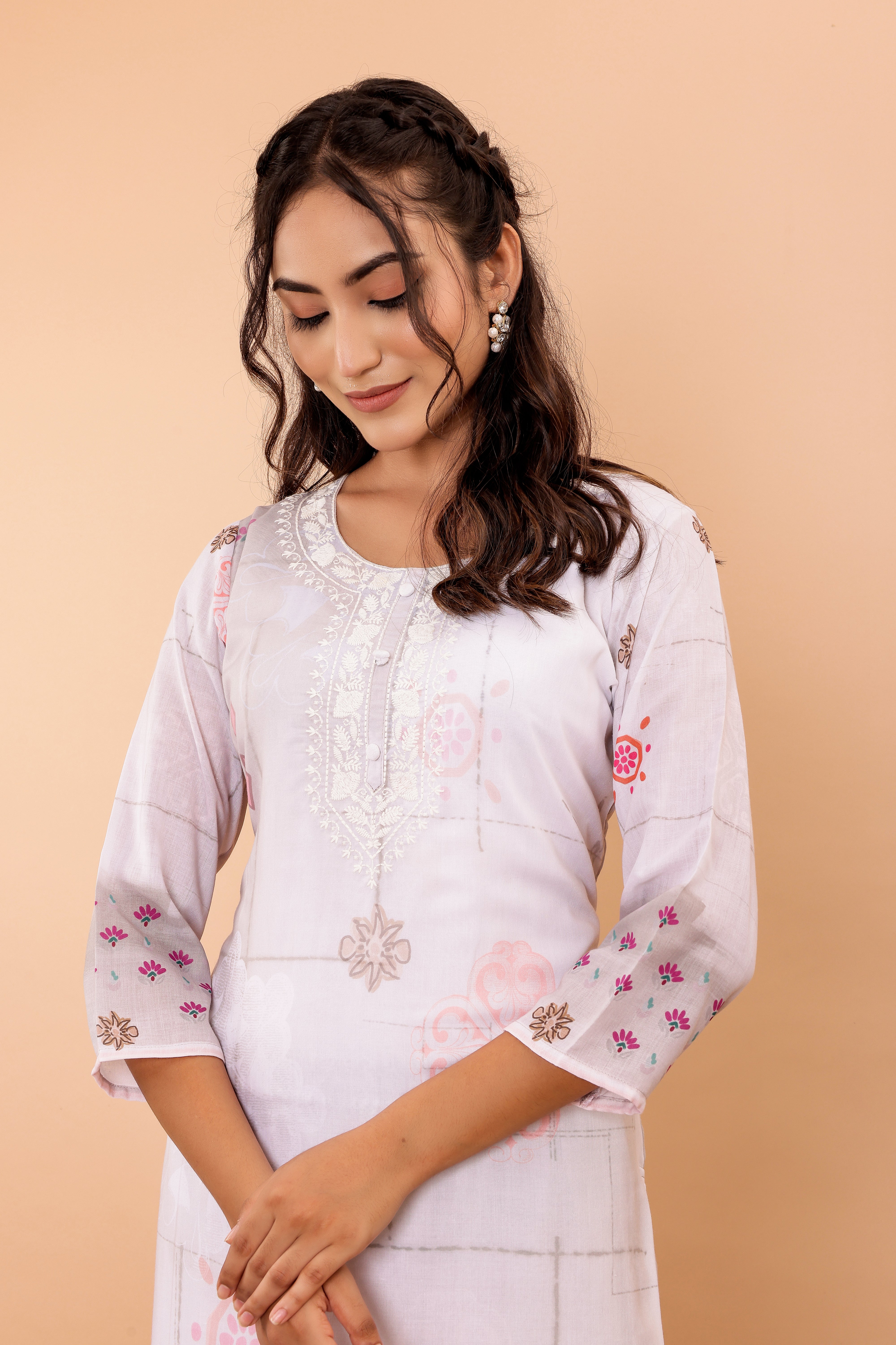 The kurta features exquisite digital prints and detailed embroidery on the yoke, adding a unique charm to the outfit. The round neck and straight fit make it a versatile piece that can be dressed up or down for various occasions.
