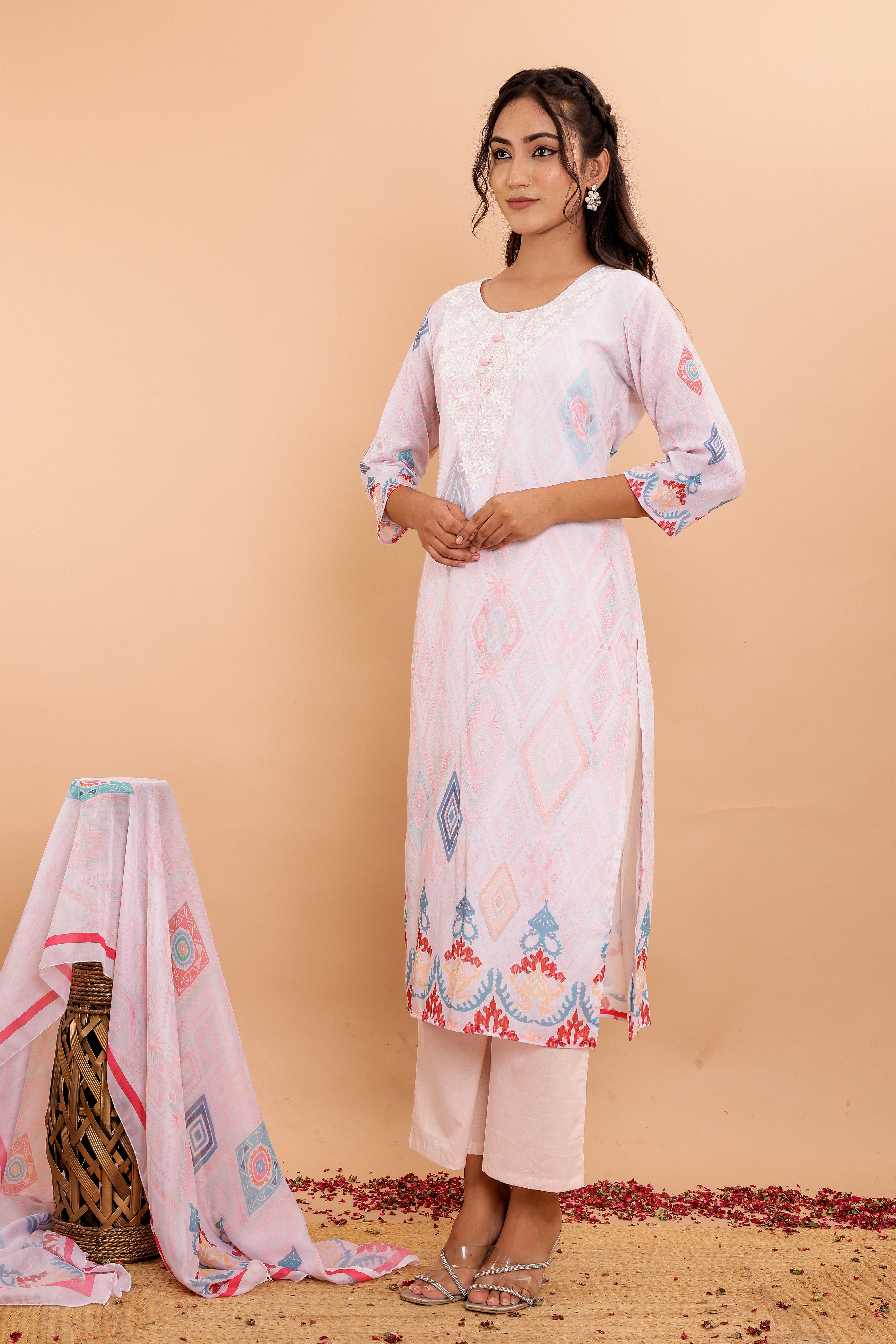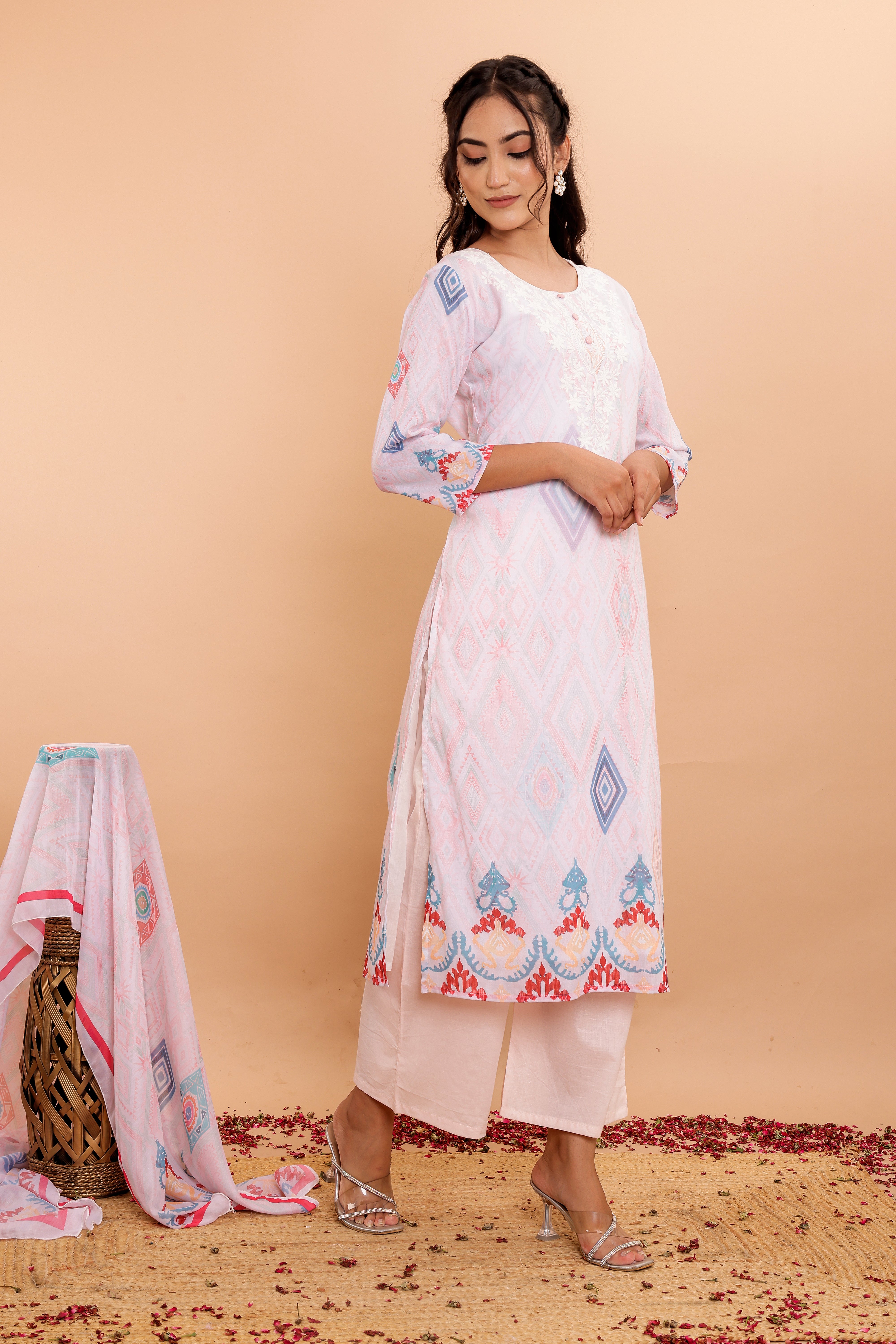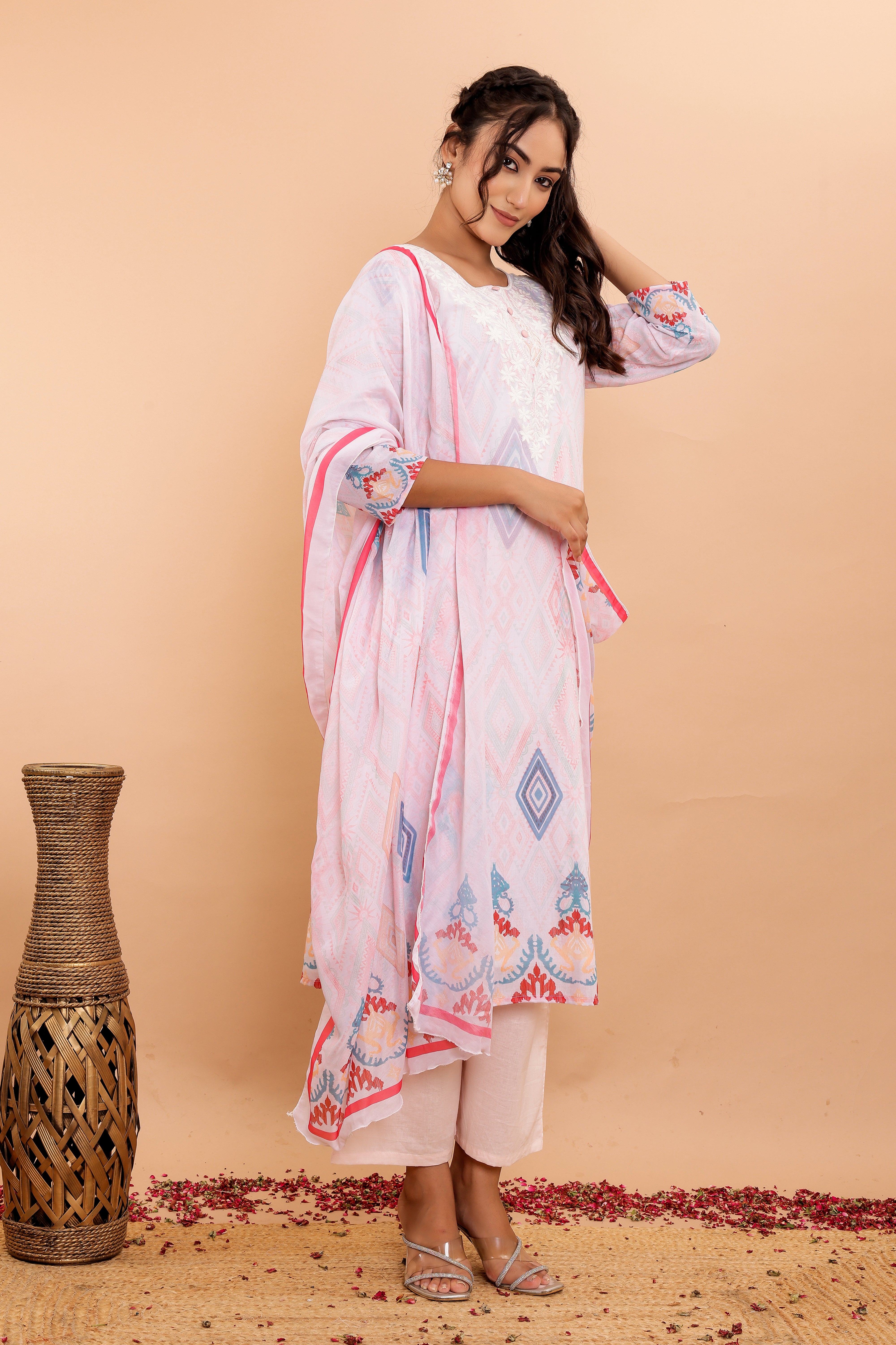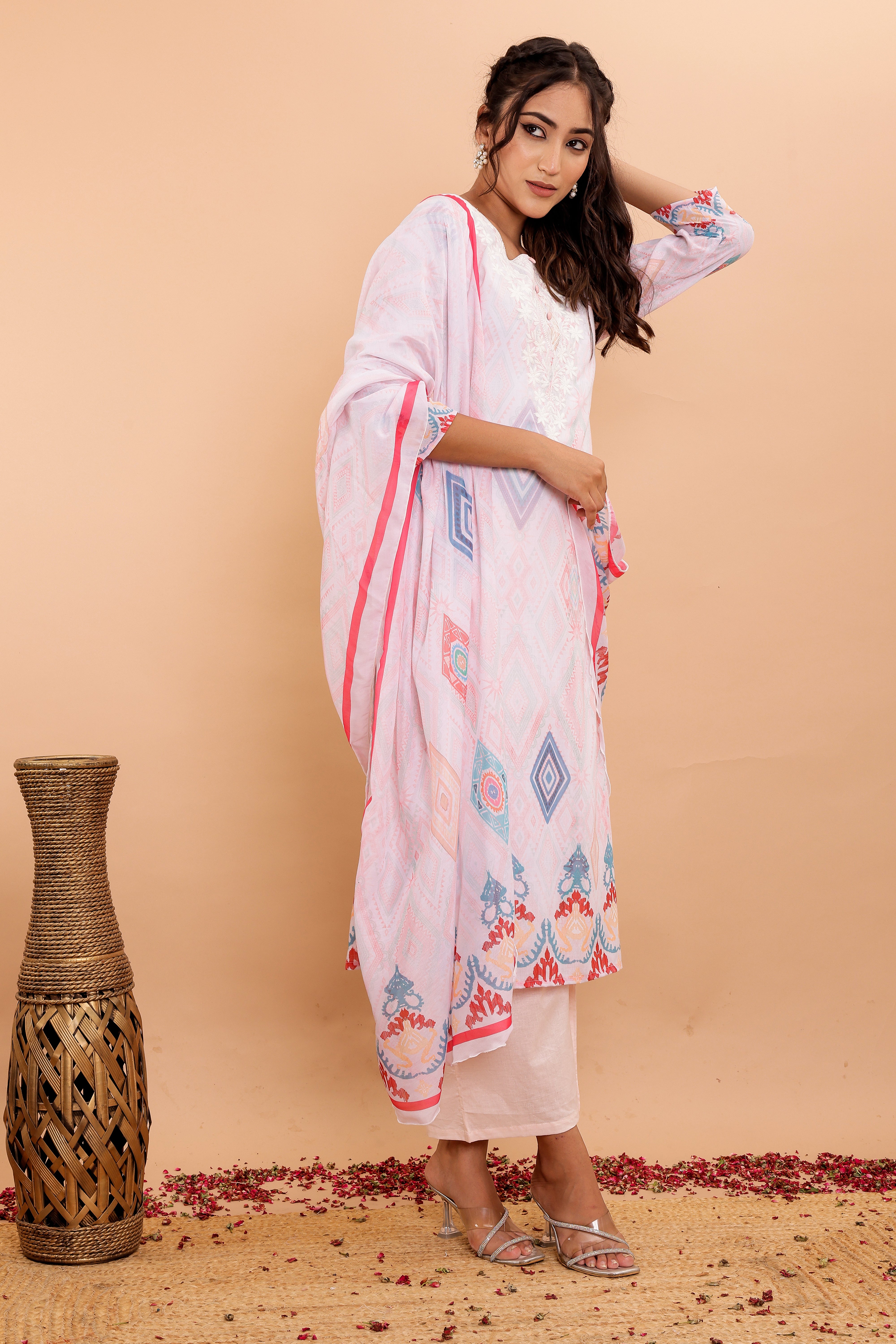 Completing the ensemble, the set includes wide-leg pants for a comfortable and stylish look. The matching digital print dupatta adds a graceful touch. Whether it's a casual day out or a festive occasion, this kurta set is versatile enough for any event.