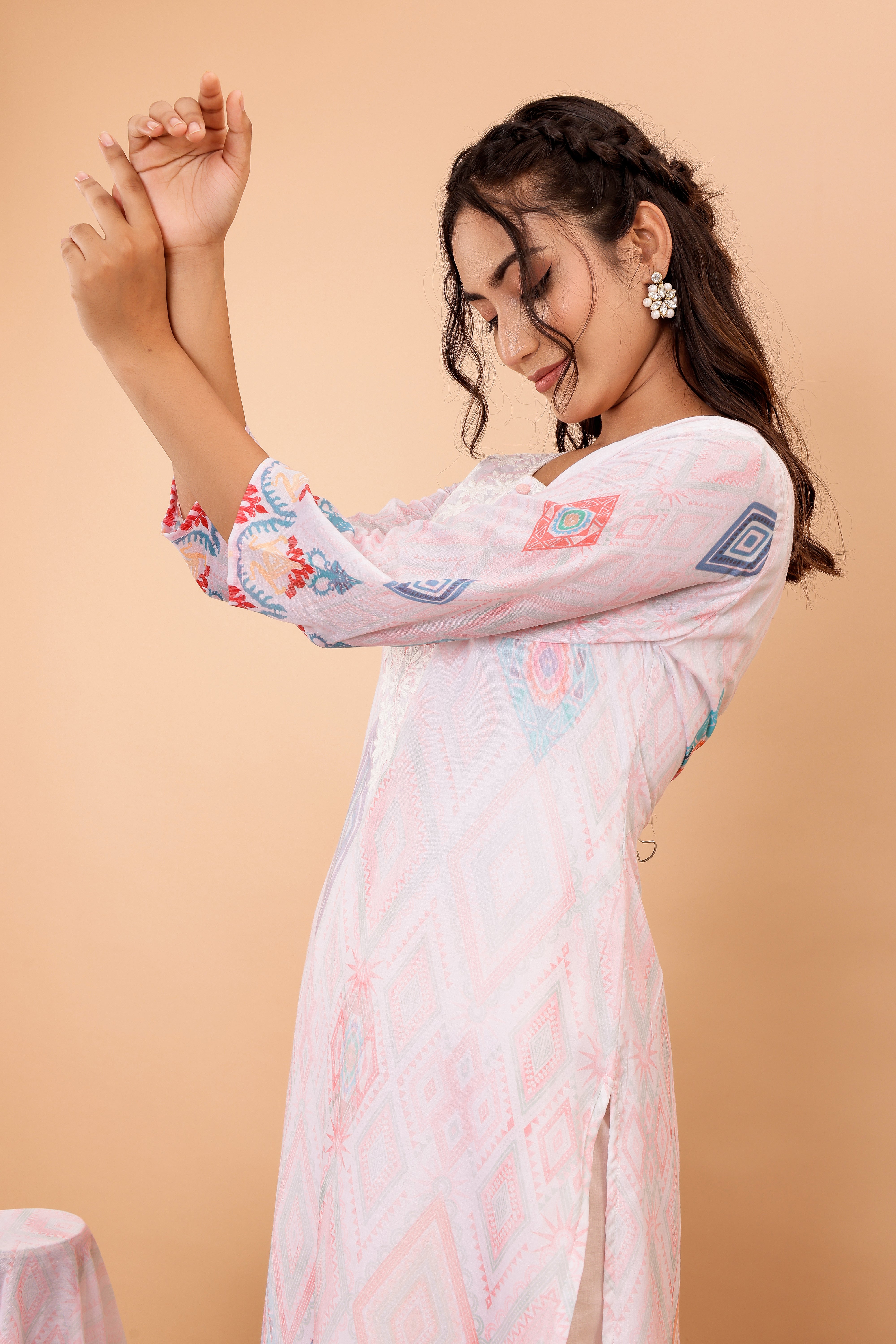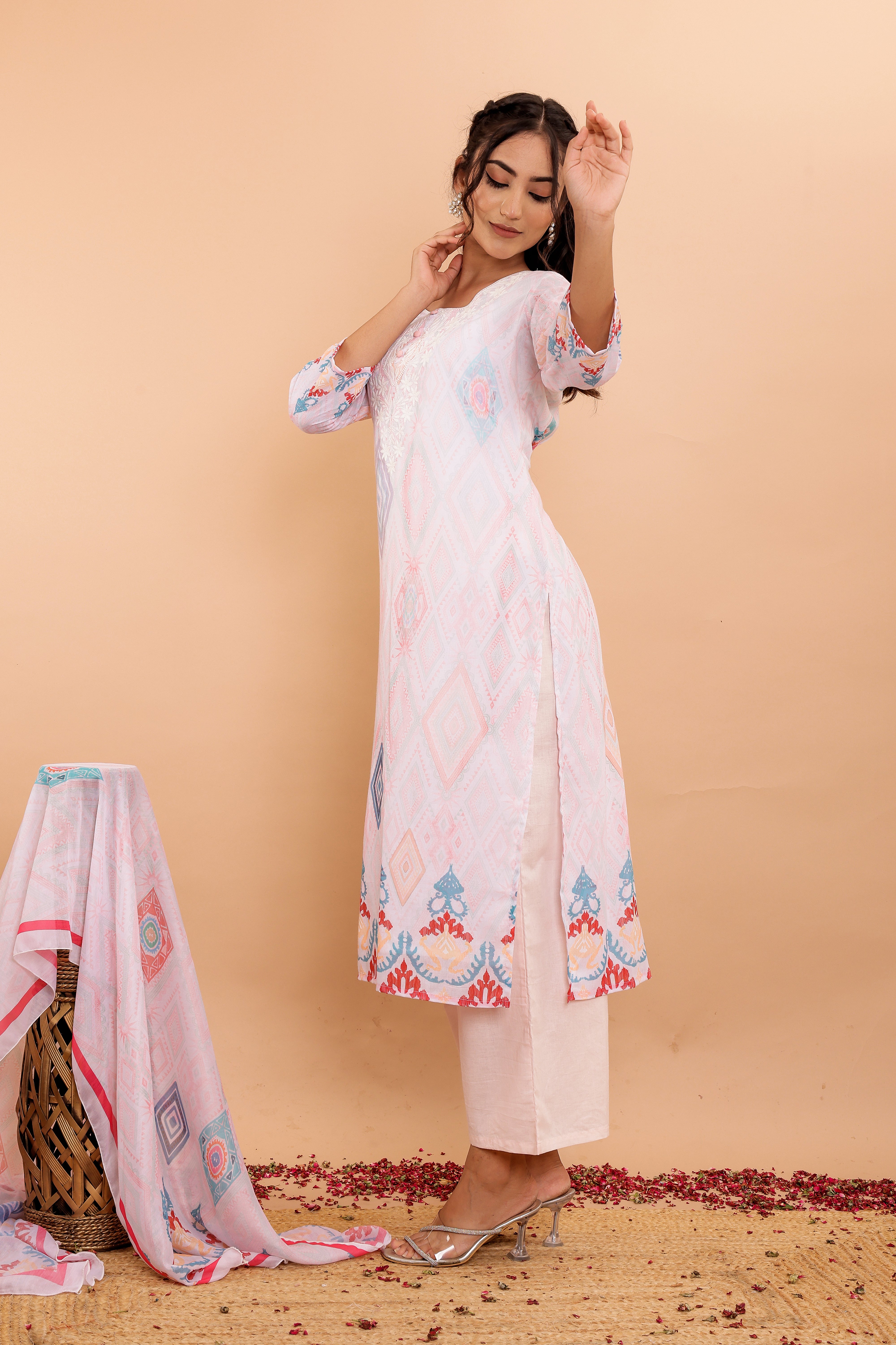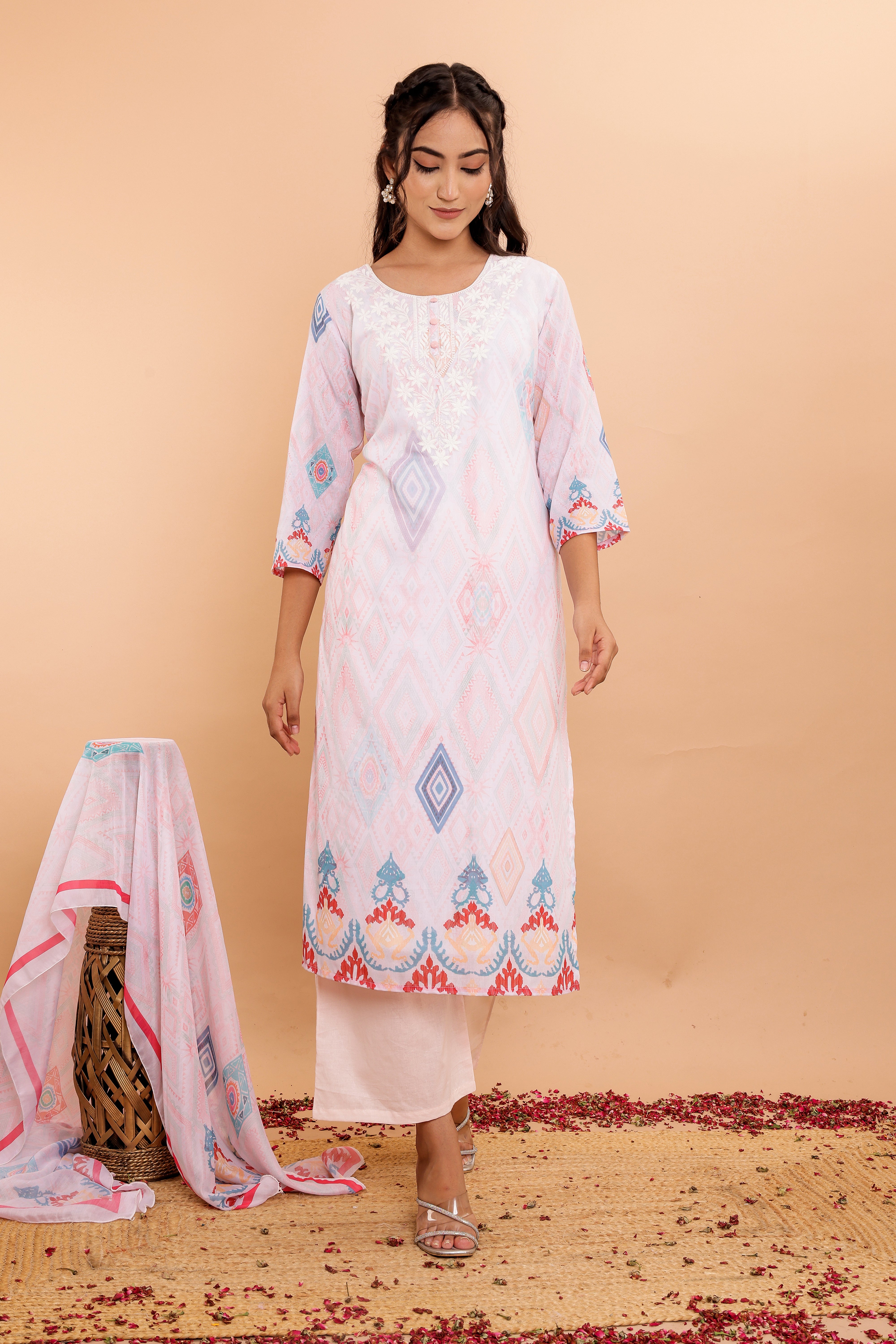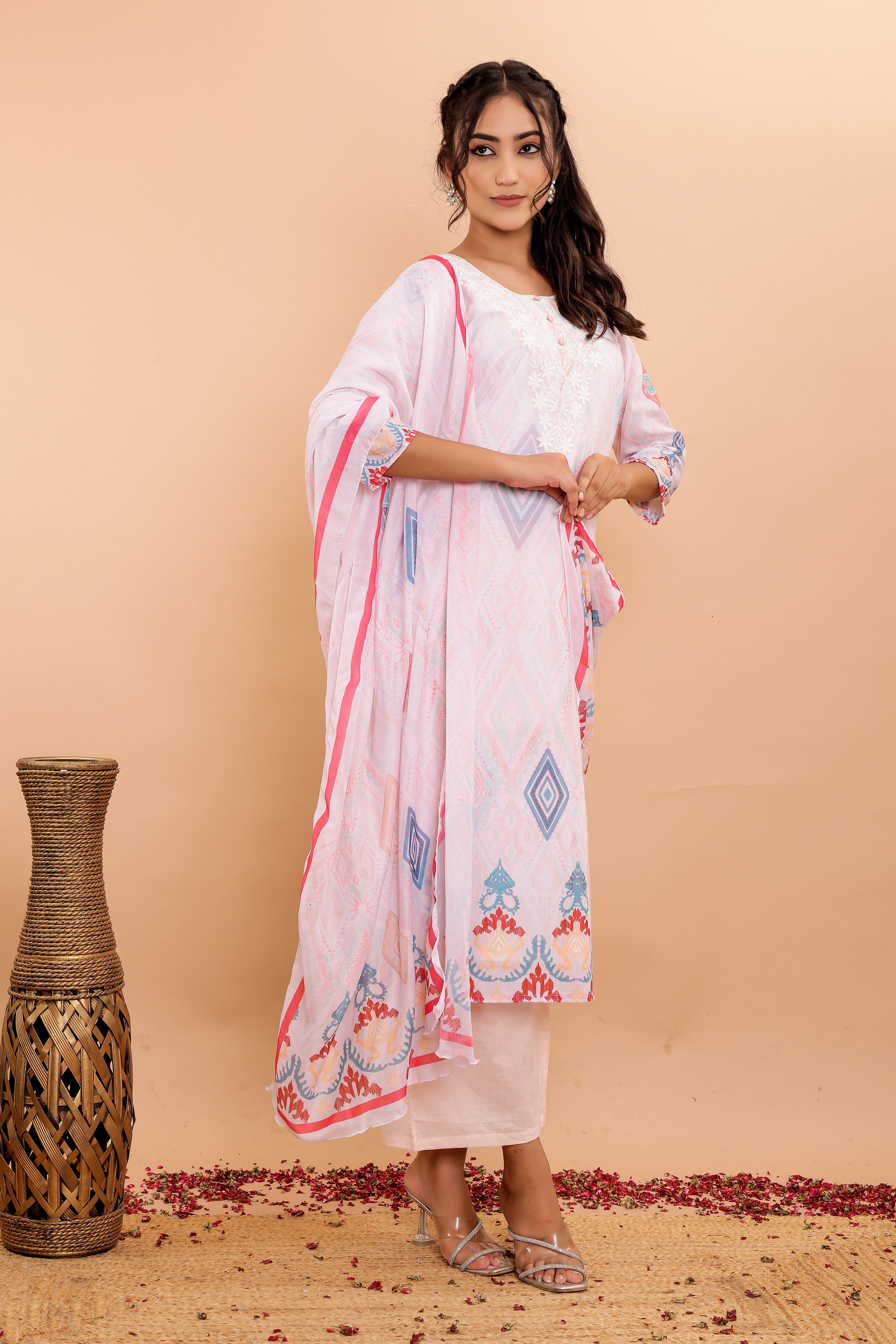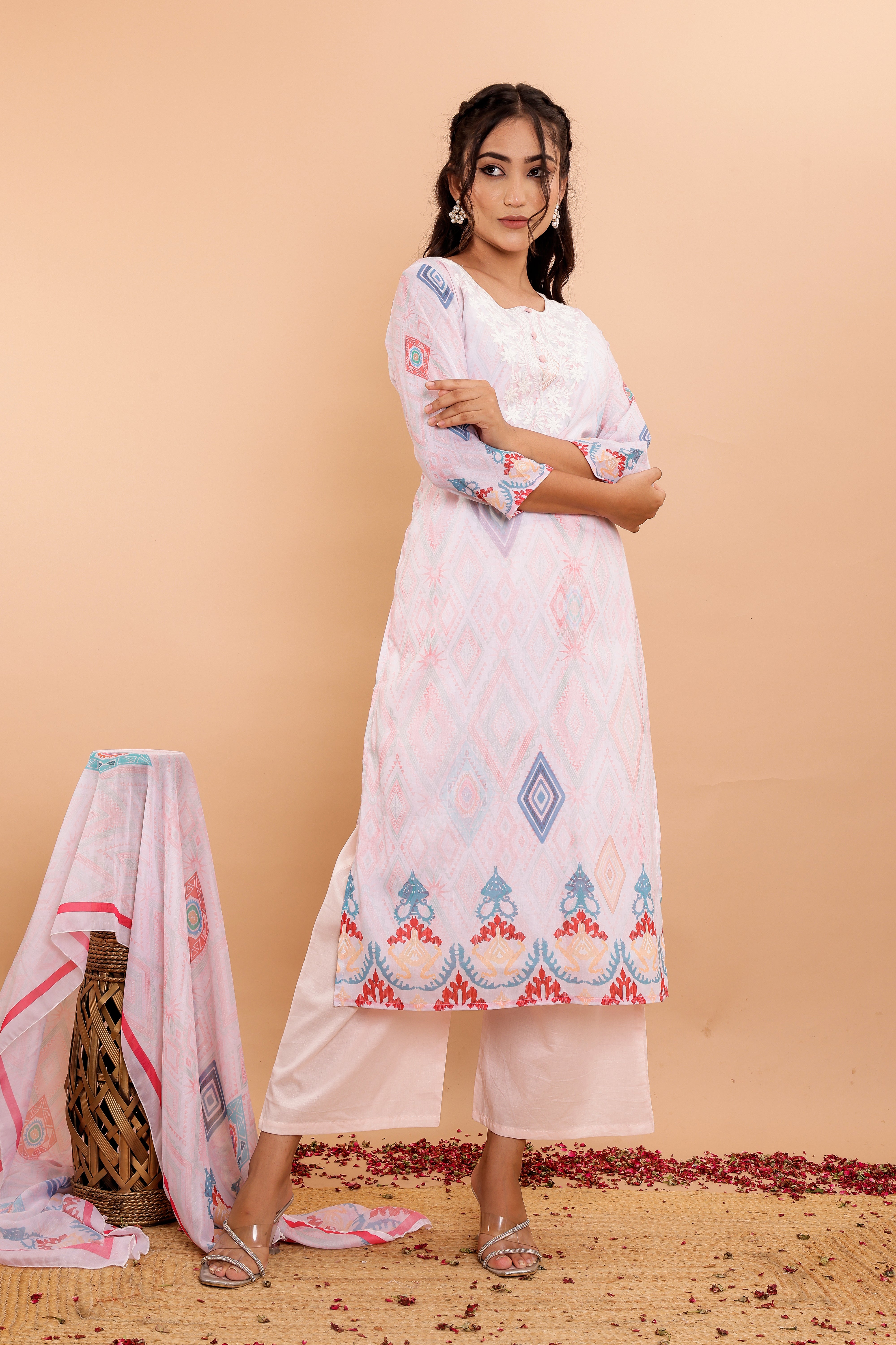 Completing the ensemble, the set includes wide-leg pants for a comfortable and stylish look. The matching digital print dupatta adds a graceful touch. Whether it's a casual day out or a festive occasion, this kurta set is versatile enough for any event.