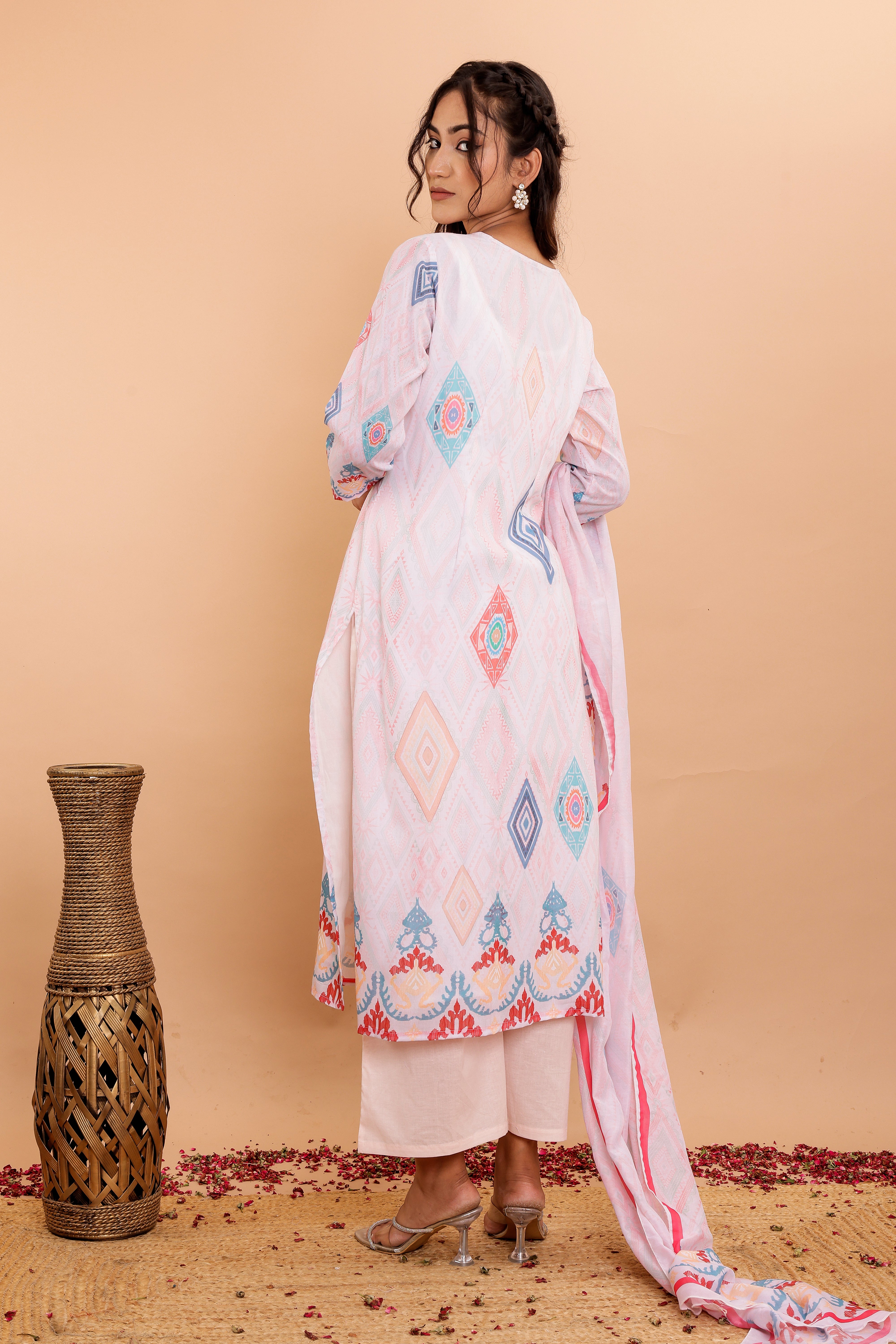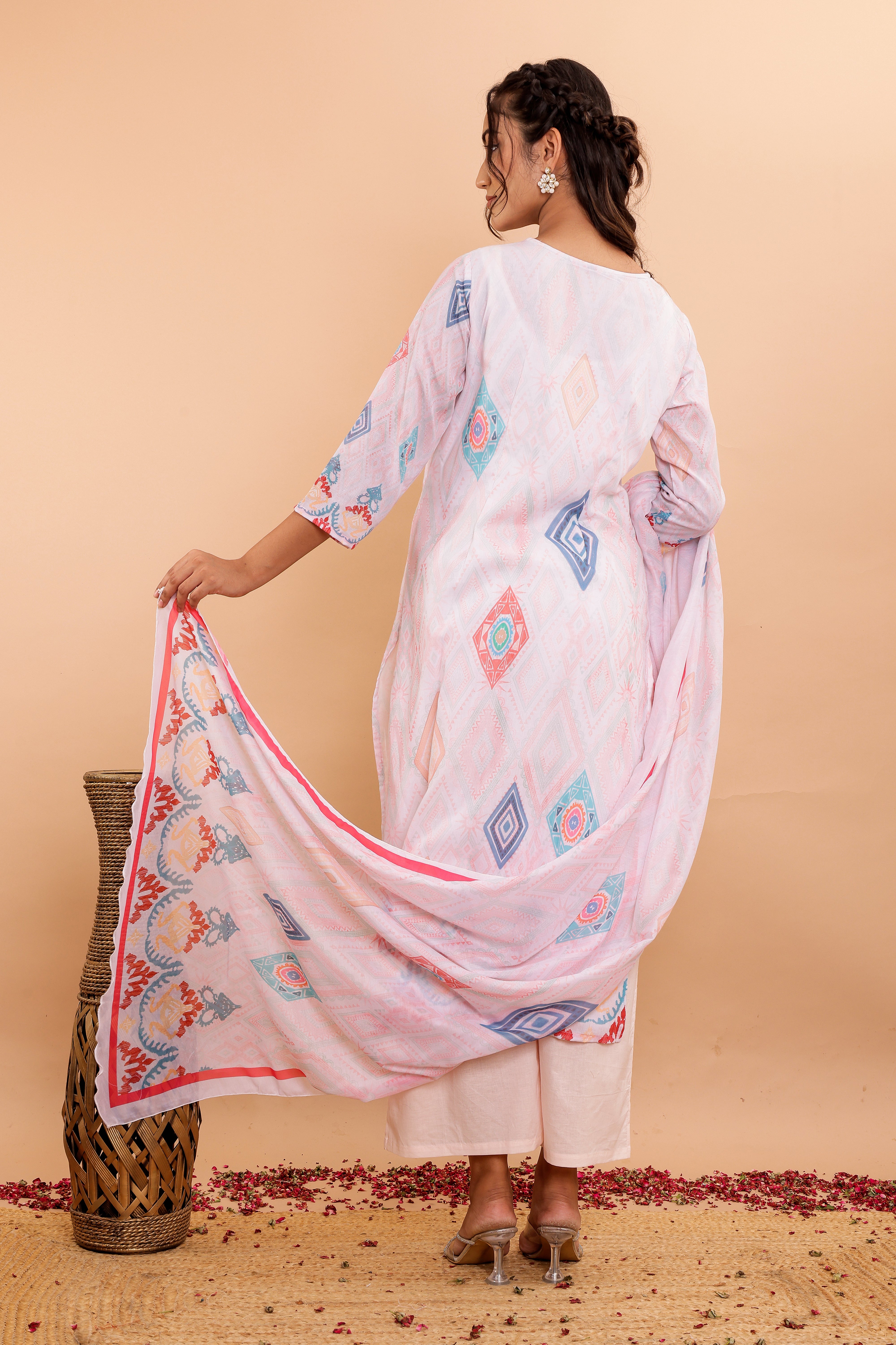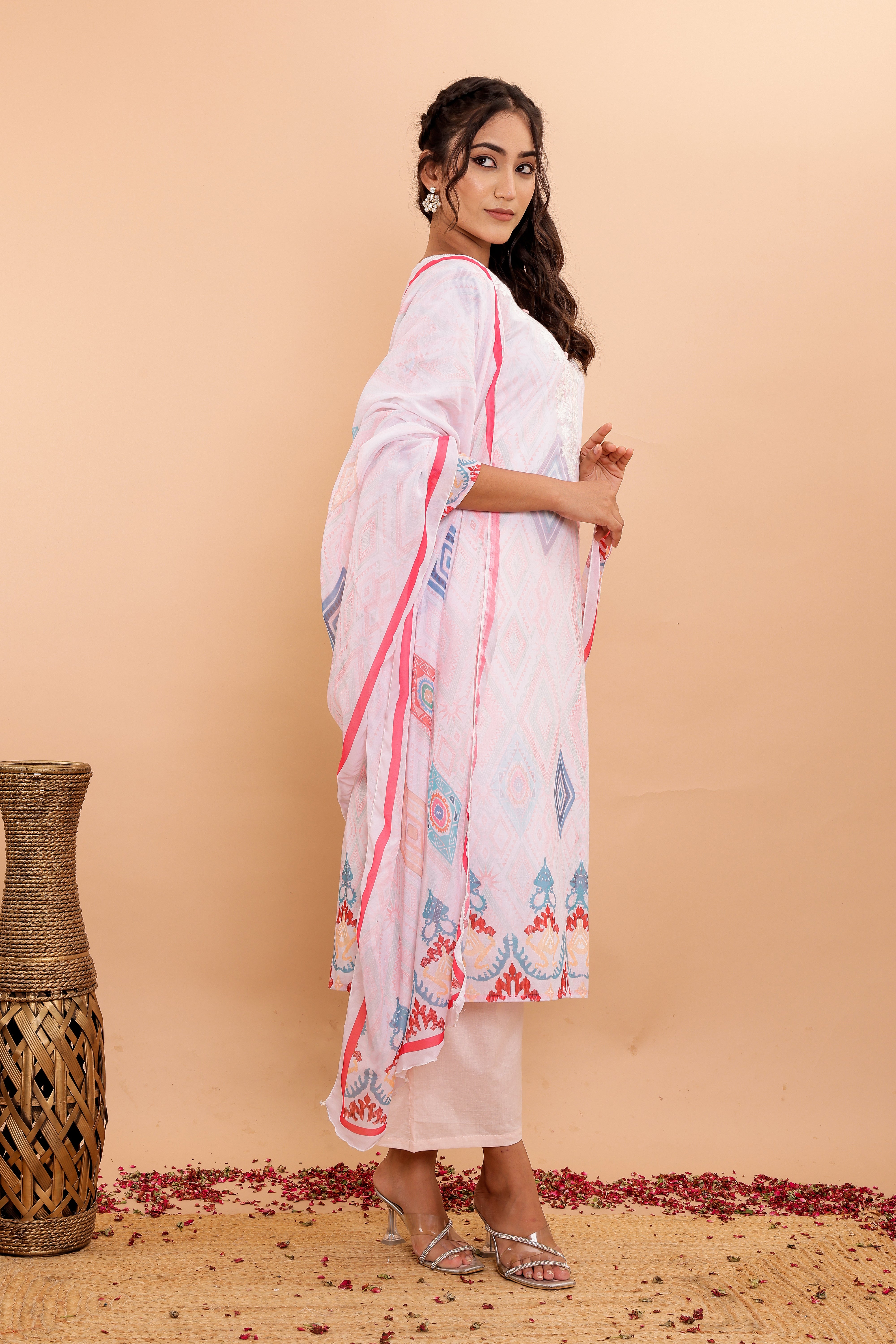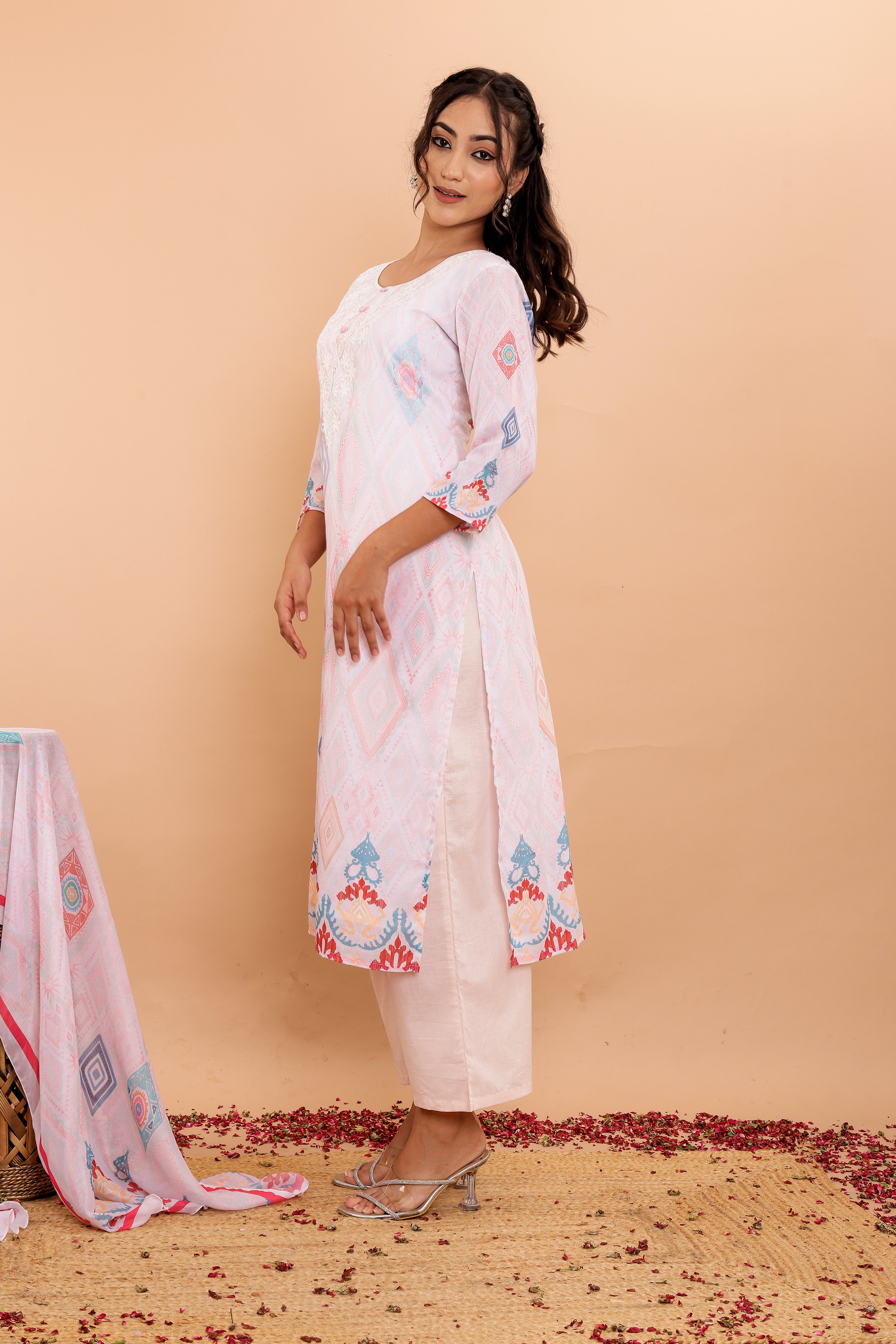 Completing the ensemble, the set includes wide-leg pants for a comfortable and stylish look. The matching digital print dupatta adds a graceful touch. Whether it's a casual day out or a festive occasion, this kurta set is versatile enough for any event.