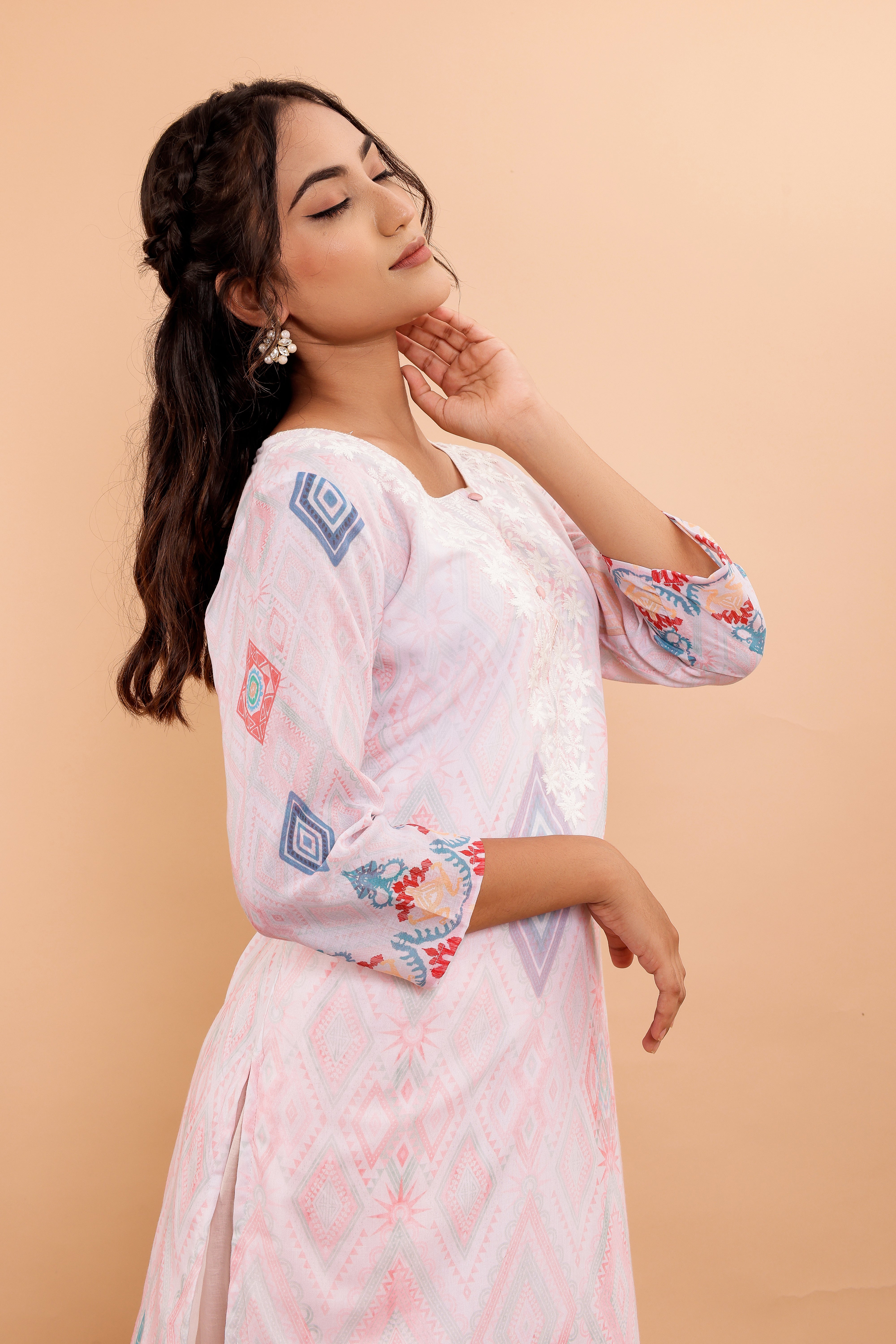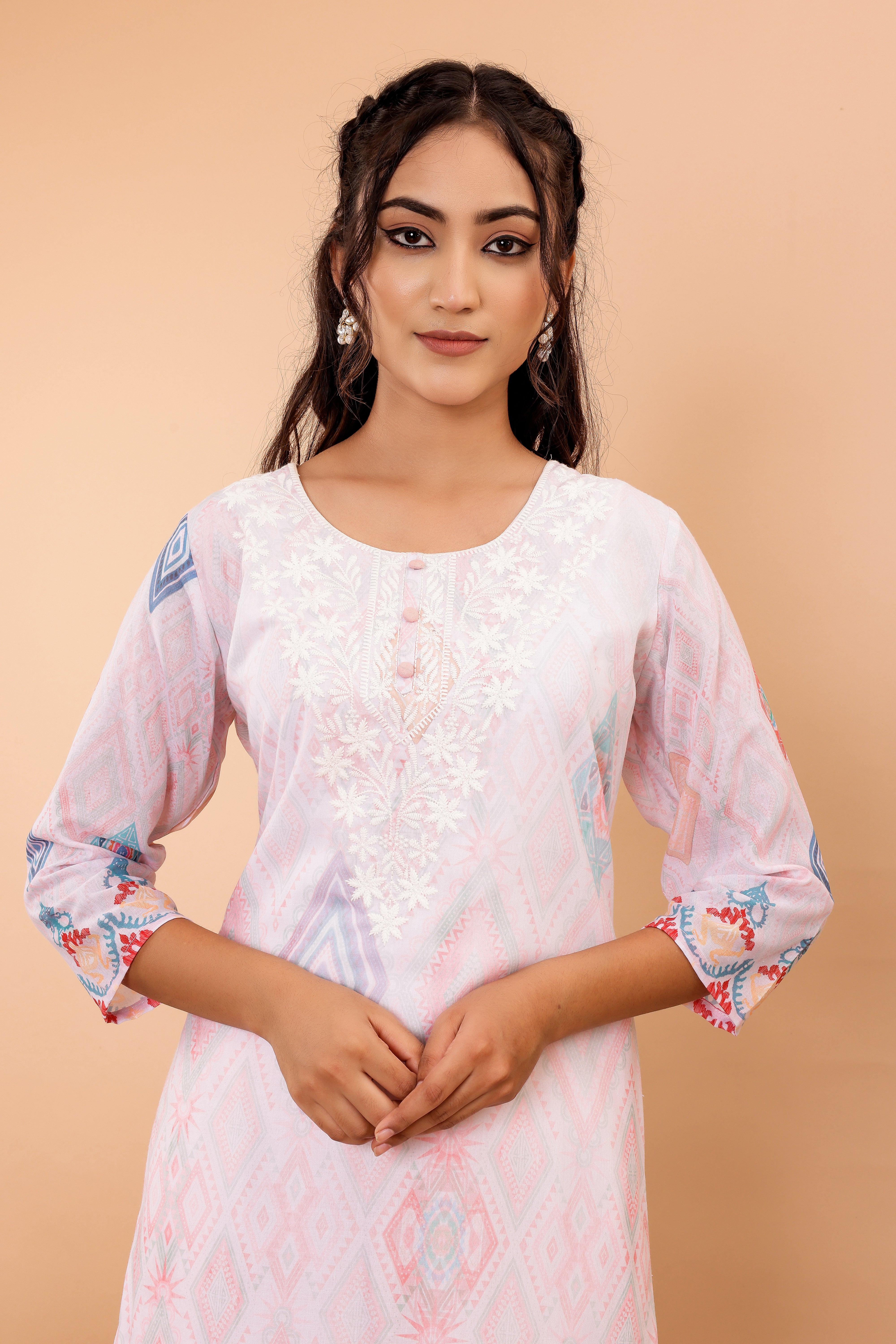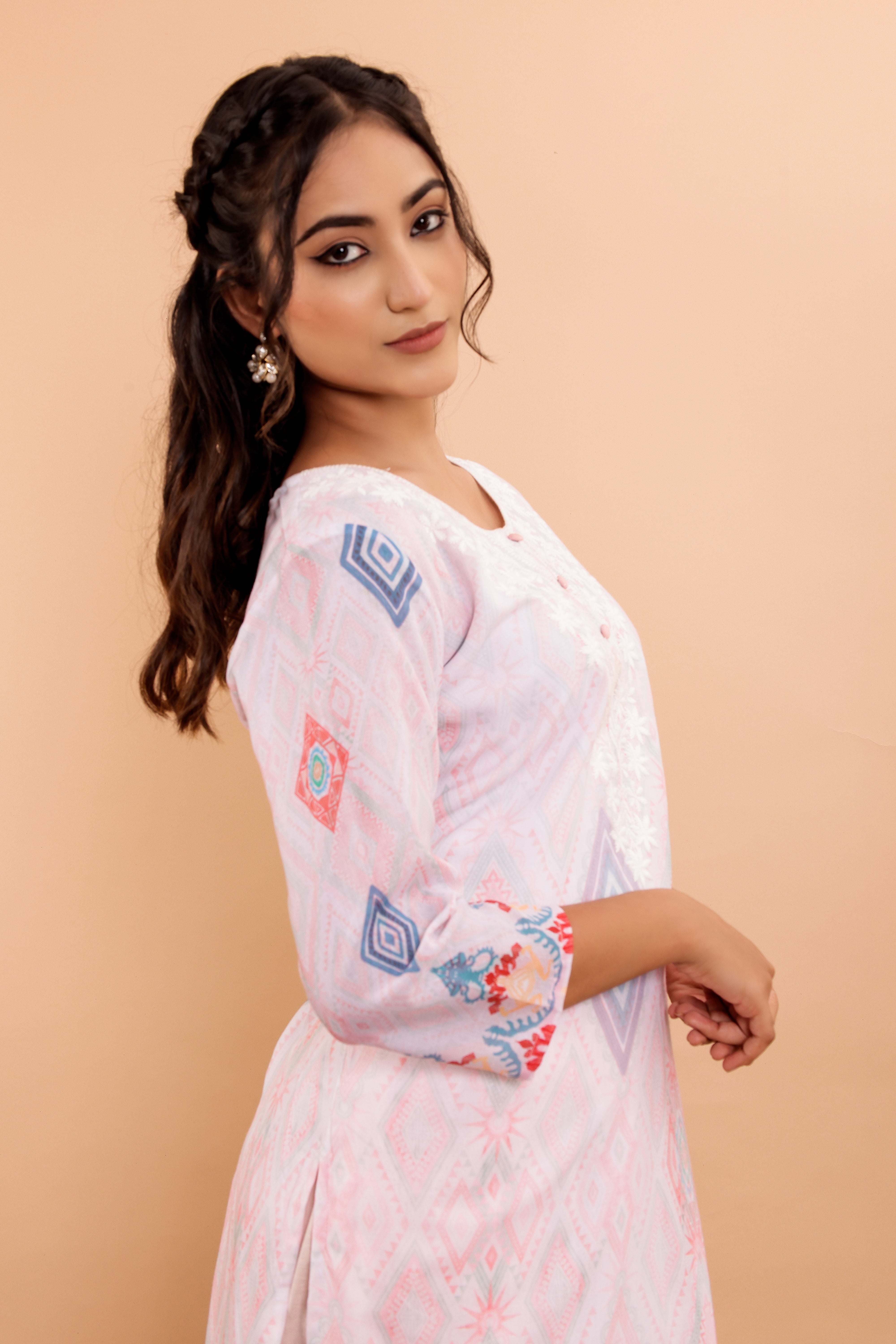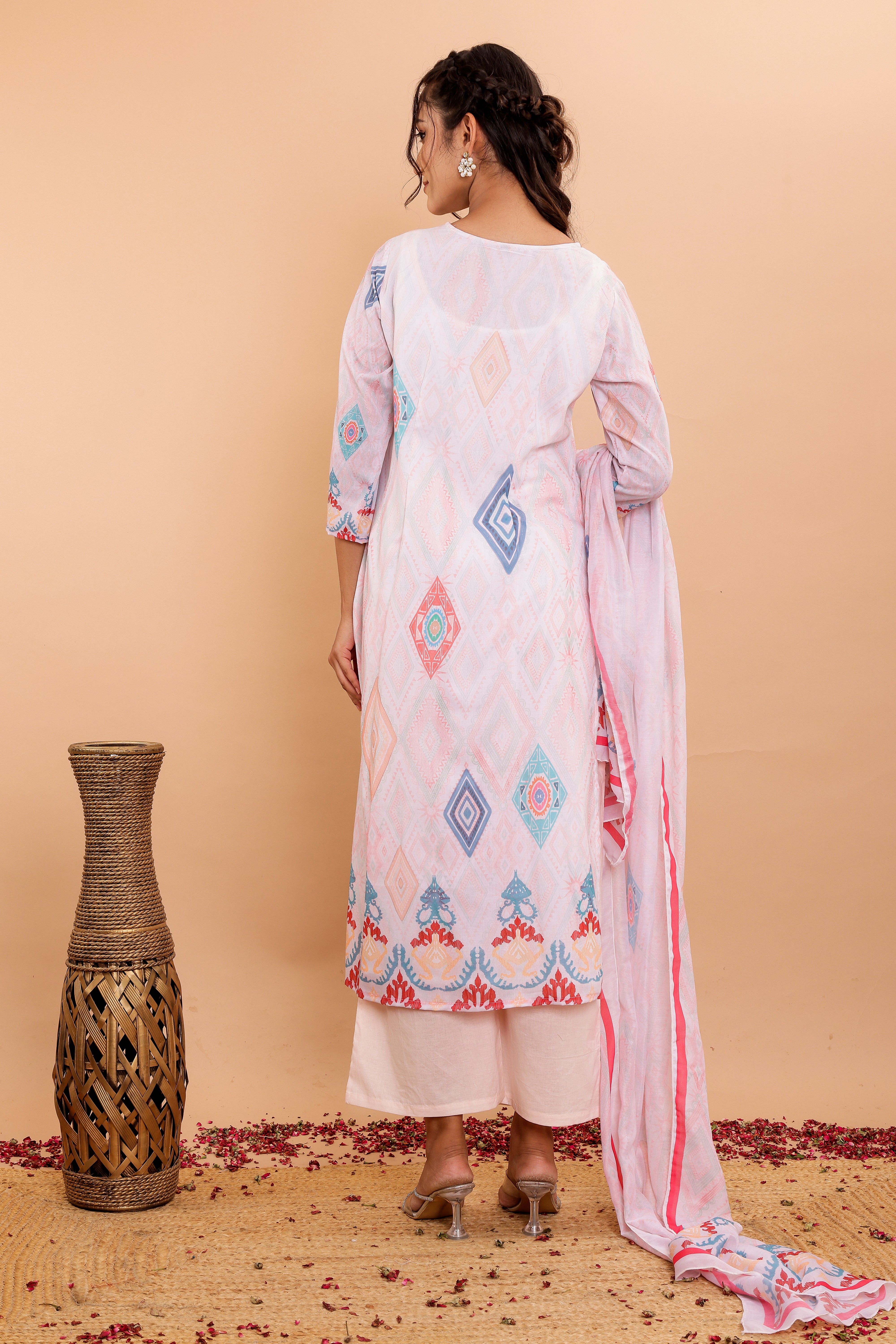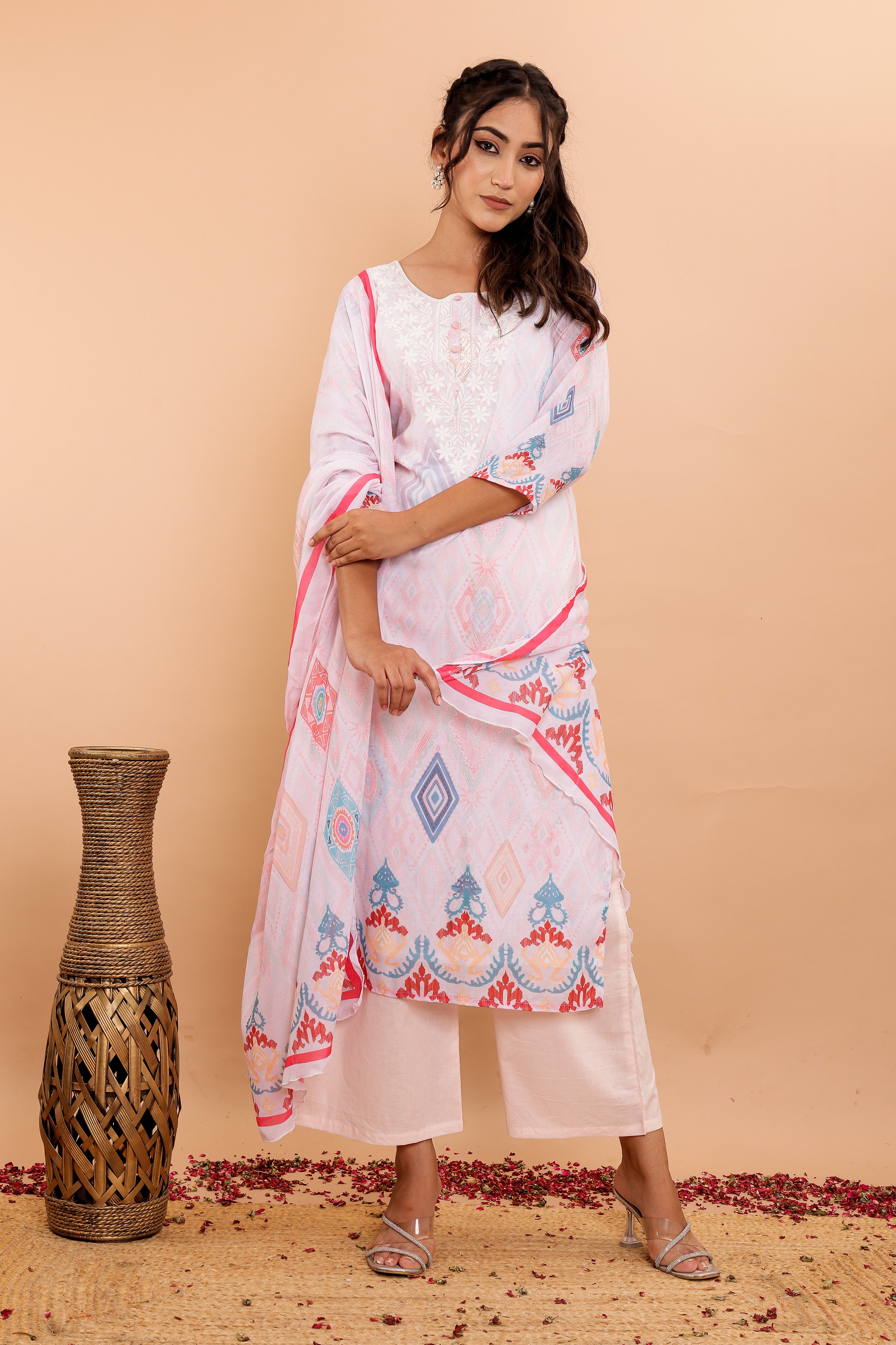 Completing the ensemble, the set includes wide-leg pants for a comfortable and stylish look. The matching digital print dupatta adds a graceful touch. Whether it's a casual day out or a festive occasion, this kurta set is versatile enough for any event.