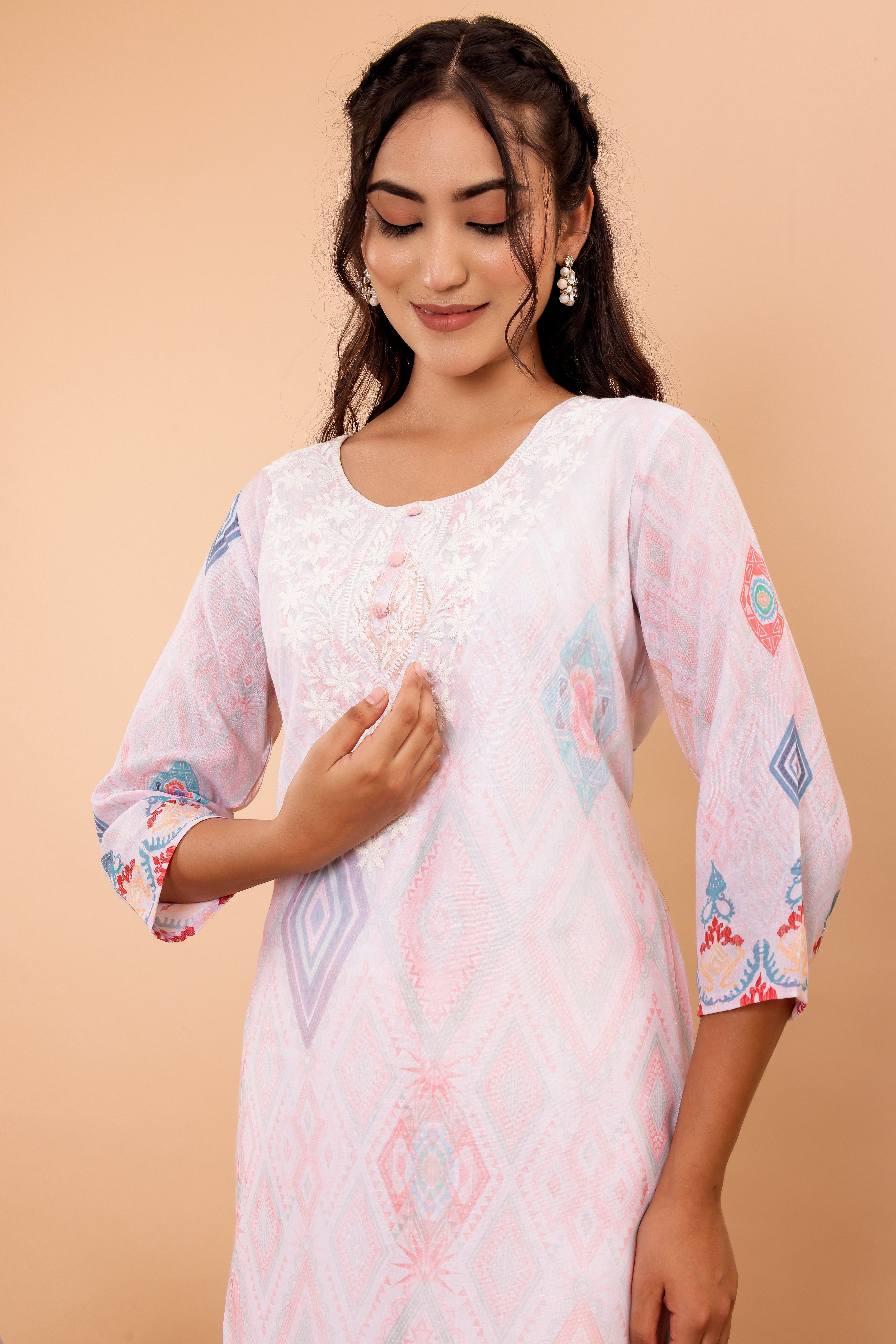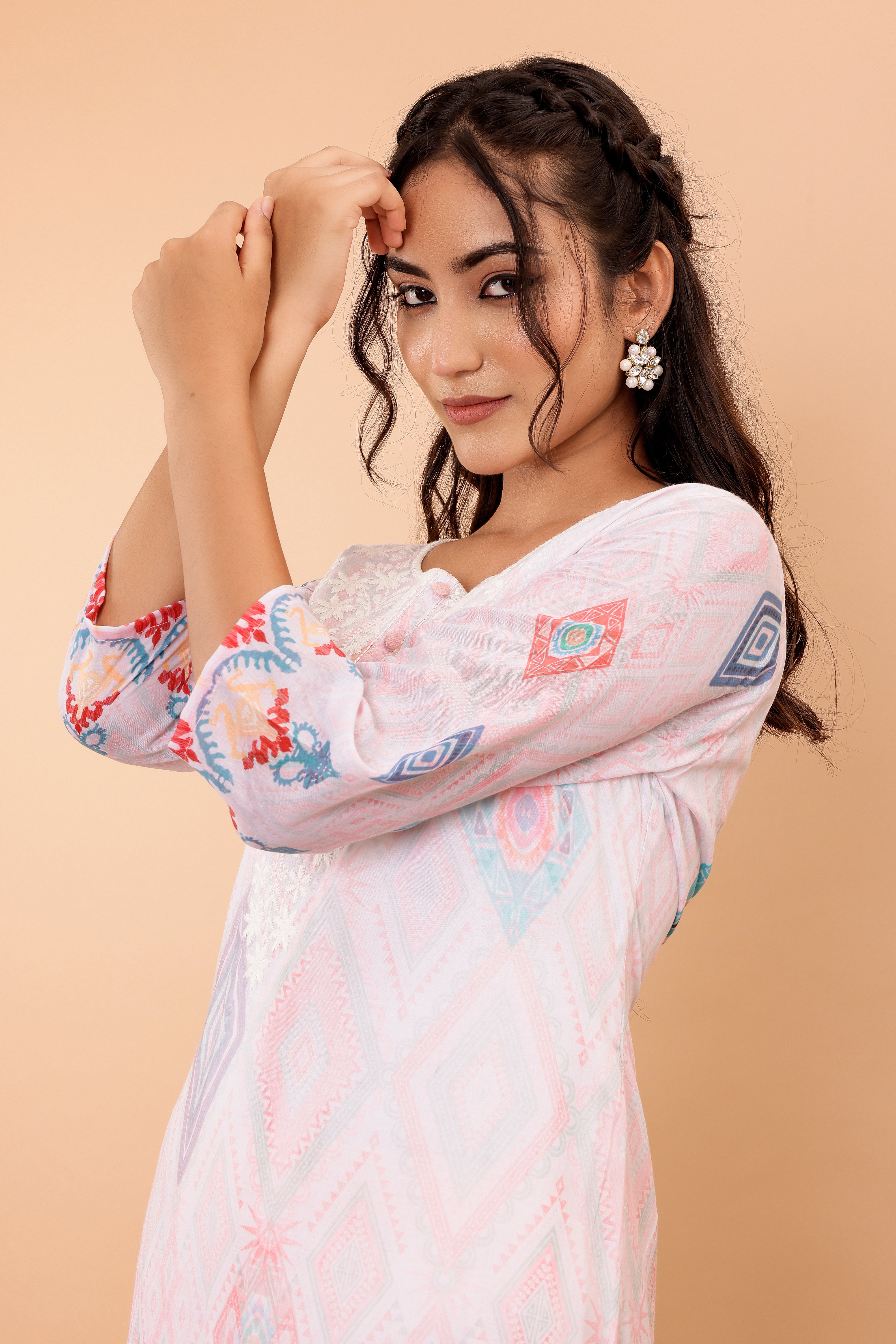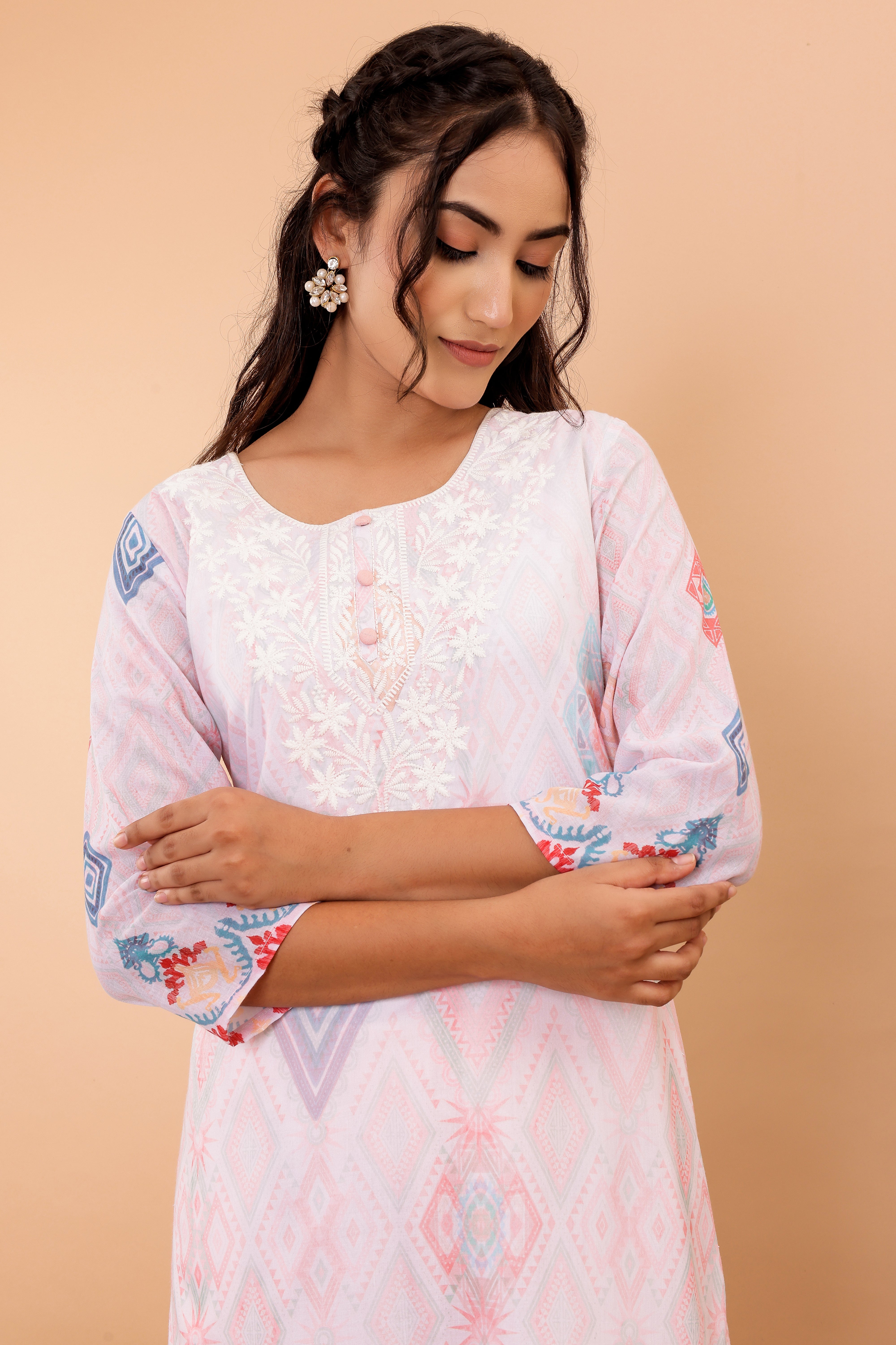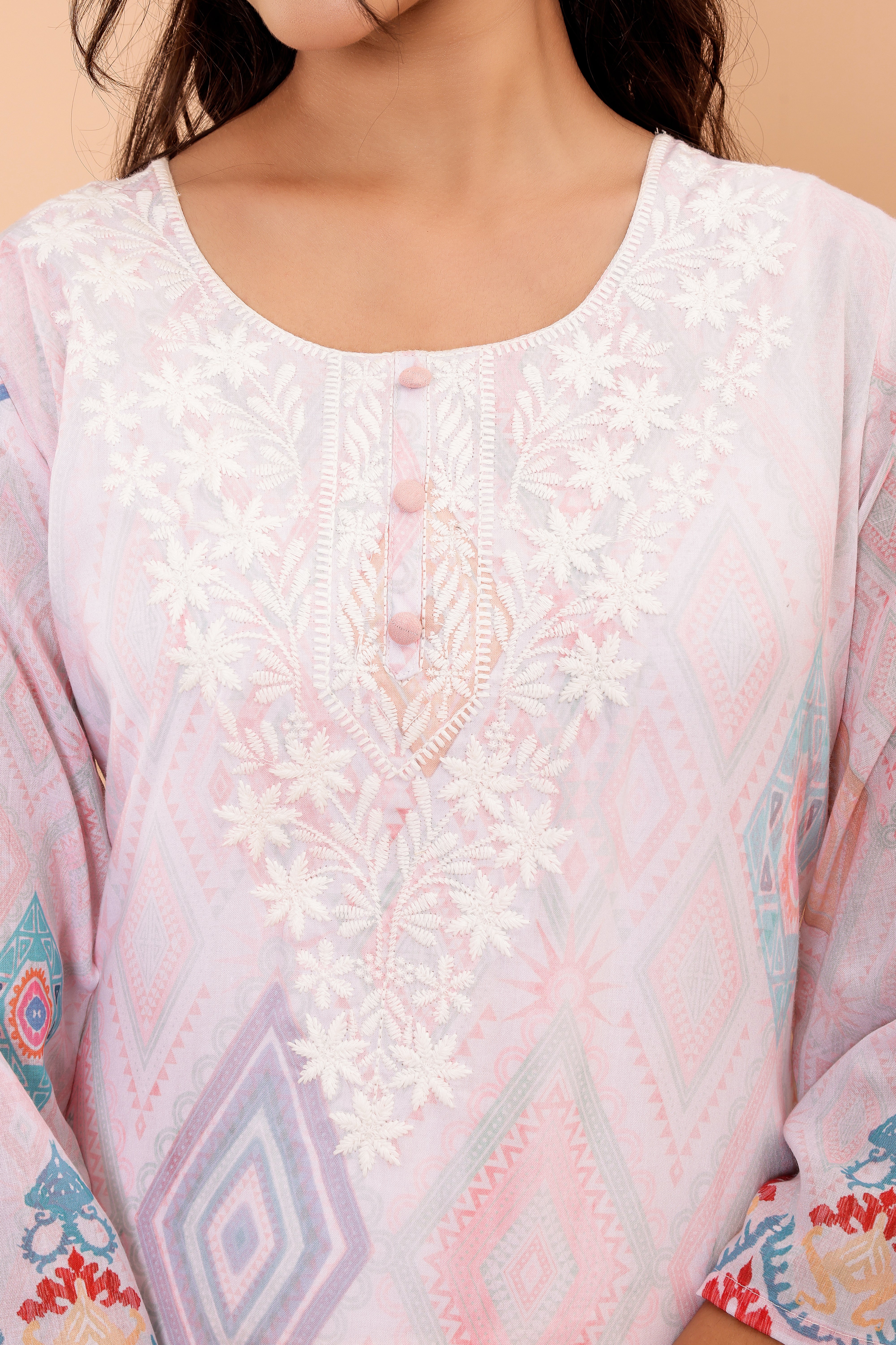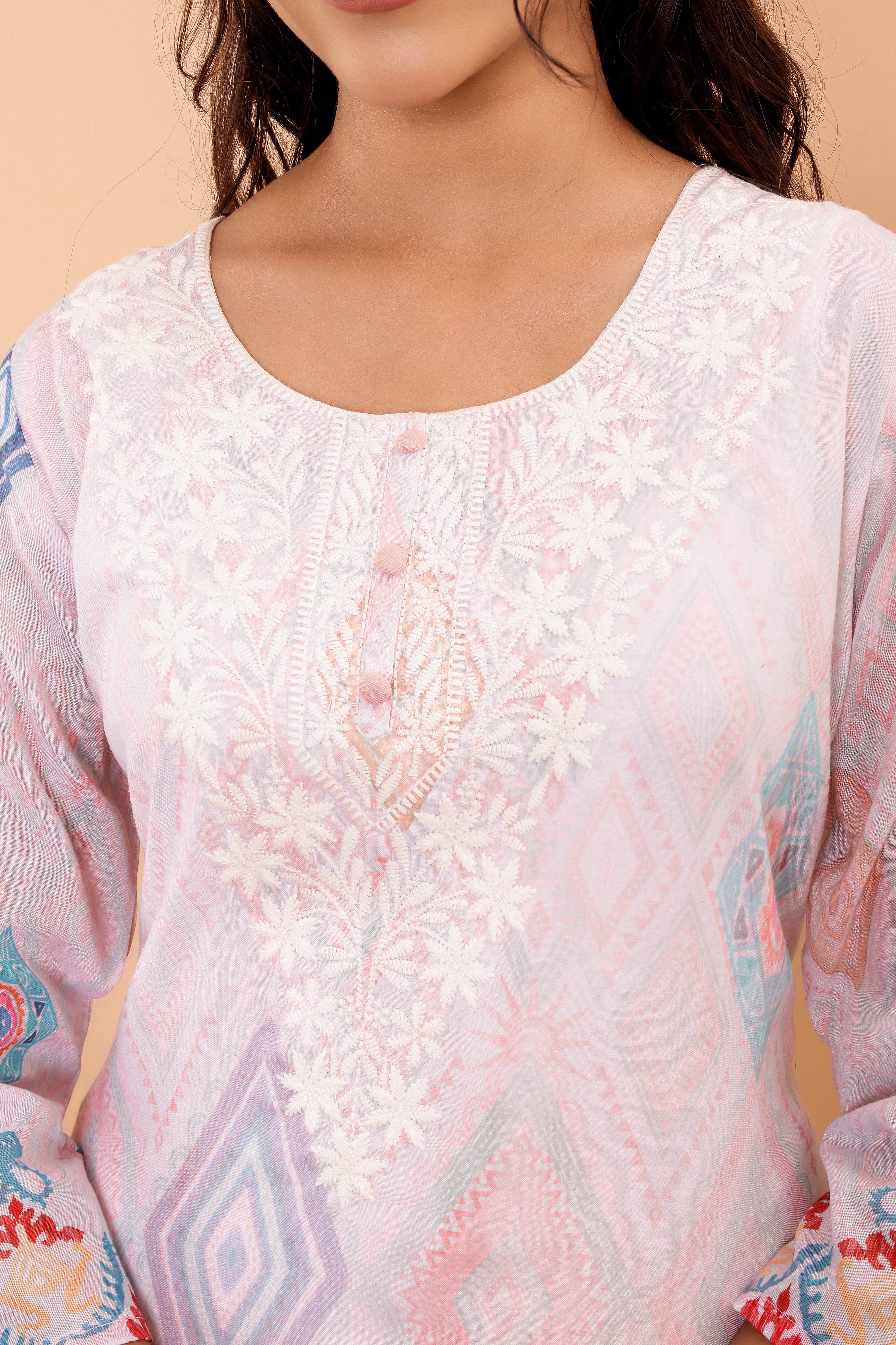 Delicate embroidery adorns the yoke, adding a touch of sophistication to the simple design. The vibrant digital print brings a modern twist to the traditional fabric.